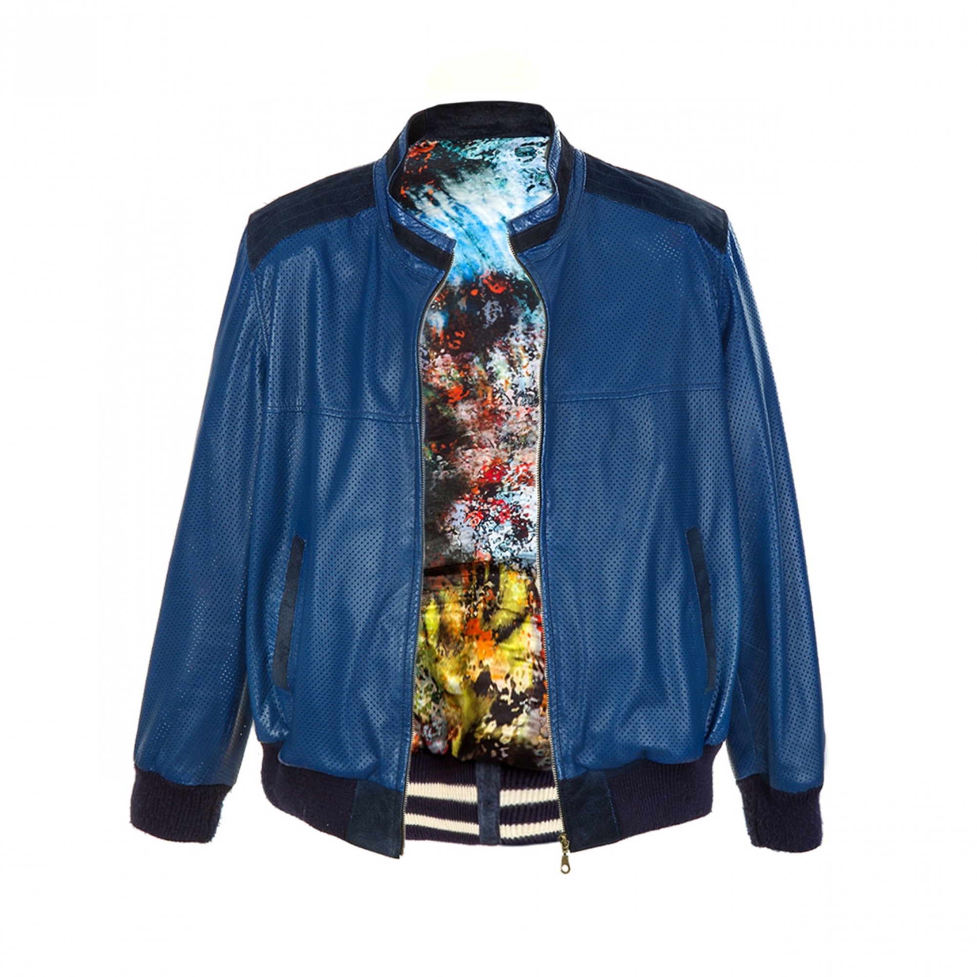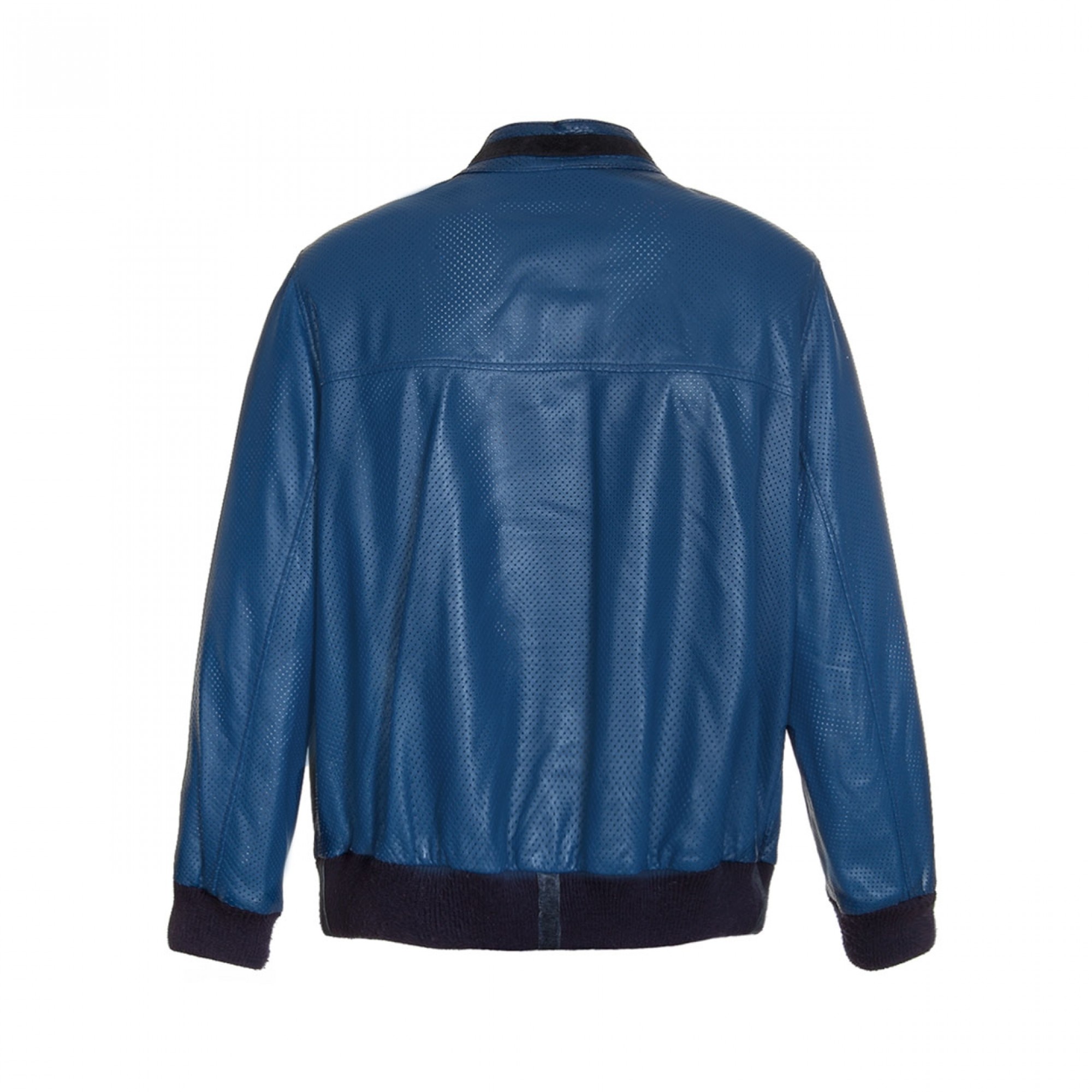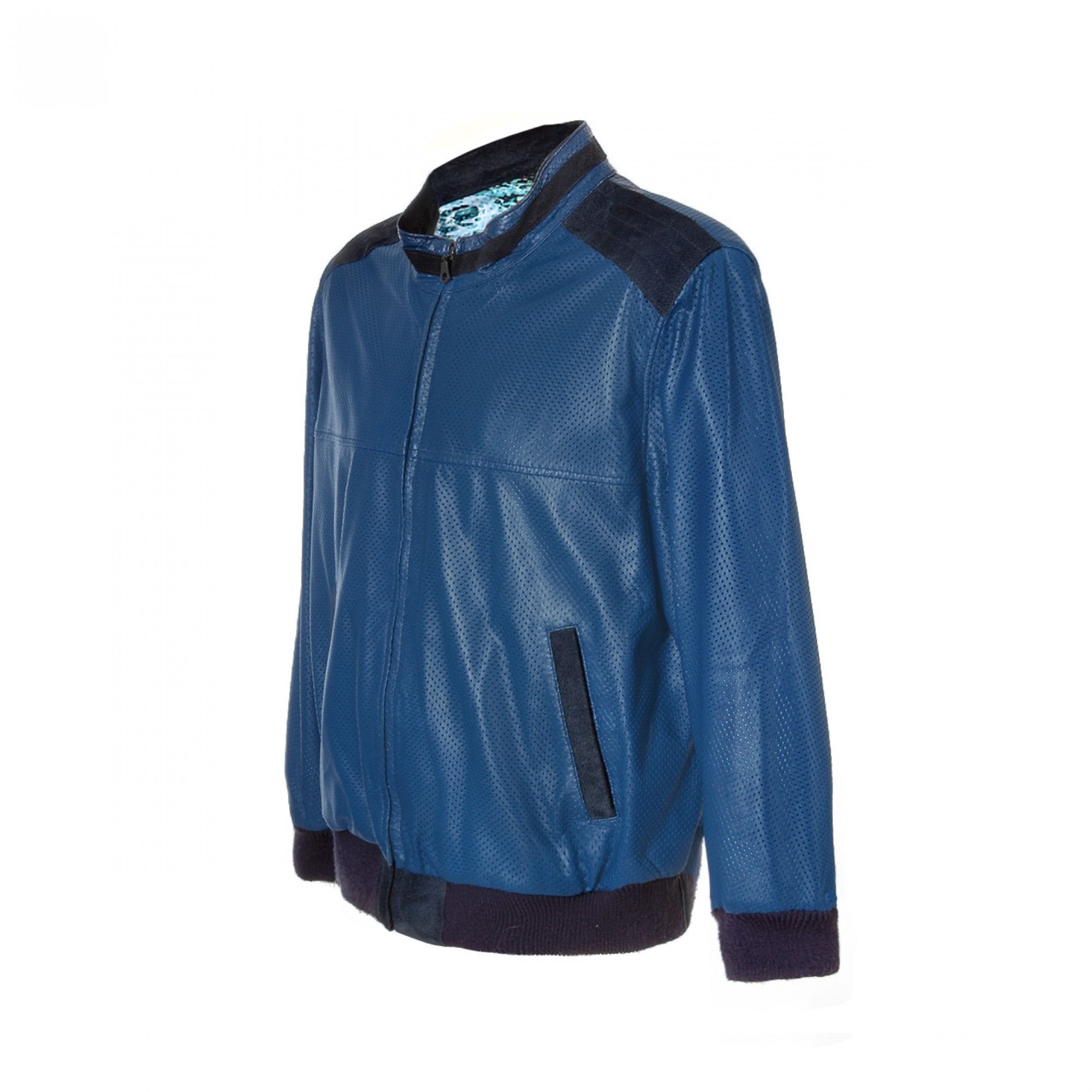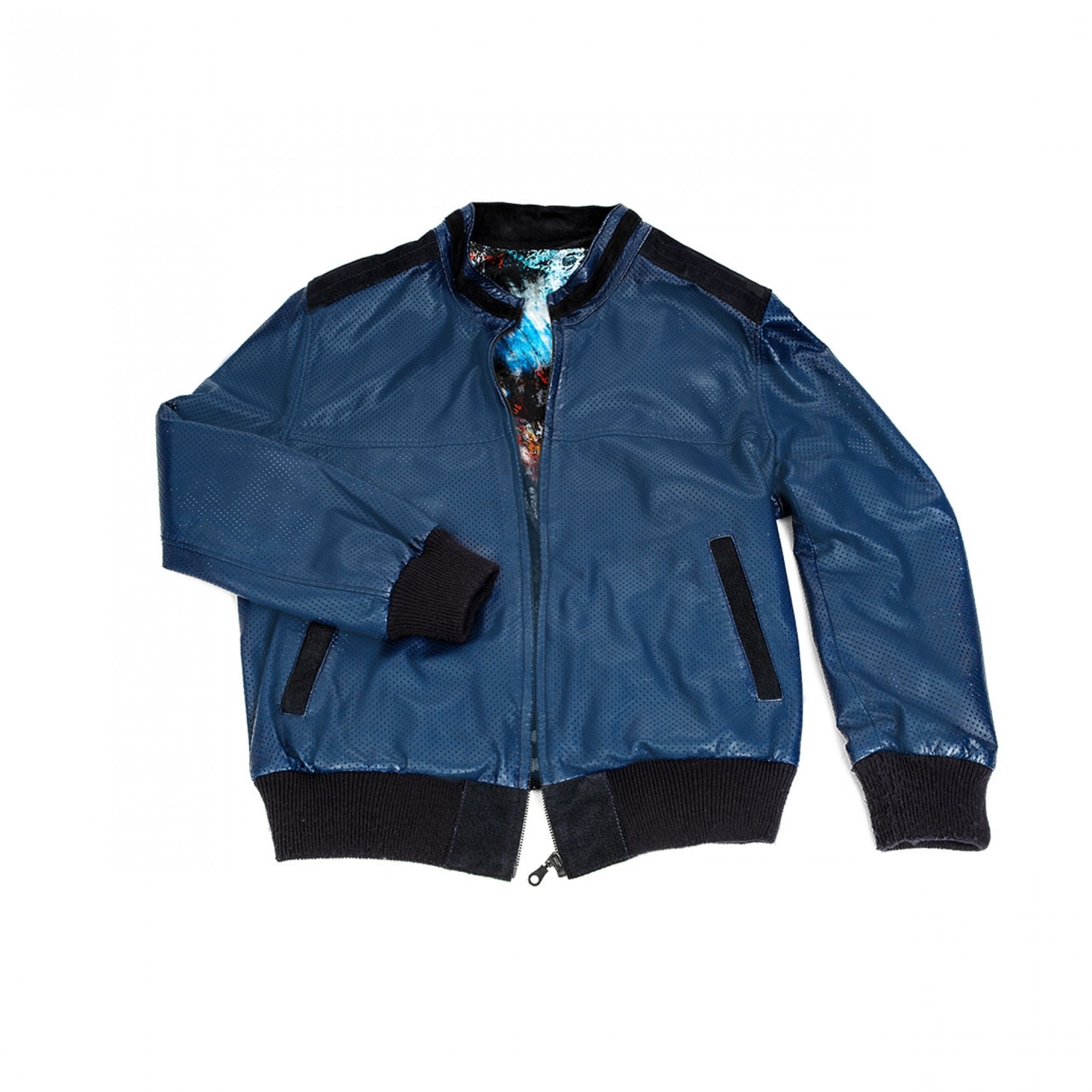 Chic casual: the GuidoMaggi Kent jacket is a handmade creation in blue calfskin and reindeer suede details on shoulders, collar and pockets. Central zippered closure. Dark blue ribbed knit collar and cuffs and customizable silk inner lining. Kent is the perfect fusion of classic timeless and modernity that distinguish the style of GuidoMaggi. Handcrafted in Italy.