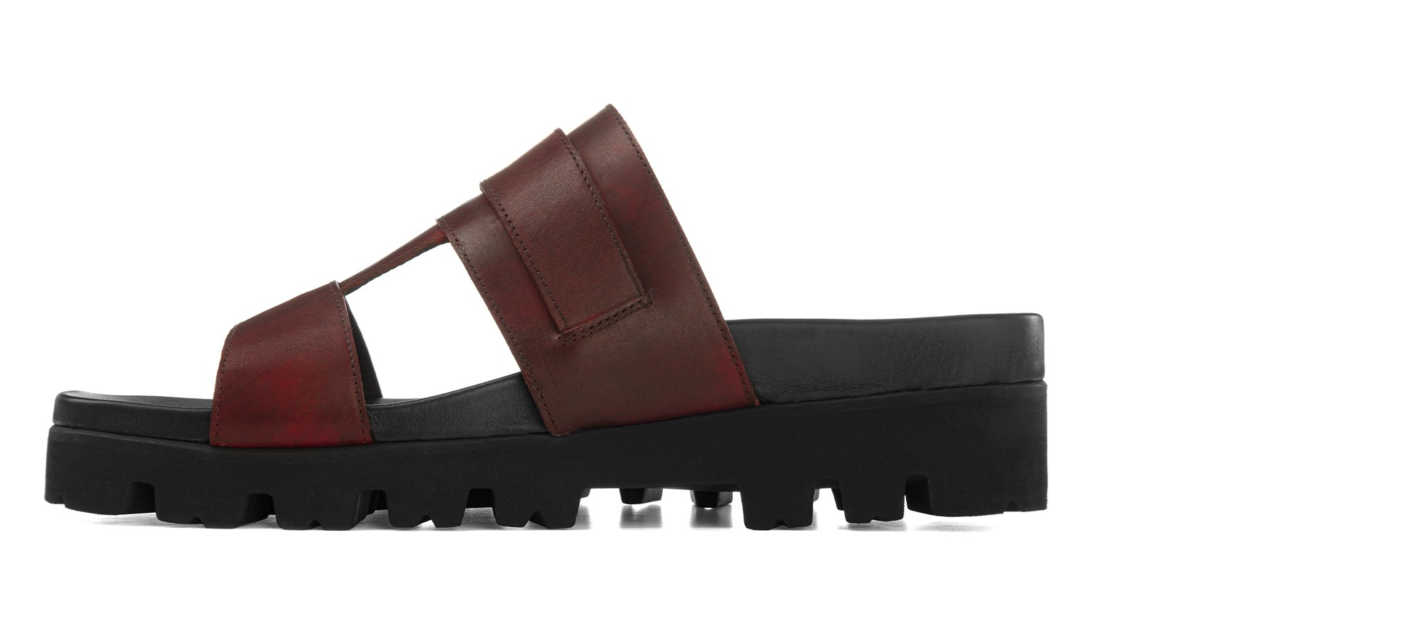 Height increase sandal, with super light black sole and cushioned footbed, equipped with an elevator system that gives up to 5 centimeters more in height. Arabesque silhouette for the upper in full-grain leather, with a seductive burgundy colour.