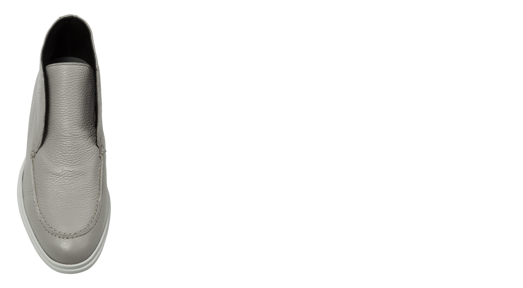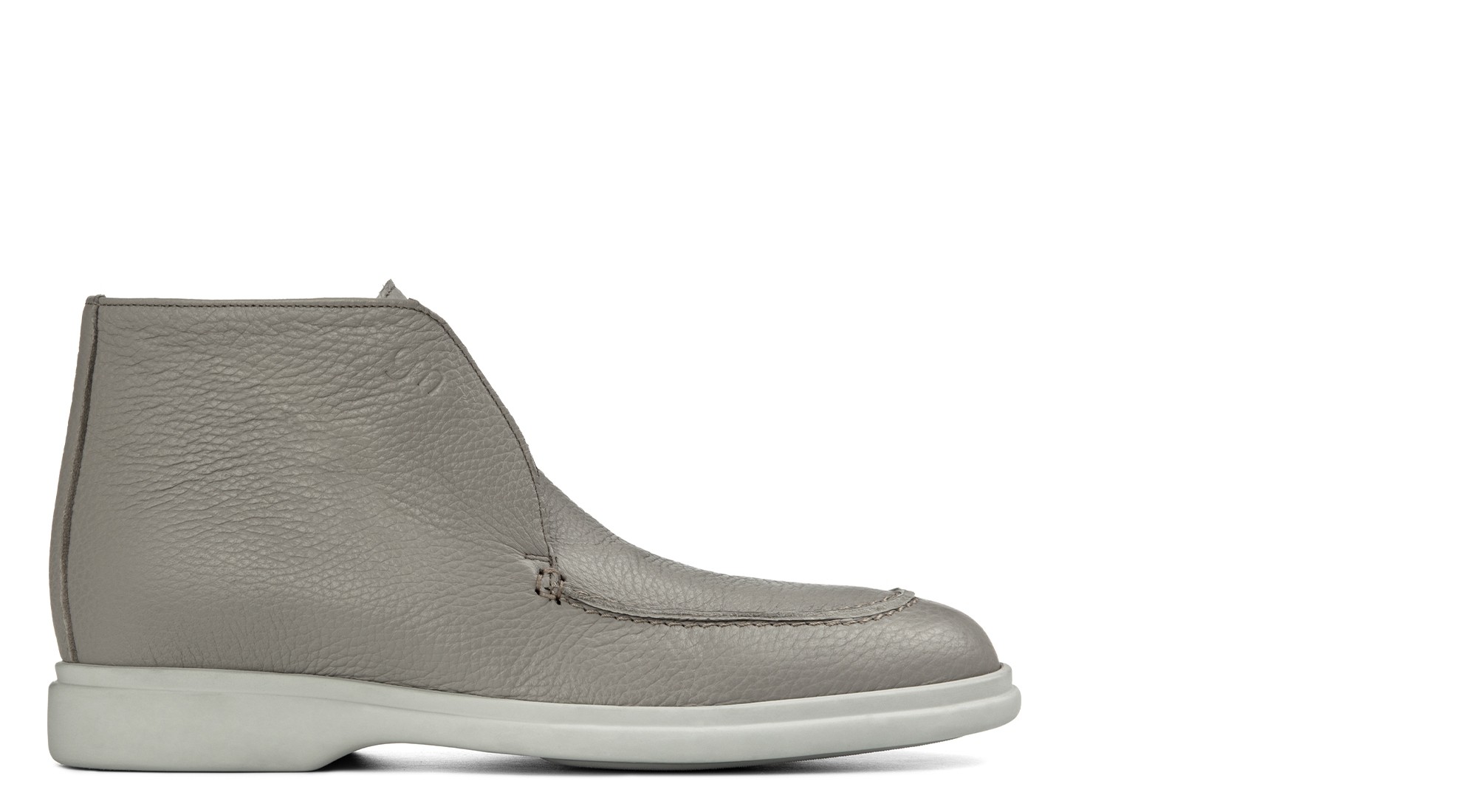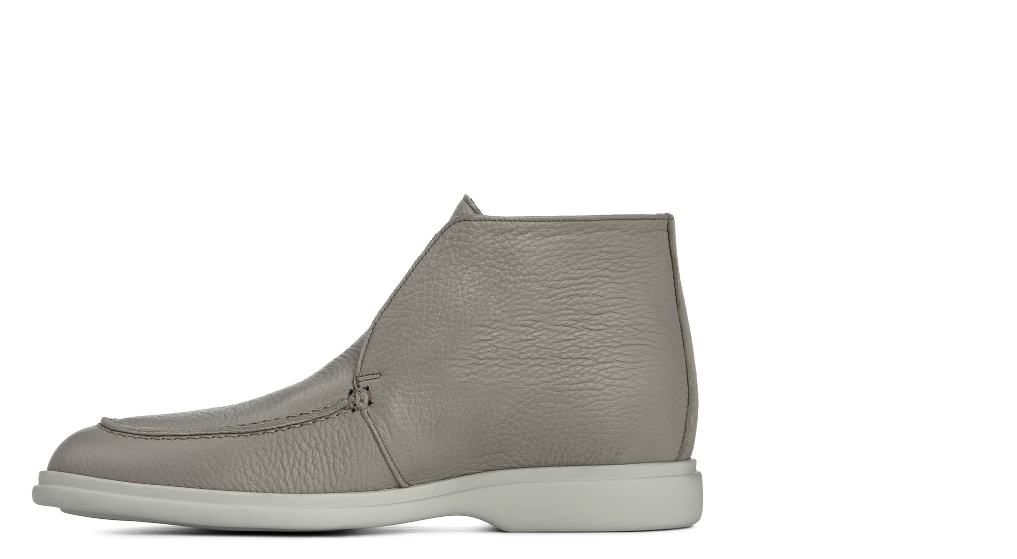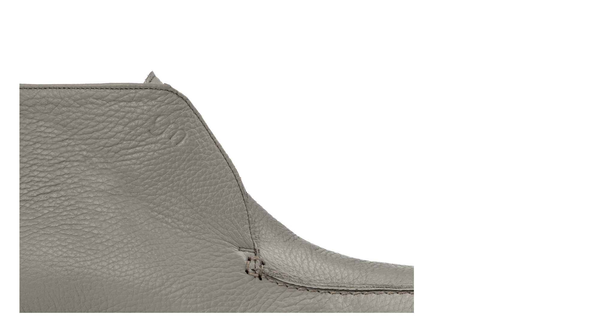 Ankle boot in ultra-soft grey deerskin, offering a refined and elegant look. The soft upper molds comfortably to the foot, while the calfskin lining provides breathability and comfort. A hidden elastic under the tongue ensures an easy, effortless fit.