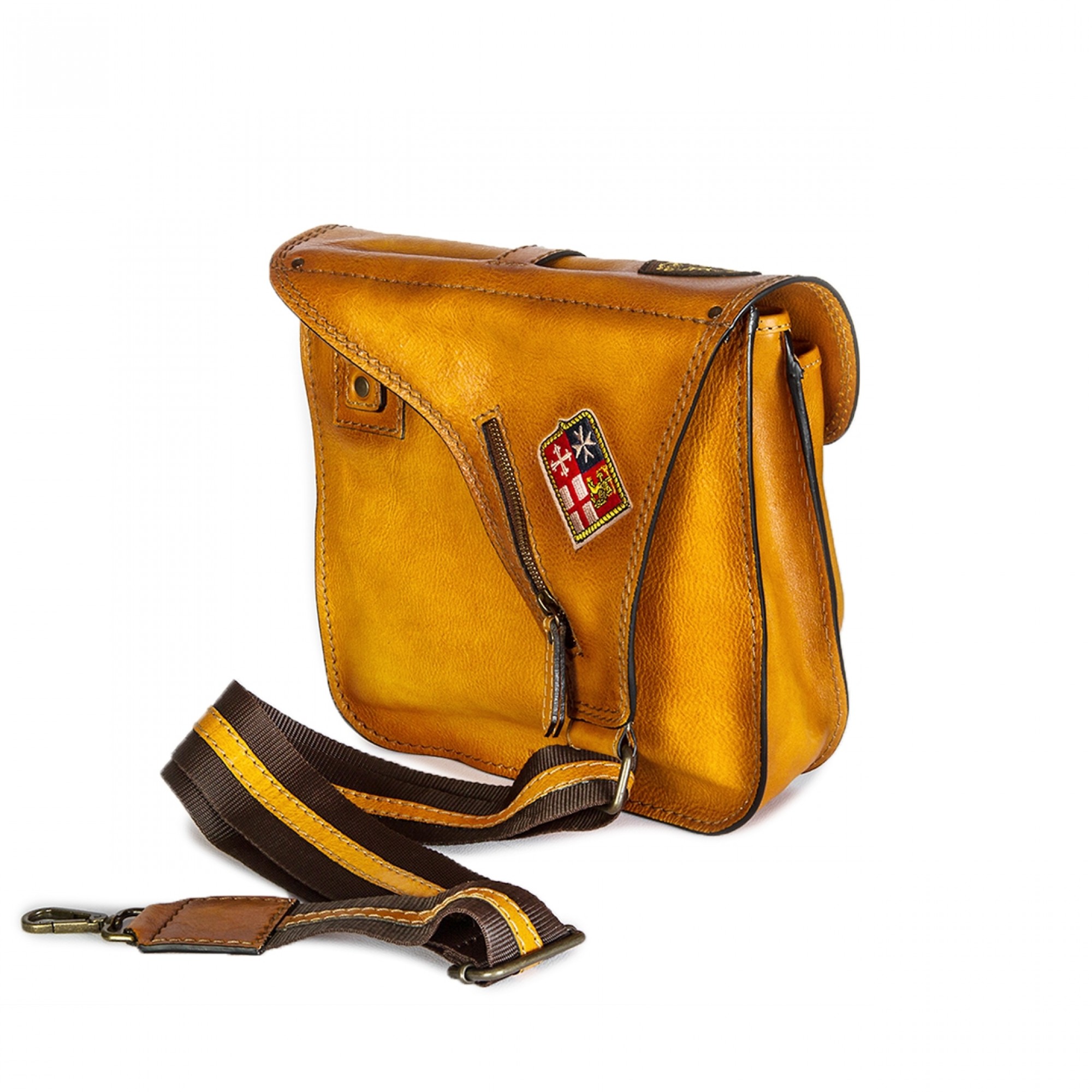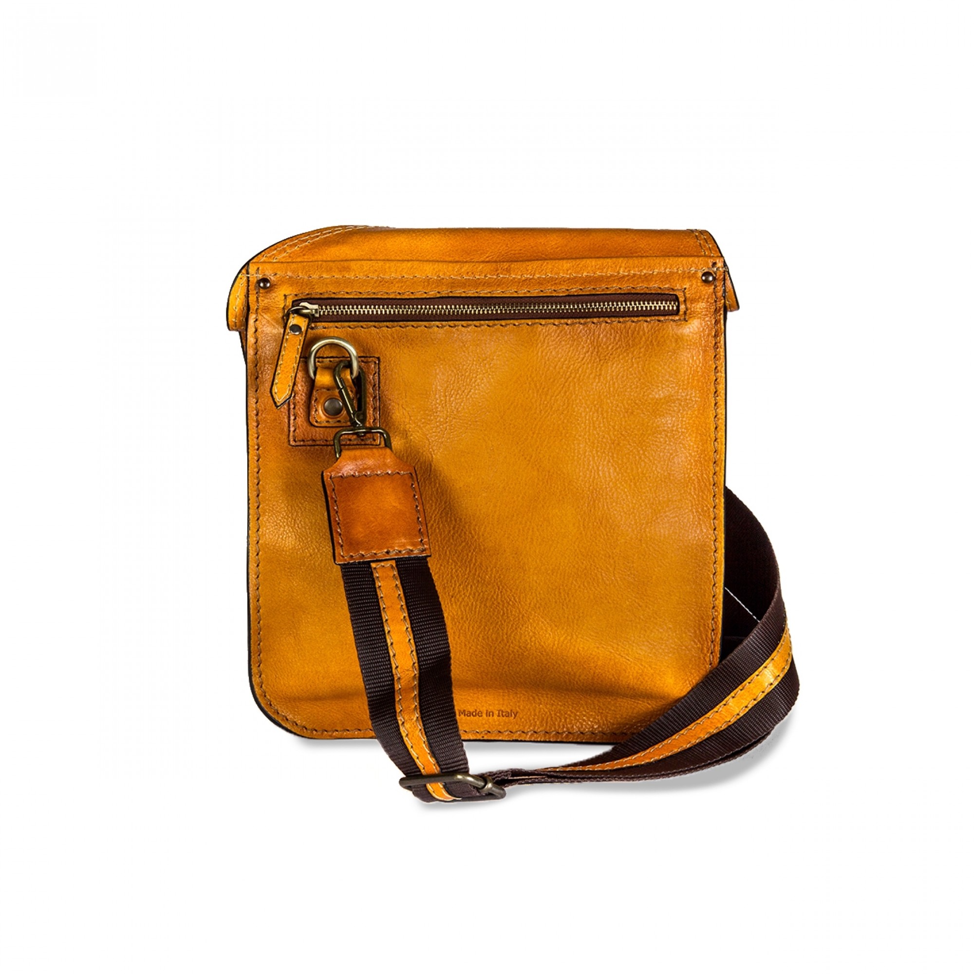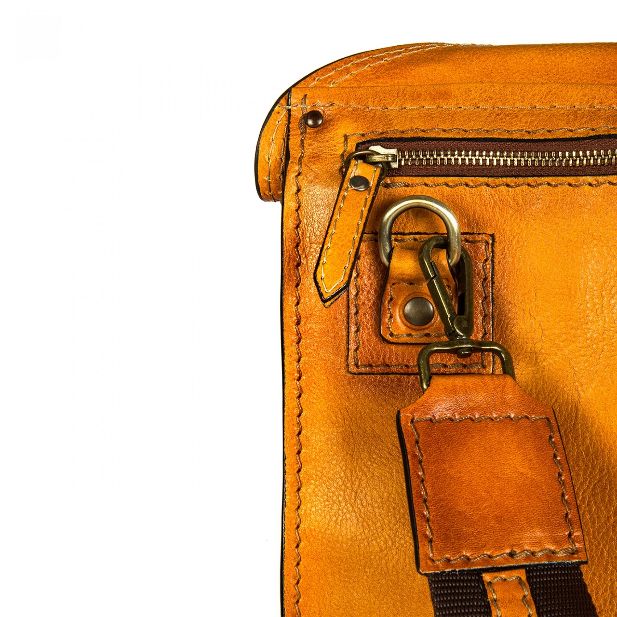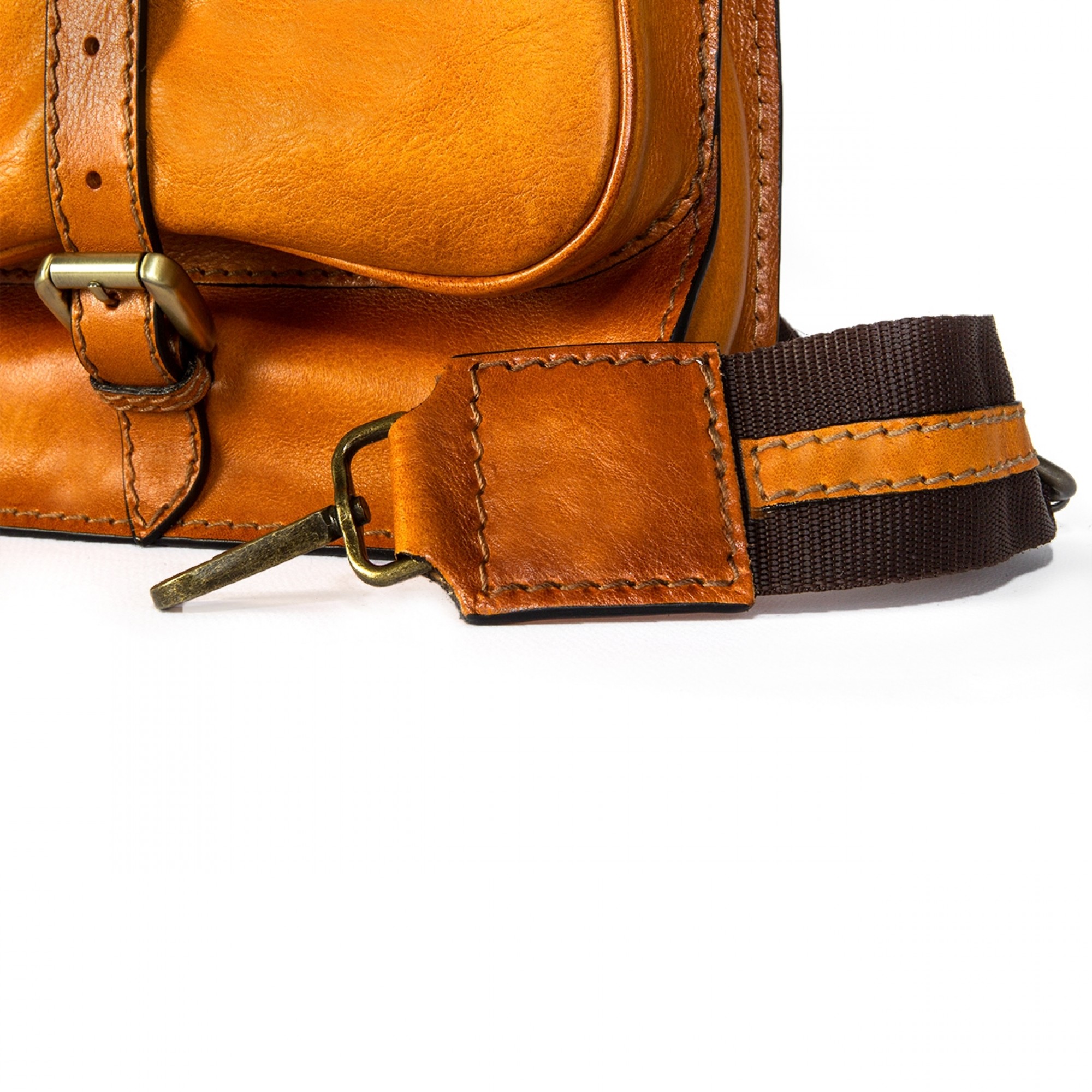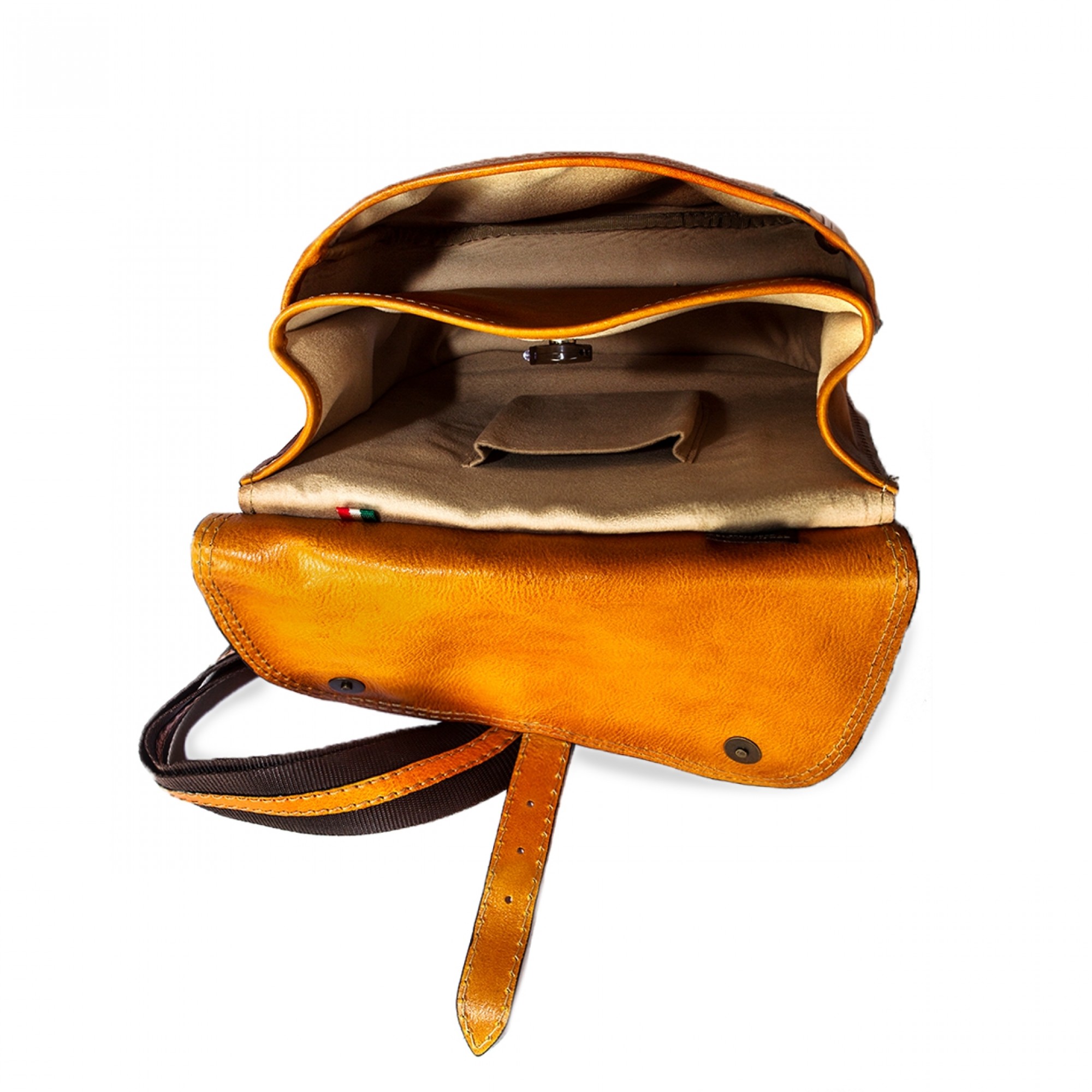 Messenger backpack made of cognac tan Italian leather naturally aged by using a traditional and unique technique. With a single cross body shoulder strap, Bisaccia Cognac is the perfect fusion of refinement and functionality, designed to satisfy every need, comfortable and versatile.