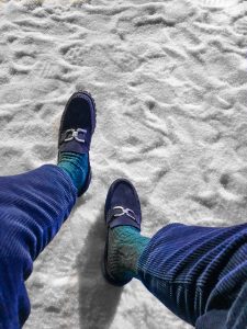 Brand testimonial for the 2020 edition of Milan Fashion Week Men’s was the fashion blogger Giampiero Giambona. Giampiero has decided to complete his two outfits with a real touch of class. In fact, he chose to wear GuidoMaggi Versailles elevator loafers.  A sartorial reinterpretation in a contemporary key of the classic height increasing loafer with dark blue suede upper, elegant metal alloy clamp and tone-on-tone striped sole in super-light rubber.  A must have for the contemporary man, who loves to be enchanted by extremely innovative and stylish artisanal creations.