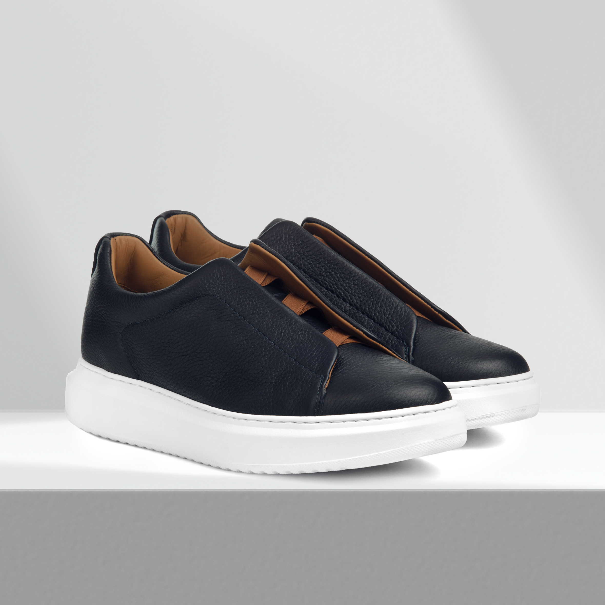 Black trainers with a white sole are not new this year but a must-have for quite some time. What makes them indispensable in the shoe cupboard is that they can be easily combined with any look, formal or informal. In the GuidoMaggi autumn-winter collection, the Doral are a pair of slip-ons that perfectly translate this need for comfort and elegance, thanks to the upper in soft blue deerskin with comfortable central criss-crossed elastics that accentuate the fit, and a super-light white rubber sole. You can wear them just about anywhere, with a pair of jeans and under a suit, without ever looking out of place, thanks to the minimalist design, fine materials and craftsmanship. Height increase from 6 to 8 centimetres.