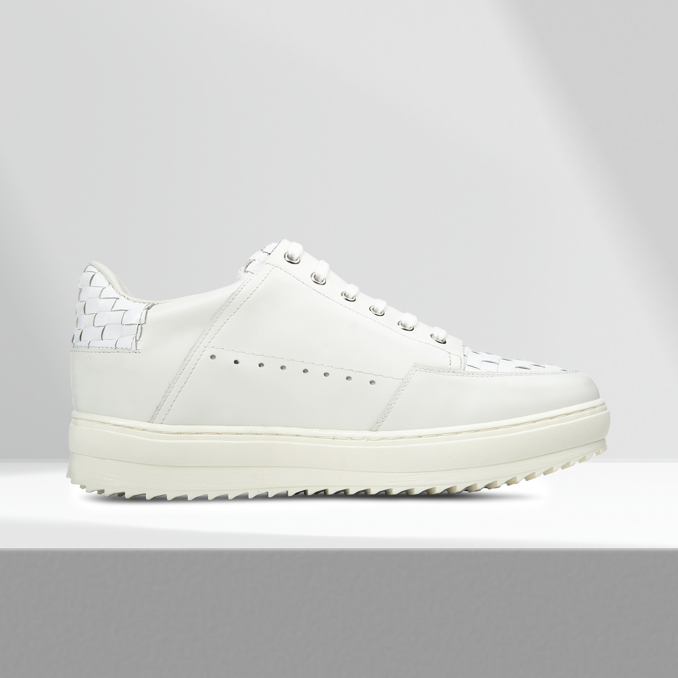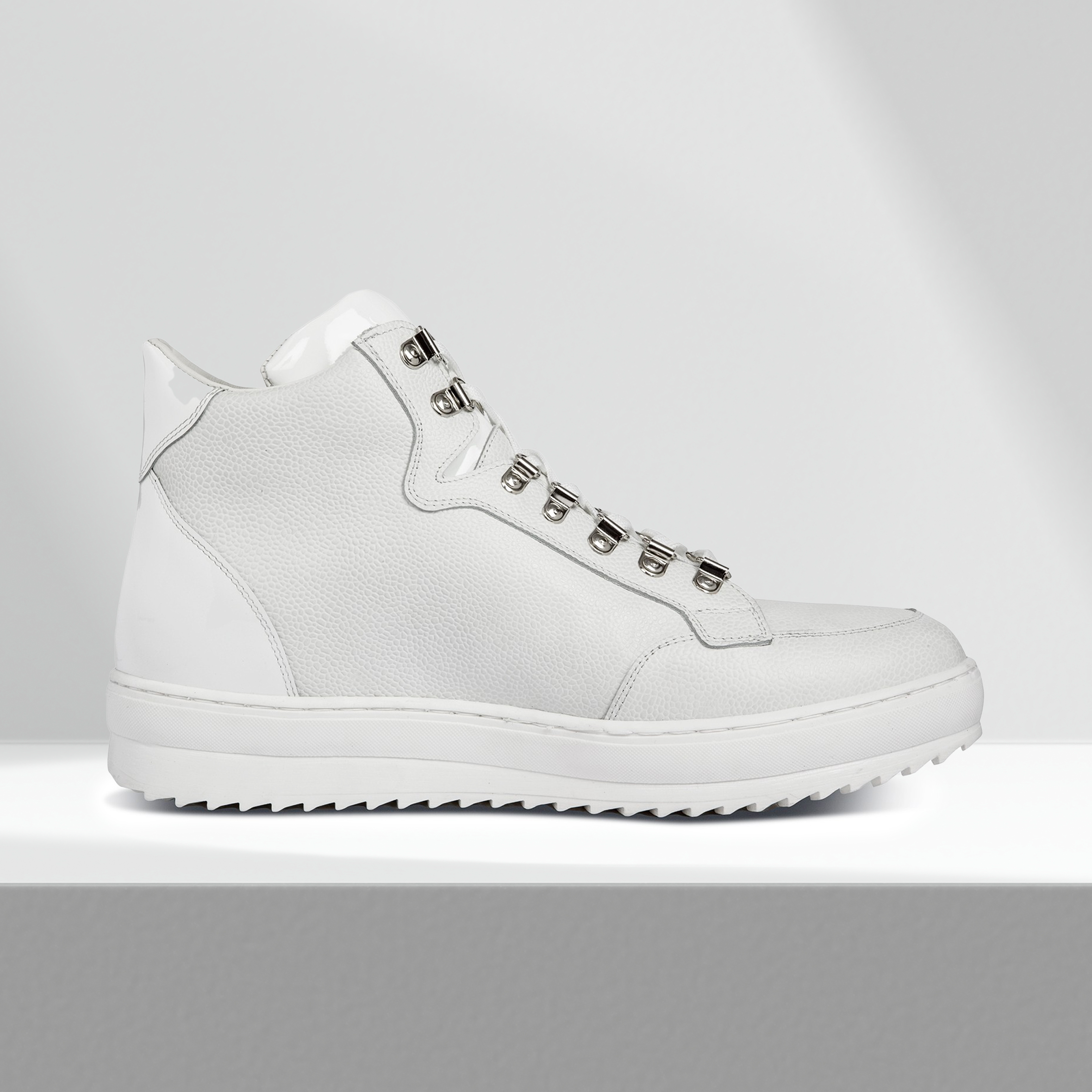 If you like the 1980s and like feeling taller even more, you’ll find Cap Blanc by GuidoMaggi interesting: total white elevator sneakers that mix two different leathers, reach an 8-centimeter height increase, and have nothing to envy the iconic Reebok Club C.