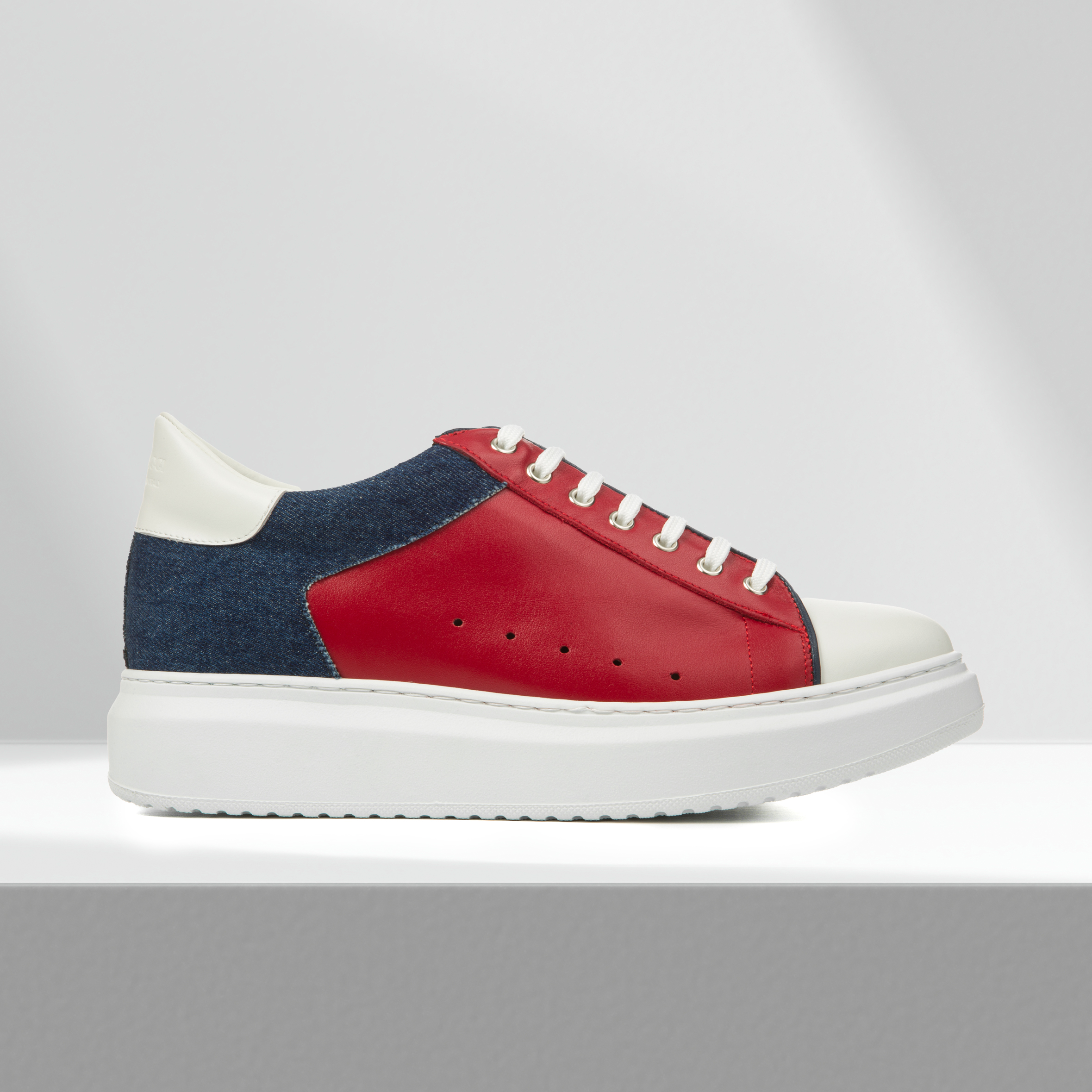 An equally vibrant alternative with laces is represented by a pair of Karpathos, with a full-grain white and red leather upper, enriched by denim fabric on the back, a natural rubber sole, and a secret internal elevator system that offers a height increase from 6 to 8 centimeters.