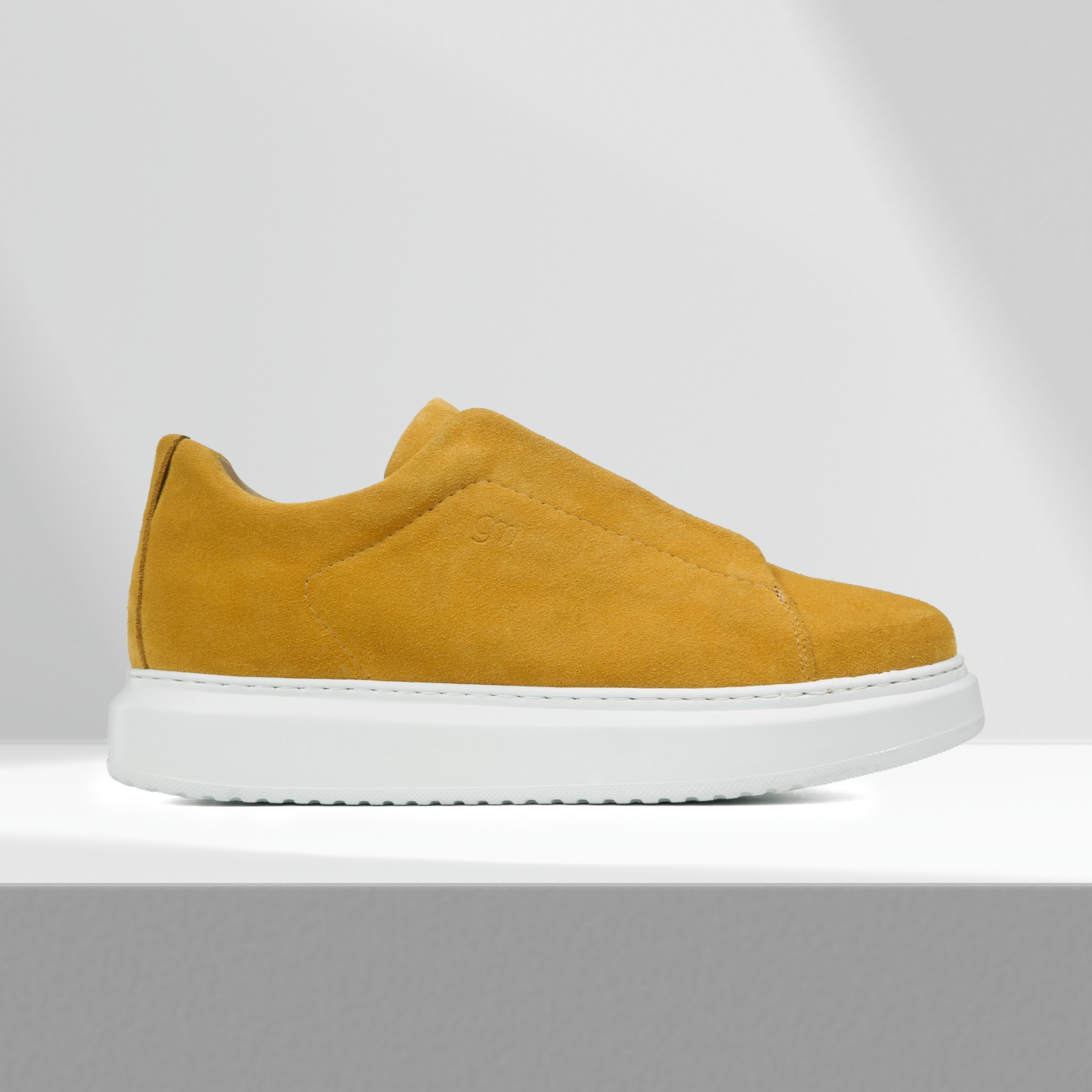 If the news of the resurgence of vibrant-colored sneakers delights you, then your shoe rack is eagerly awaiting a pair of Outer Banks by GuidoMaggi: slip-ons in soft mustard-colored suede, with contrasting gray crossed elastics, a super-light rubber sole, and a calf inner lining. Among the distinctive features of this model are superior fit, unmatched comfort due to the absence of laces, and an internal elevator system that increases height by up to 8 centimeters in total comfort.