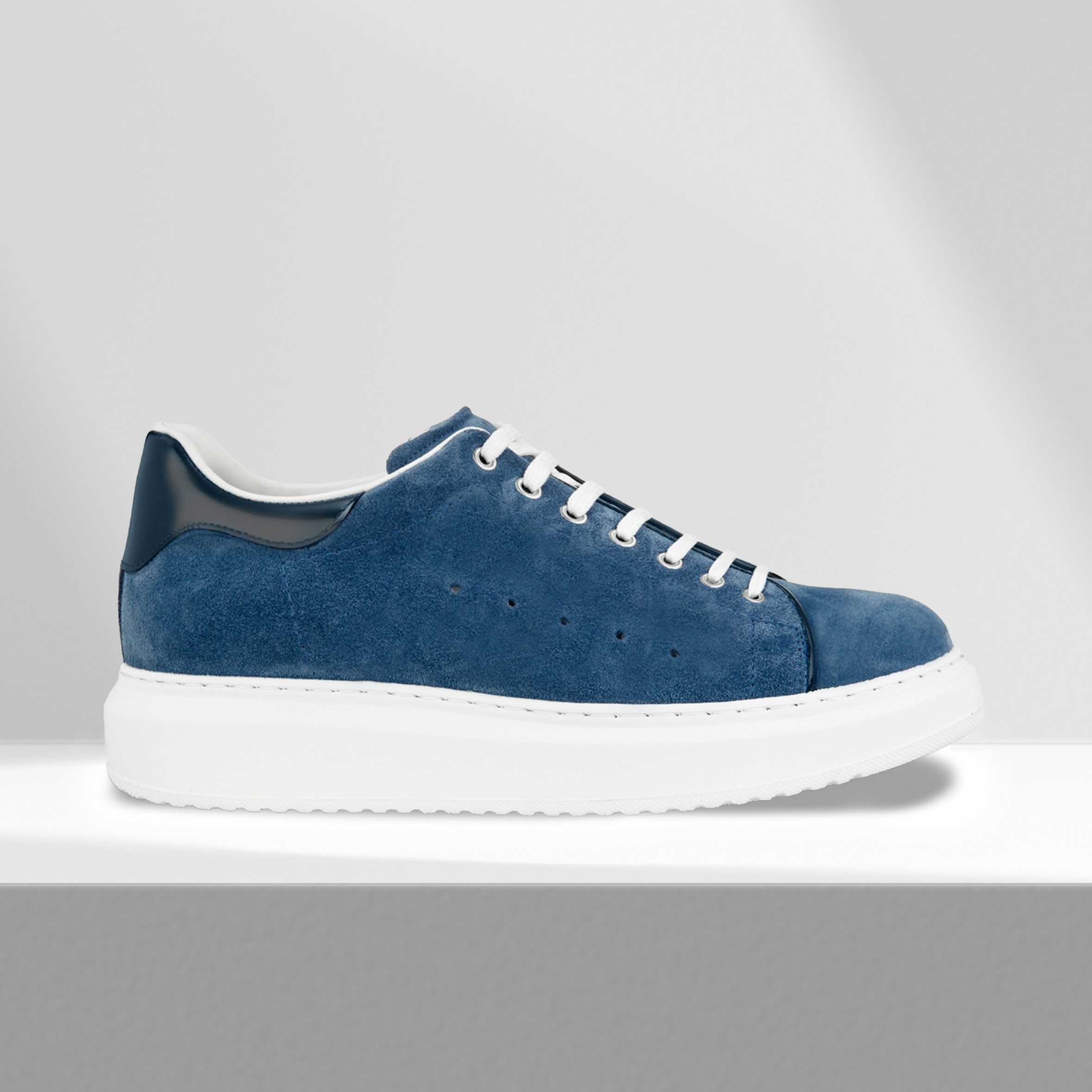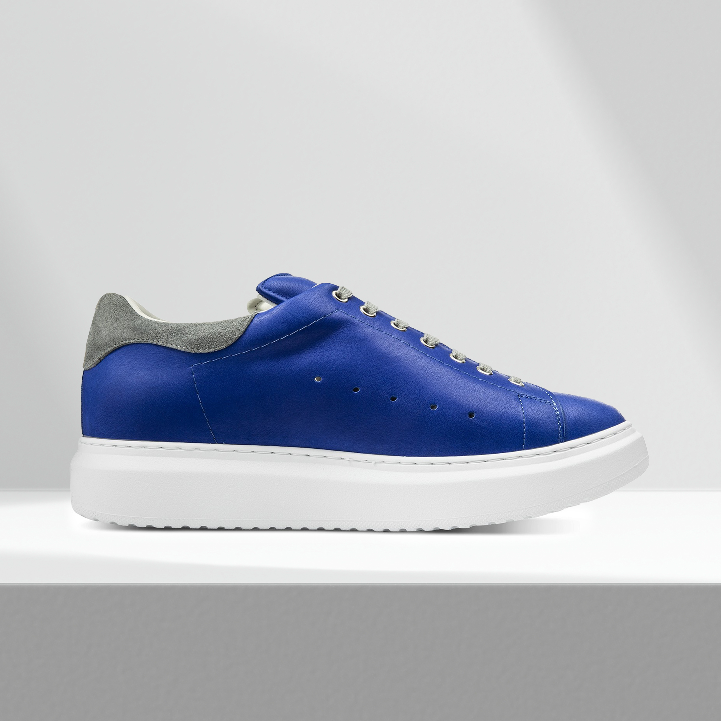 If you like this trend, the blue elevator sneakers of your dreams are a pair of Calafate by GuidoMaggi: a super-light sporty-chic model with a vibrant light blue calf leather upper, contrast gray laces, and an internal elevator system that increases height by up to 8 centimeters. Enriching the model, there’s a gray suede spur, tonal eyelets, and a hand-stitched white sole. Perfect for a blue outfit, but also as a trendy detail to contrast in a basic look.
