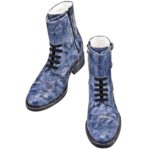 The Van Gogh is a hand painted elevator boot that is an ideal pairing for a blue and white wardrobe. These blue leather height increasing boots feature a unique effect because of the painted detailing, which can add a unique personalization to your outfit while adding up to 4 inches to your height.