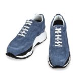 The Giant Piranha elevator chunky sneakers are made using five different materials such as grey and blue suede, breathable and fresh blue fabric, ocher yellow nubuck, and while rubberized calf leather. Made in extra light rubber, the sole is two-colored in black and white.