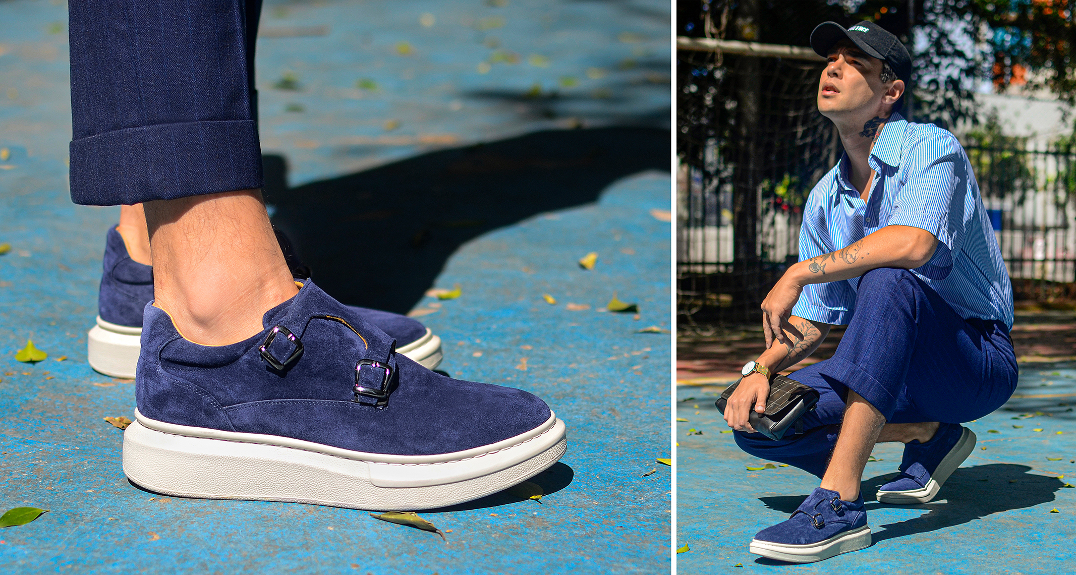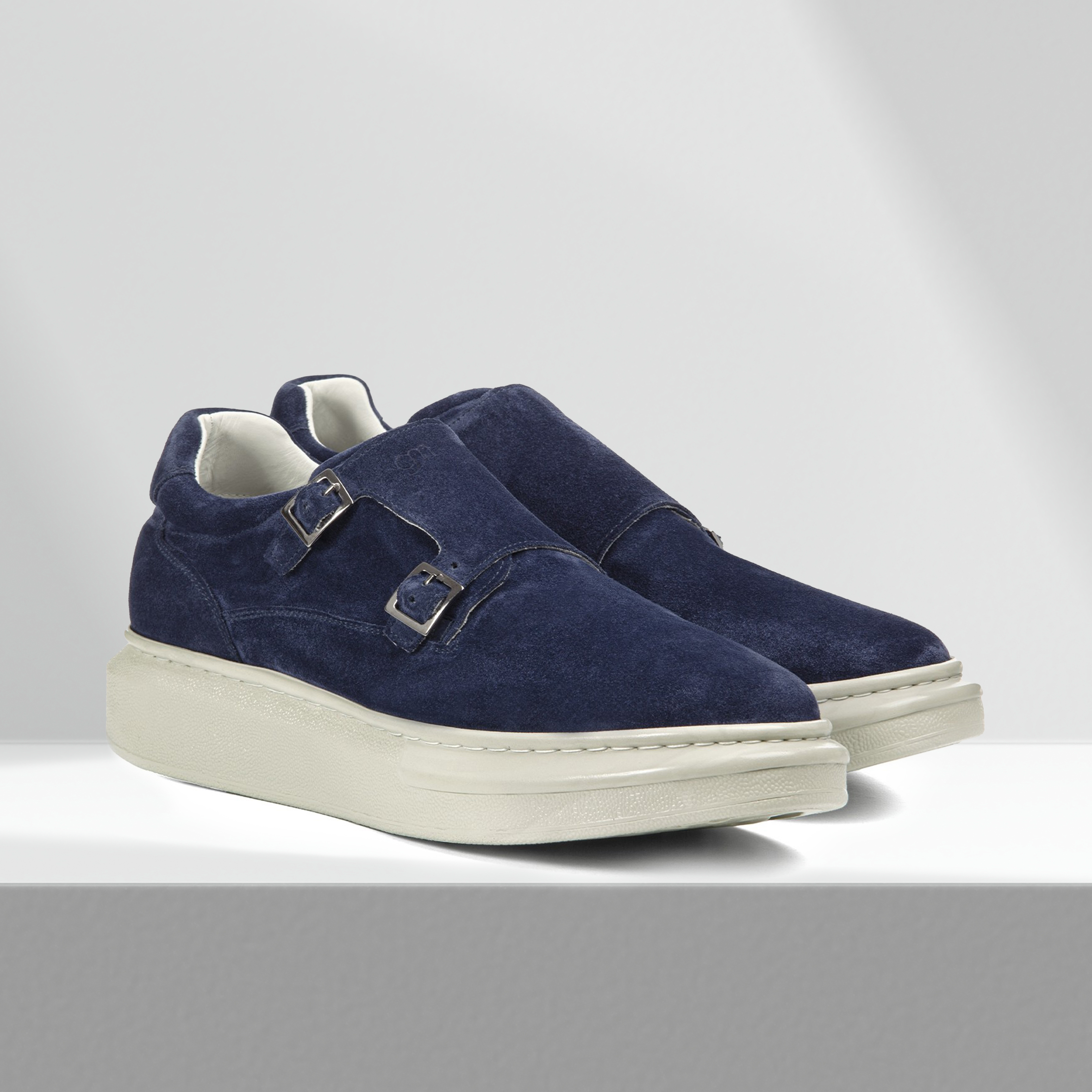 3. Milton: Slip-on + Monk Strap Shoes. Innovative mix of a double monk strap shoe and a slip-on gives birth to an exclusive model, to be sported in every summer occasion, from the most casual to the most formal. The upper is made of suede calfskin in light navy blue tones, the white superlight rubber sole is tall, sporty and durable, and the lining is made of calfskin. Wear it at the office with a suit and in your free time with a pair of jeans or a pair of Bermuda shorts on warmer days. Rise up to 7 centimeters.