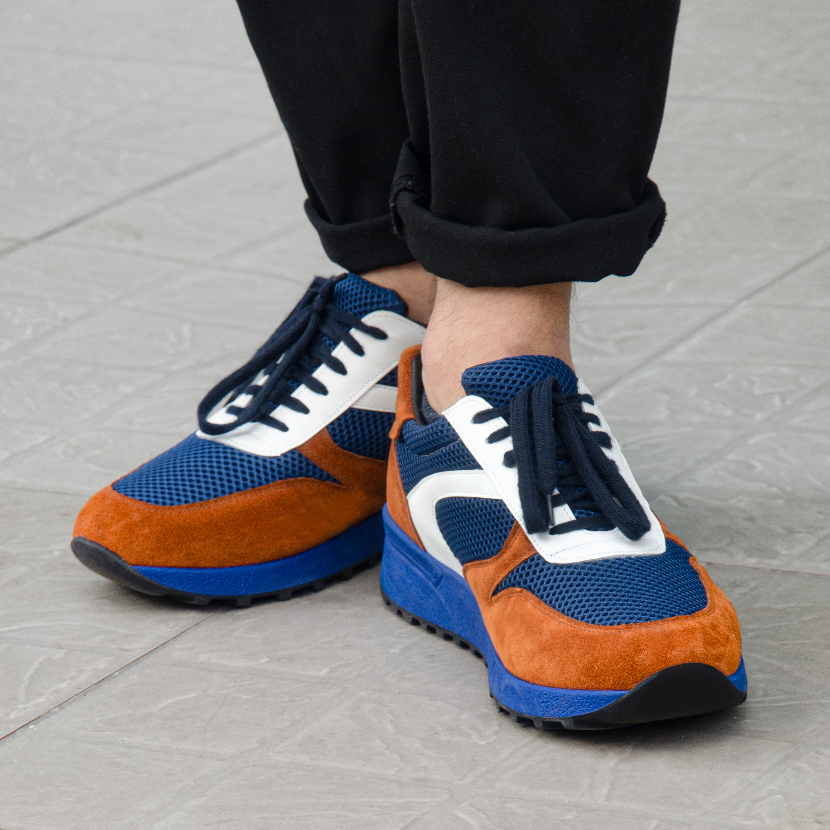 Sporty. Sophisticated. Smart. The Moltrasio are brown elevator sneakers with a contemporary design that combines aesthetics and function. GuidoMaggi crafts them from a refined mix of brown suede, white calfskin inserts, and breathable navy tech fabric, perfect for tackling summer with energy and style.