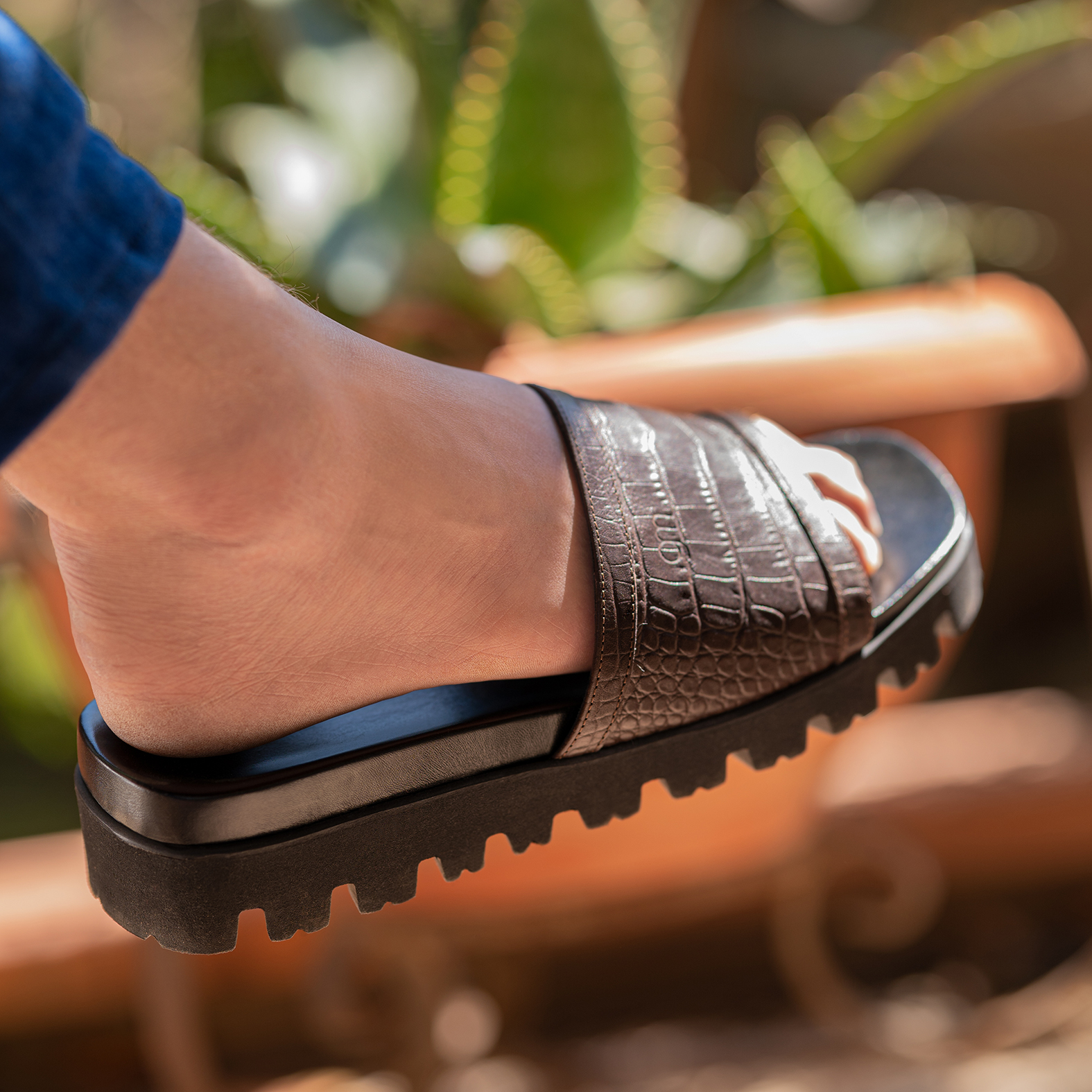 They’re not part of the new collection, but they’re a timeless favorite in the GuidoMaggi catalog. The Idra brown sandals are elevator slides crafted from calfskin with crocodile print, in persuasive brown shades and an ultra-light lug sole.
