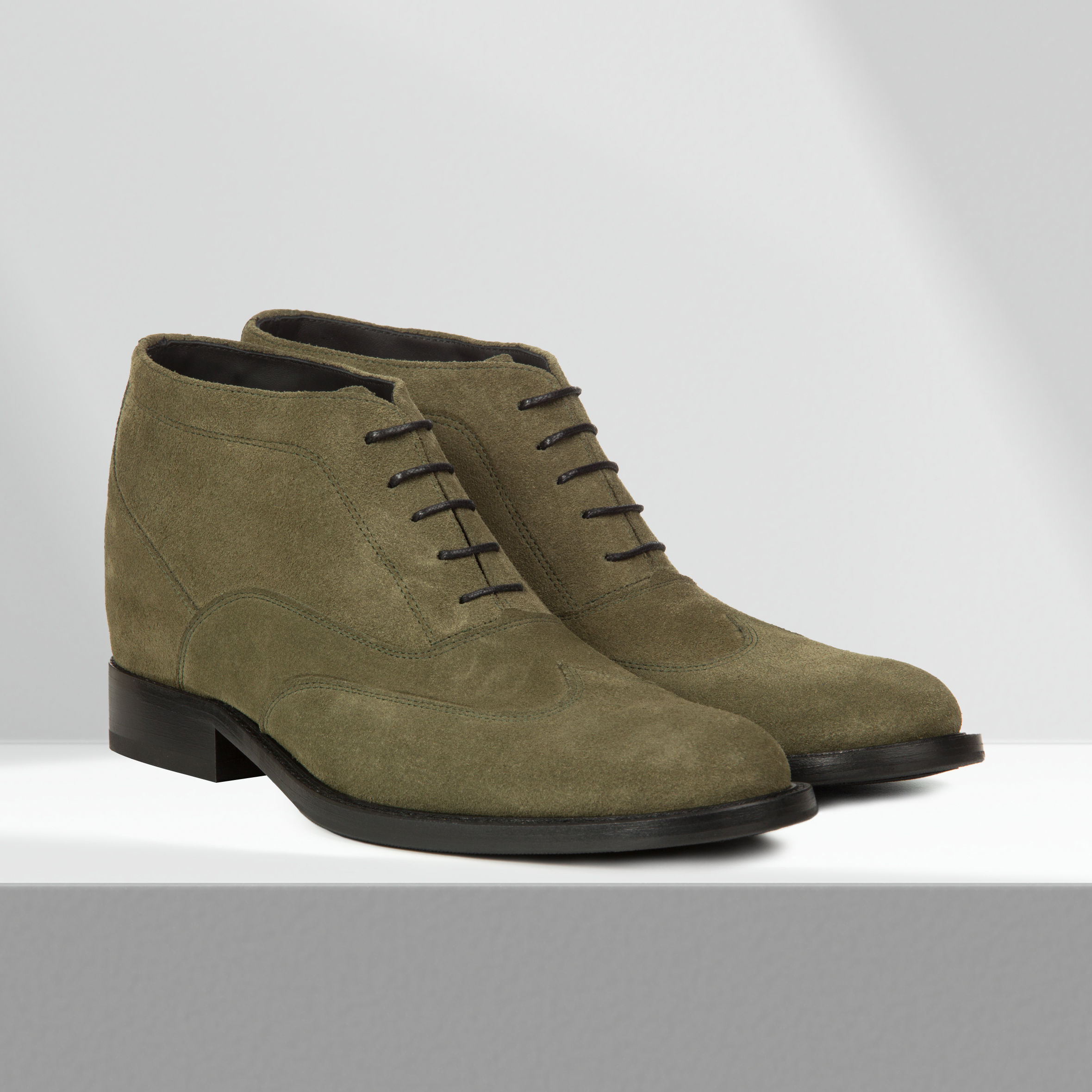 A pair of Mayfair combines Italian craftsmanship and exclusive design, perfect for those who want a touch of casual elegance. The green suede calfskin upper lends personality and sophistication to these men’s winter ankle boots, while the soft kid leather lining ensures optimal comfort. The sole, upper and insole, which are joined and stitched at sight, testify to the attention to detail, with a real leather heel and non-slip rubber insert adding functionality. In addition, the internal rise, customisable between 2,4, 2,7 or 3.1 inches, allows you to gain height with discretion.