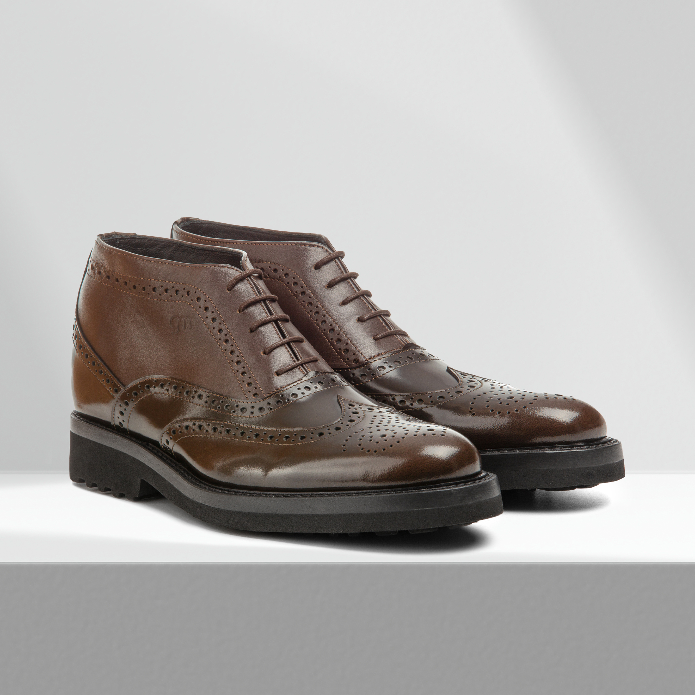 The Colstrip are handmade ankle boots that boast a full brogue upper in two fine types of leather – brushed calfskin and full-grain – in warm brown tones. The rubber sole guarantees comfort and excellent grip, making them ideal for tackling every day in style. In addition, thanks to the internal elevating system, they increase your height up to 3.1 inches naturally.
