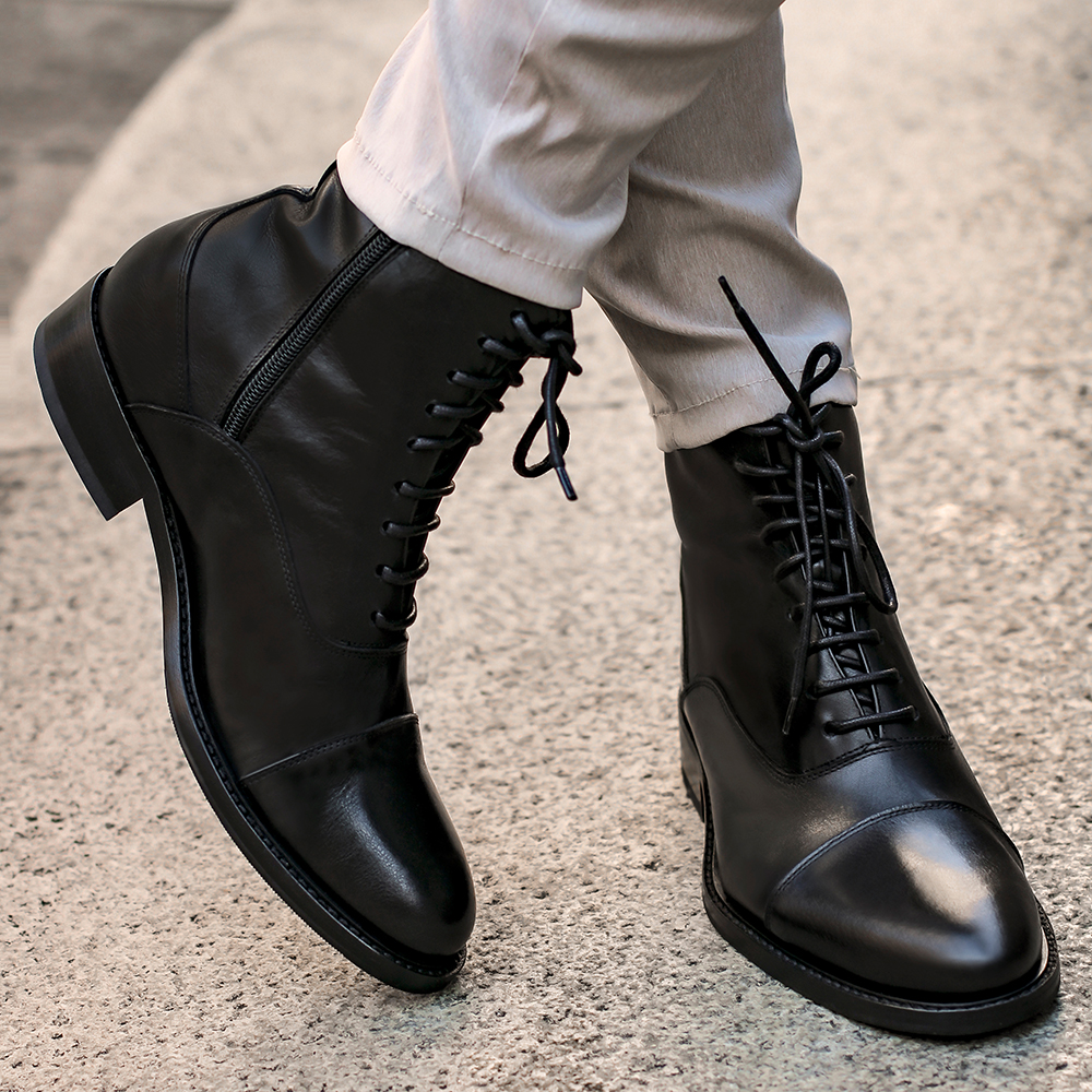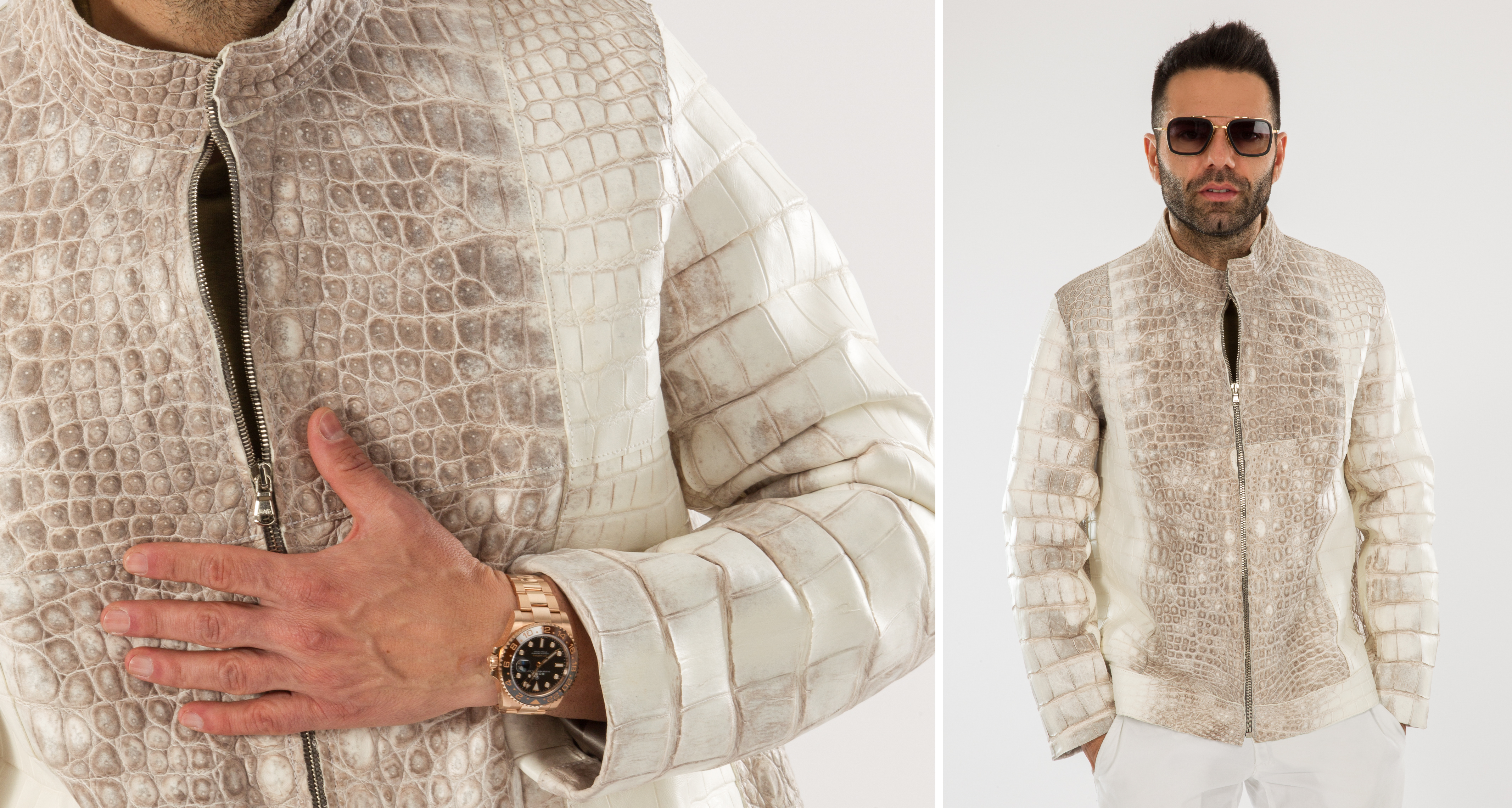To match the bomber jacket with more formal outfits, one trick is to go for neutral tones. Under an elegant total black look, for example (instead of the classic trench coat) try pairing a bomber jacket in brown/grey tones, like GuidoMaggi’s Heimdall jacket in crocodile leather and pure cashmere lining. On the feet, a pair of black elevator boots or ankle boots will be able to give your outfit extra momentum and inches.