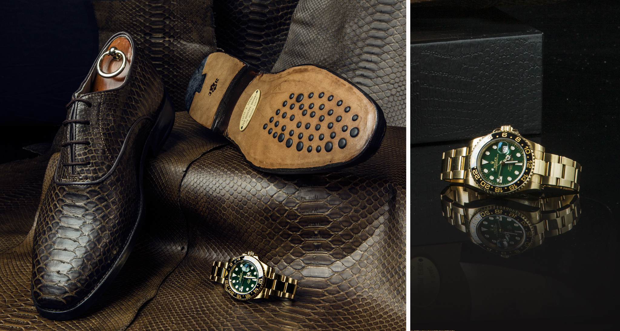 The Rolex Gmt Master II is a timeless classic synonymous with elegance and prestige. Mezzago, the elevator shoe from the new GuidoMaggi collection, is the essence of luxury chic. An Oxford made with fine smooth genuine python leather with an attractive olive green nuance.