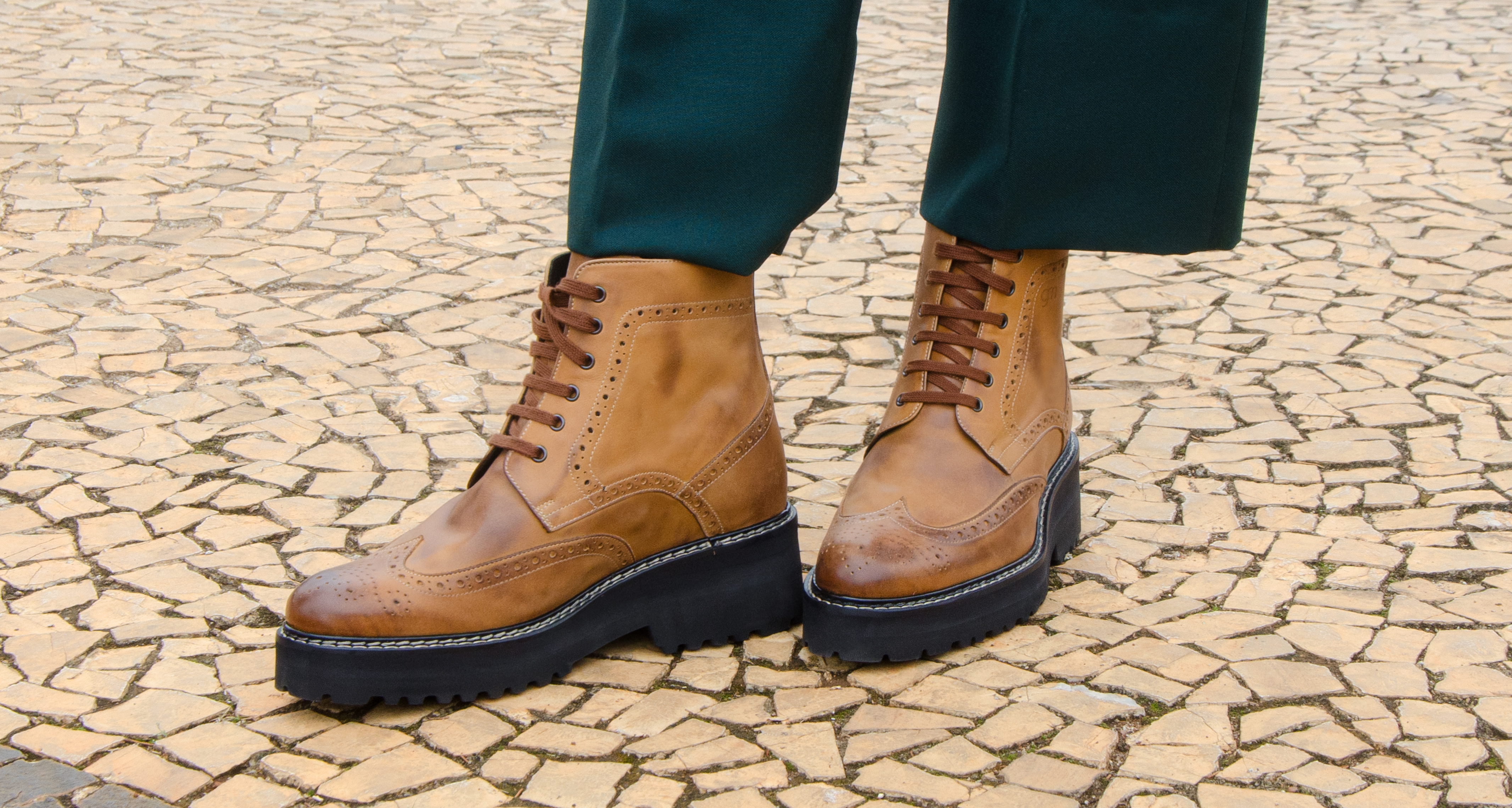 The Caledon model combines artisanal tradition with modern design, creating footwear that demands attention. Made from premium full-grain Tuscan leather in a rich brown hue, this boot features English brogue detailing and a hand-stitched wingtip design that enhance its timeless charm. The oversized bicolor sole, with its combination of natural white rubber and visible stitching, adds a unique dynamism, playing with the contrasts between classic lines and contemporary details.