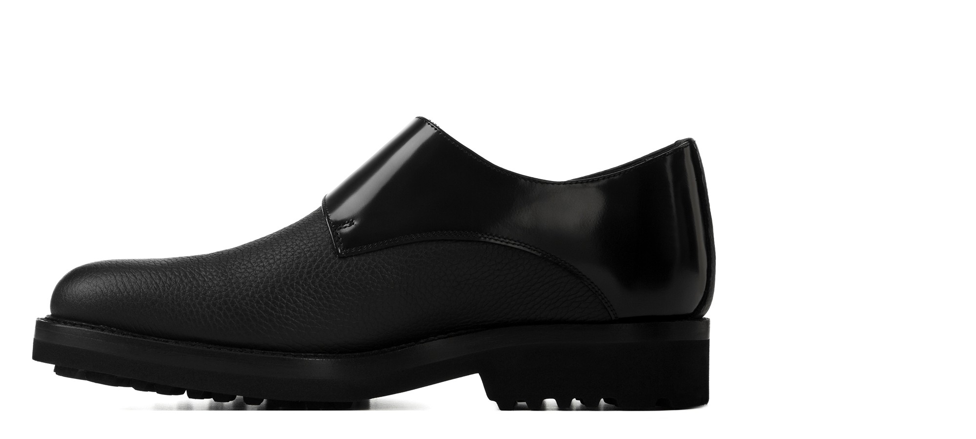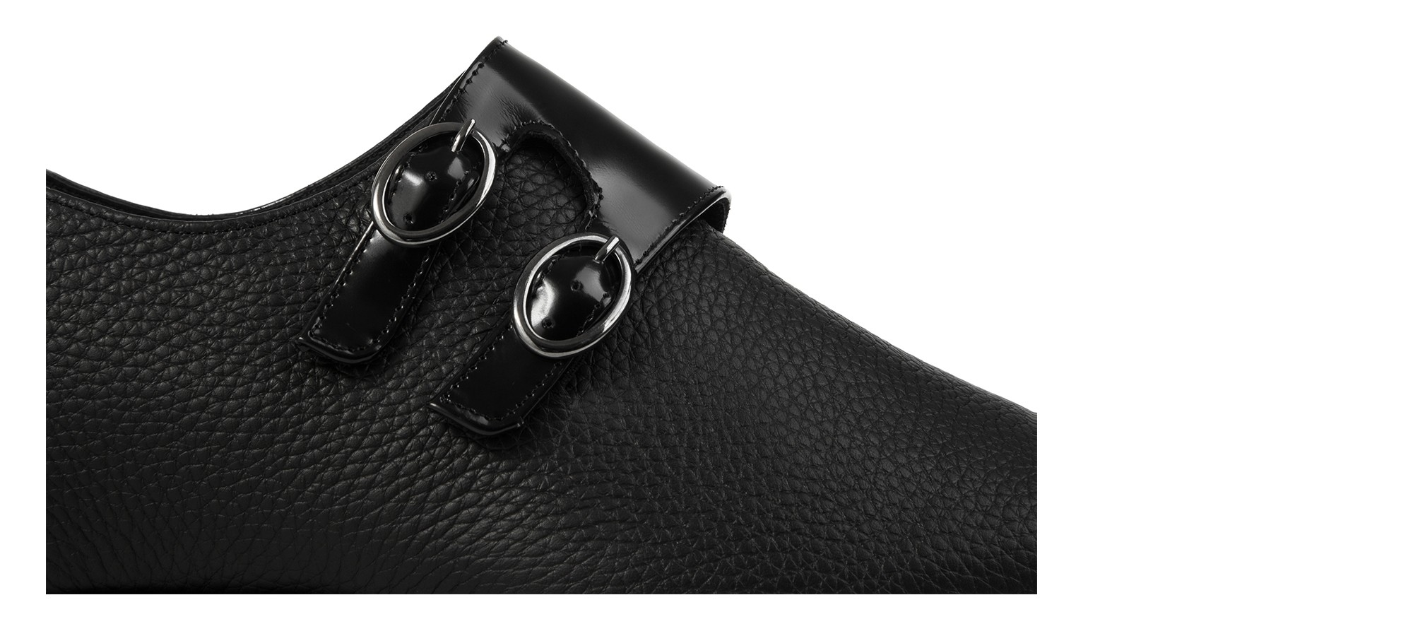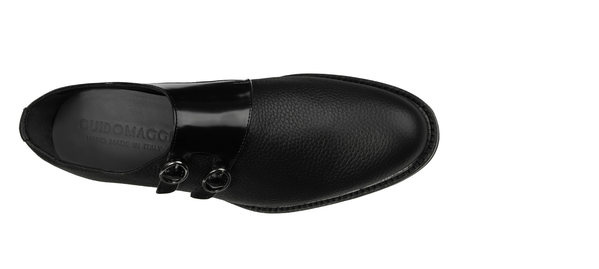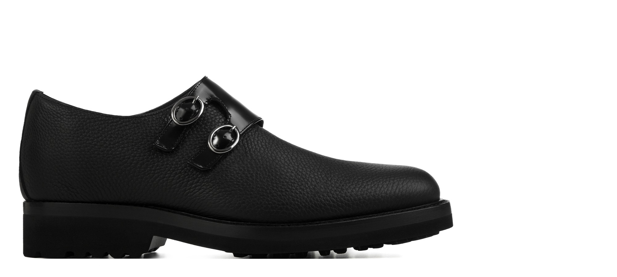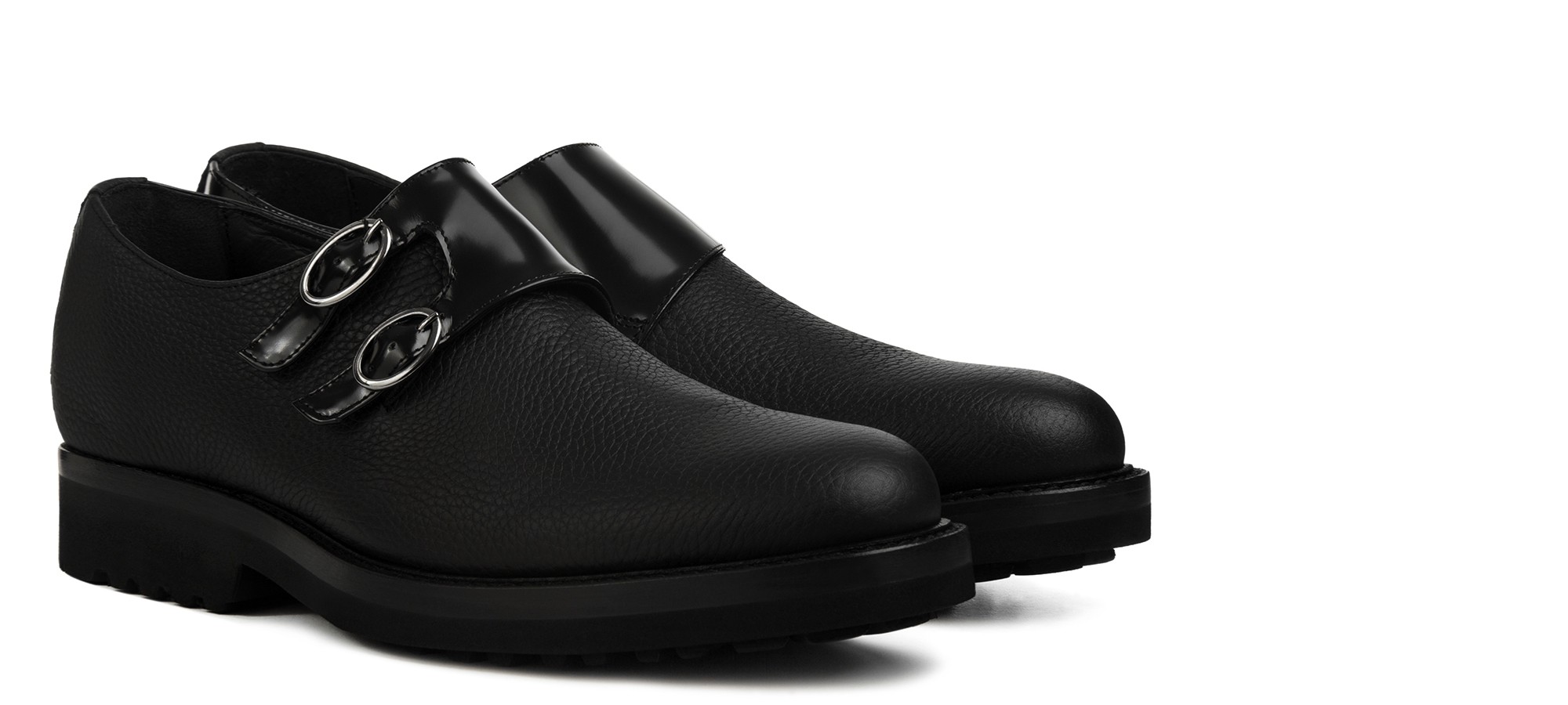 Sophisticated handcrafted double monk strap shoe, featuring a distinctive and contemporary design. The upper is crafted from premium black tumbled calfskin, with the buckle flap in contrasting shiny calf leather for an exclusive touch of light. The super-lightweight rubber sole, with visible stitching, ensures exceptional comfort and superior durability.