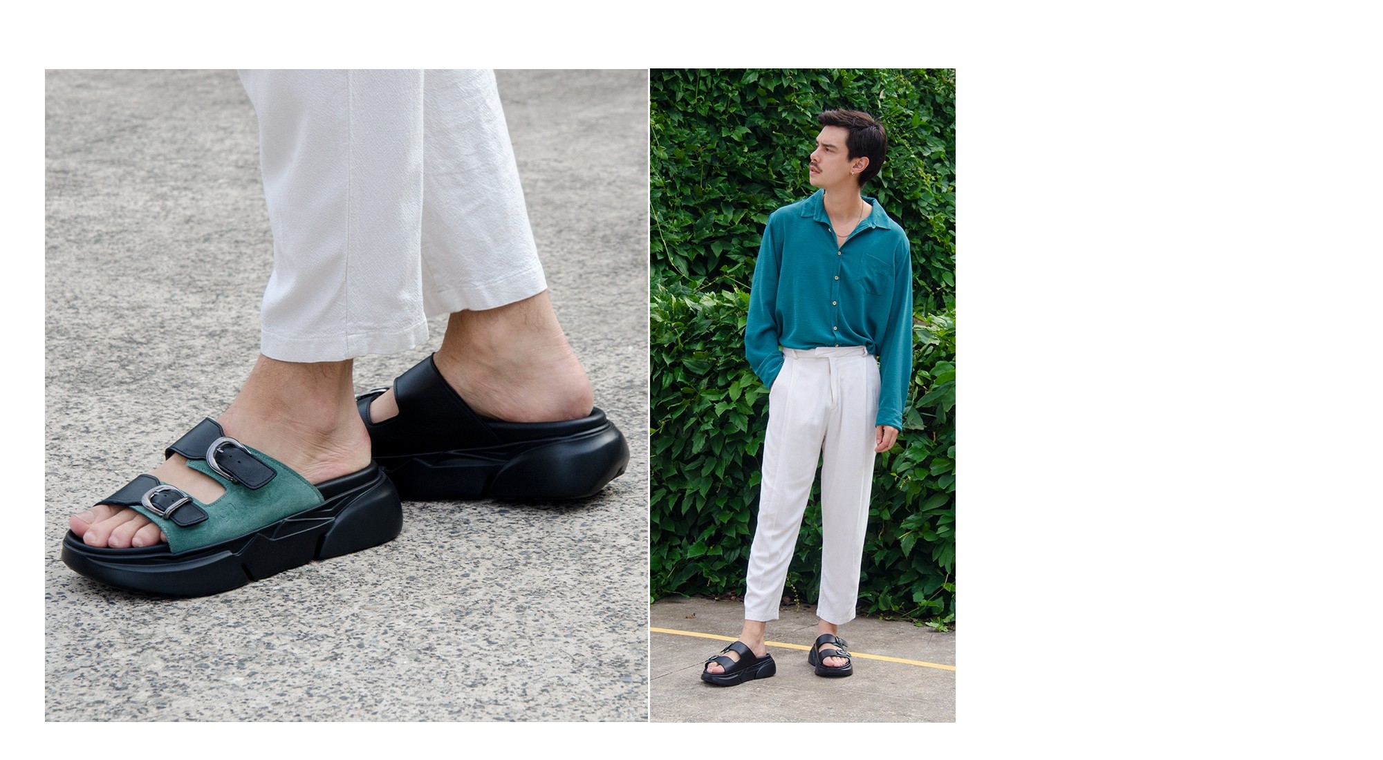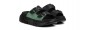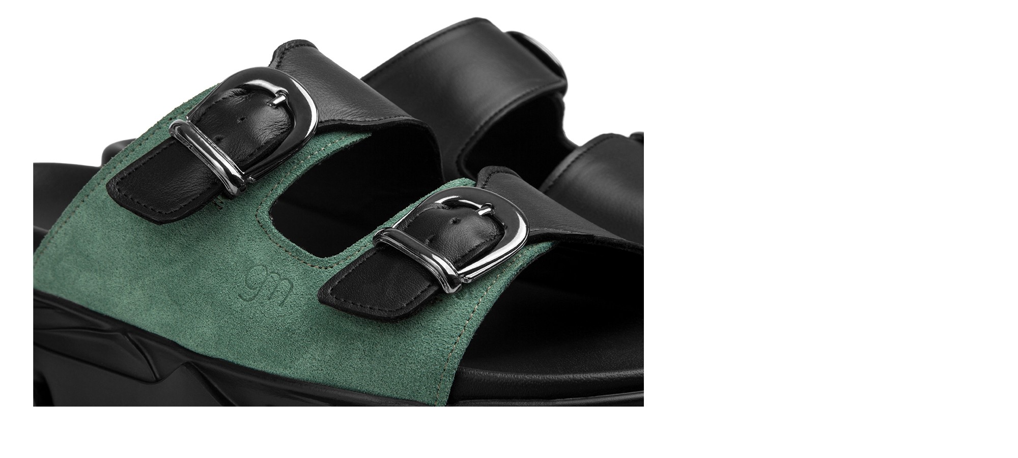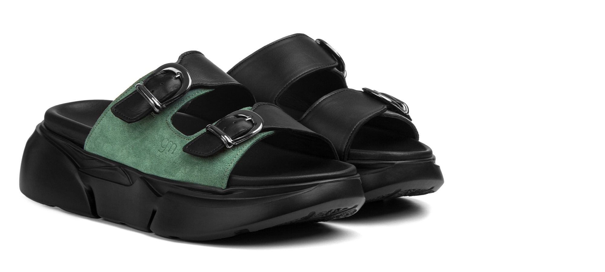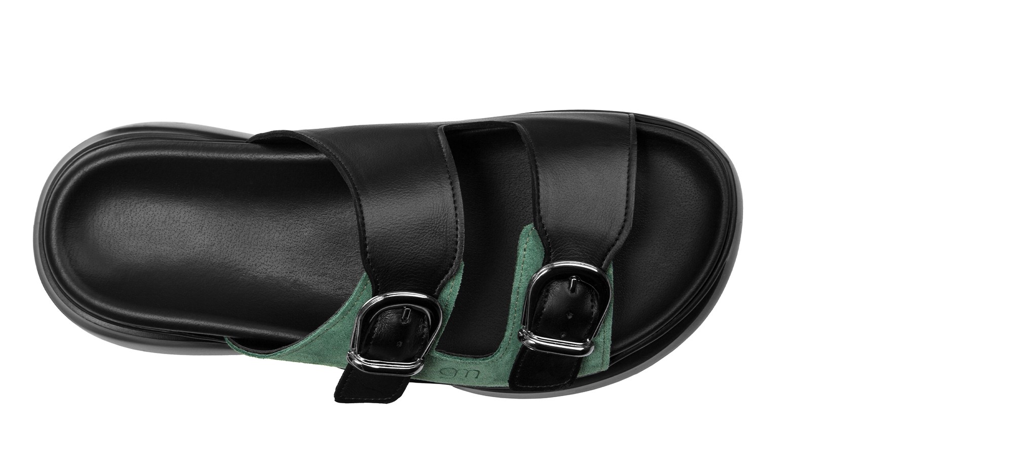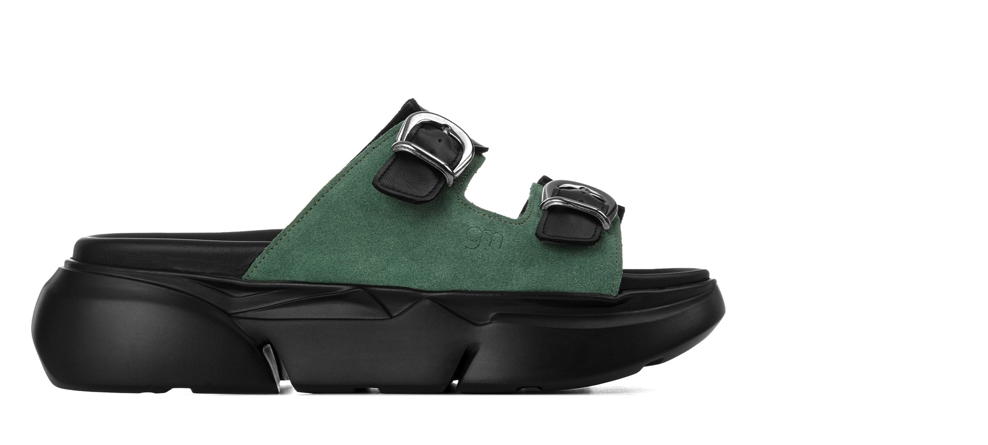 Double-buckle sandals in green suede and black full-grain leather, perfect for casual summer looks and laid-back days. The ultra-soft upper with two wide straps and oversized buckles ensures comfort and style.