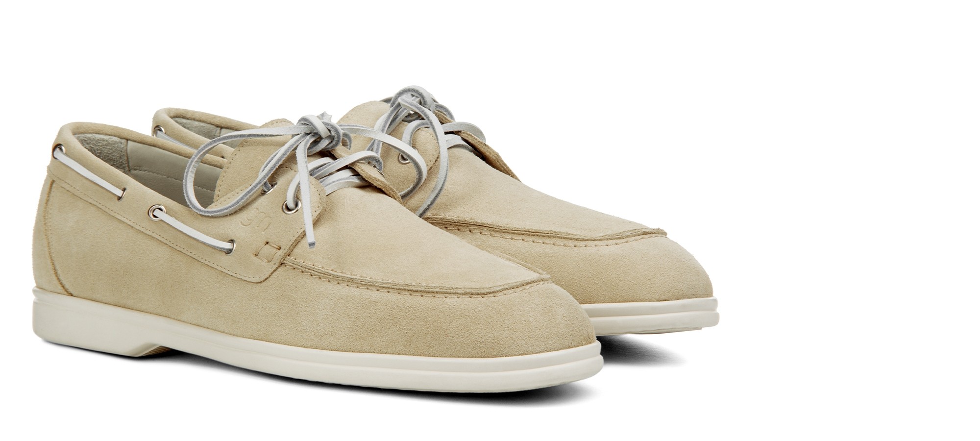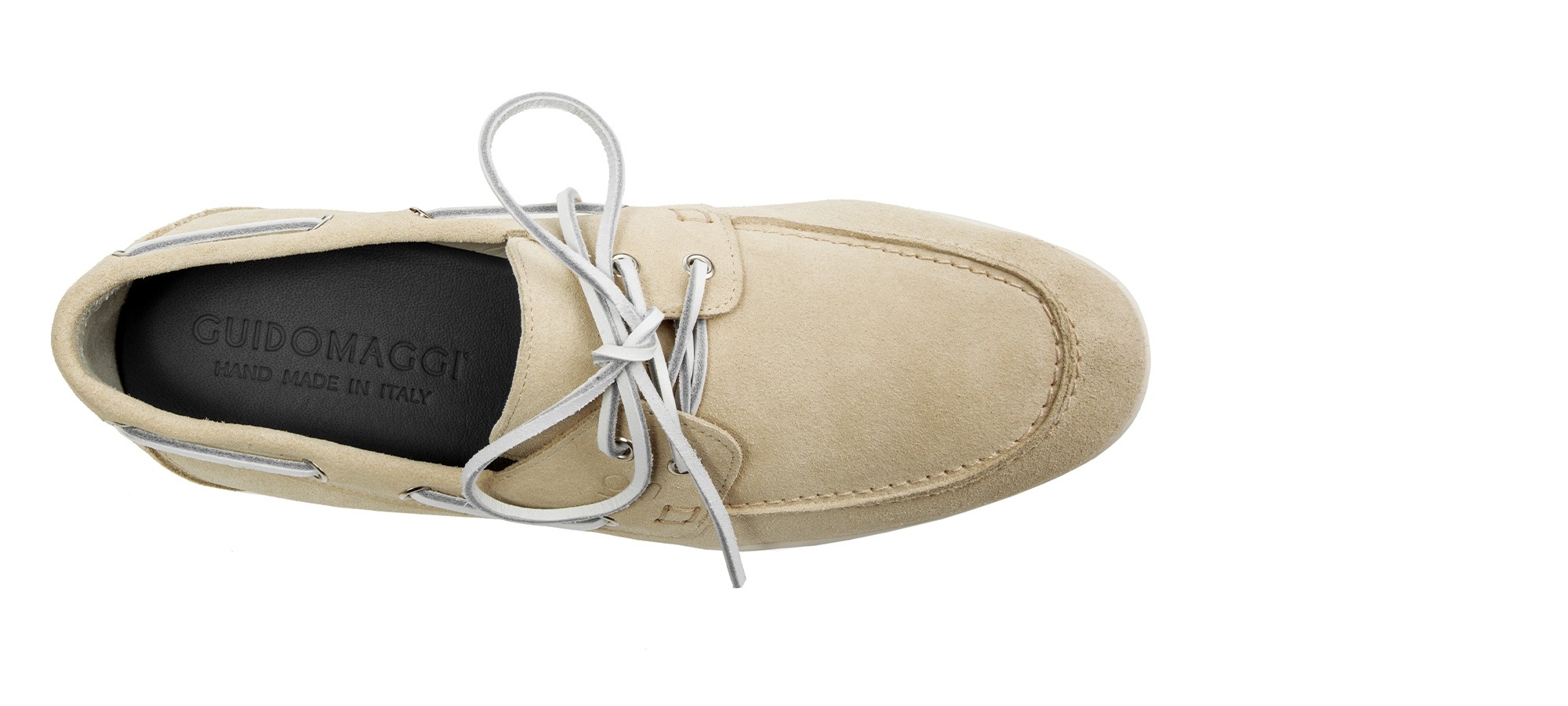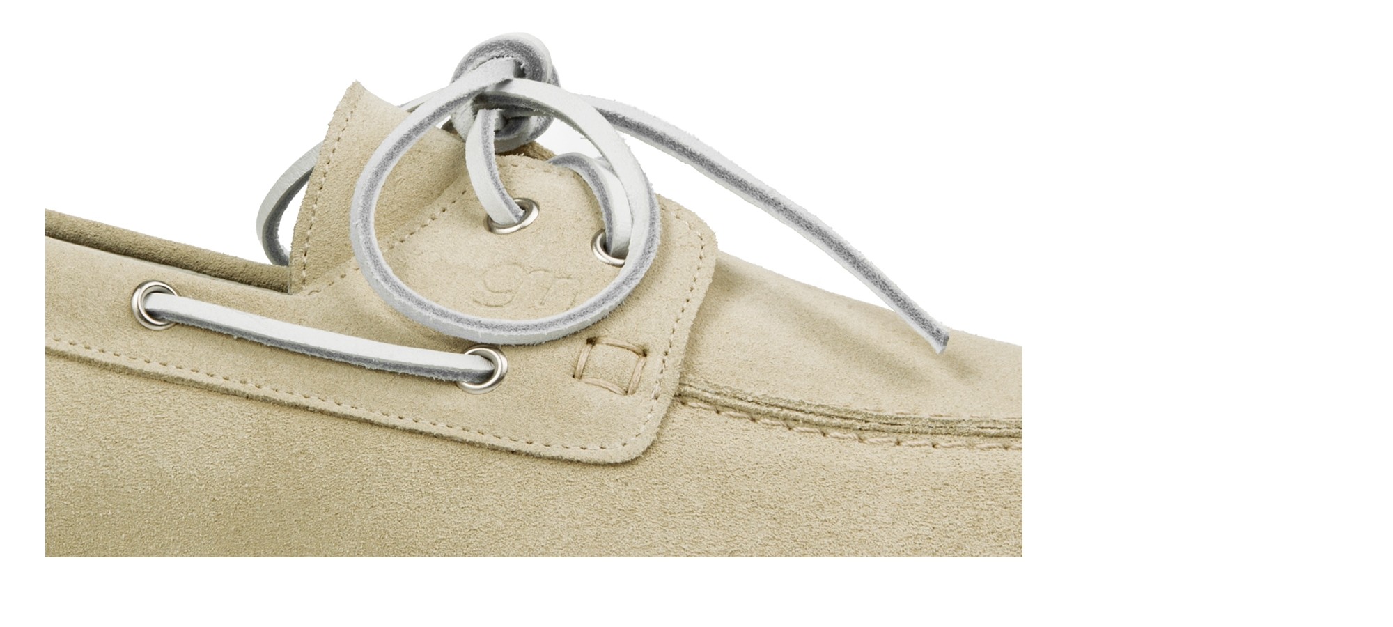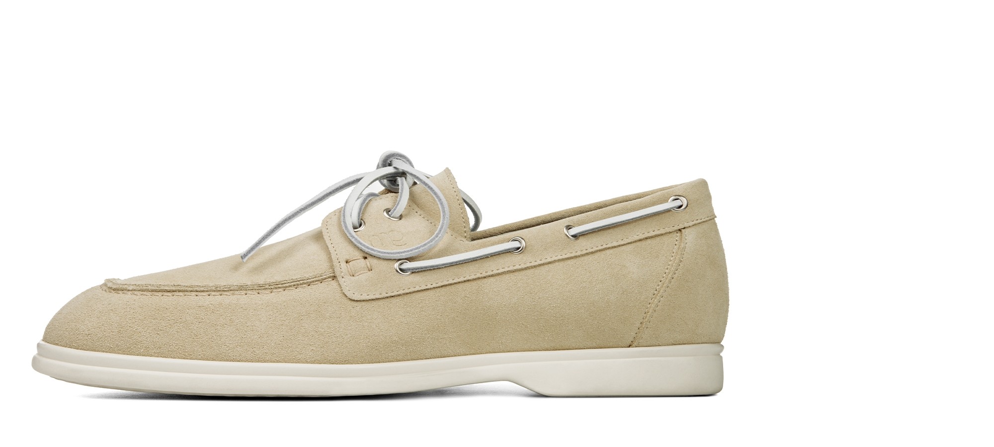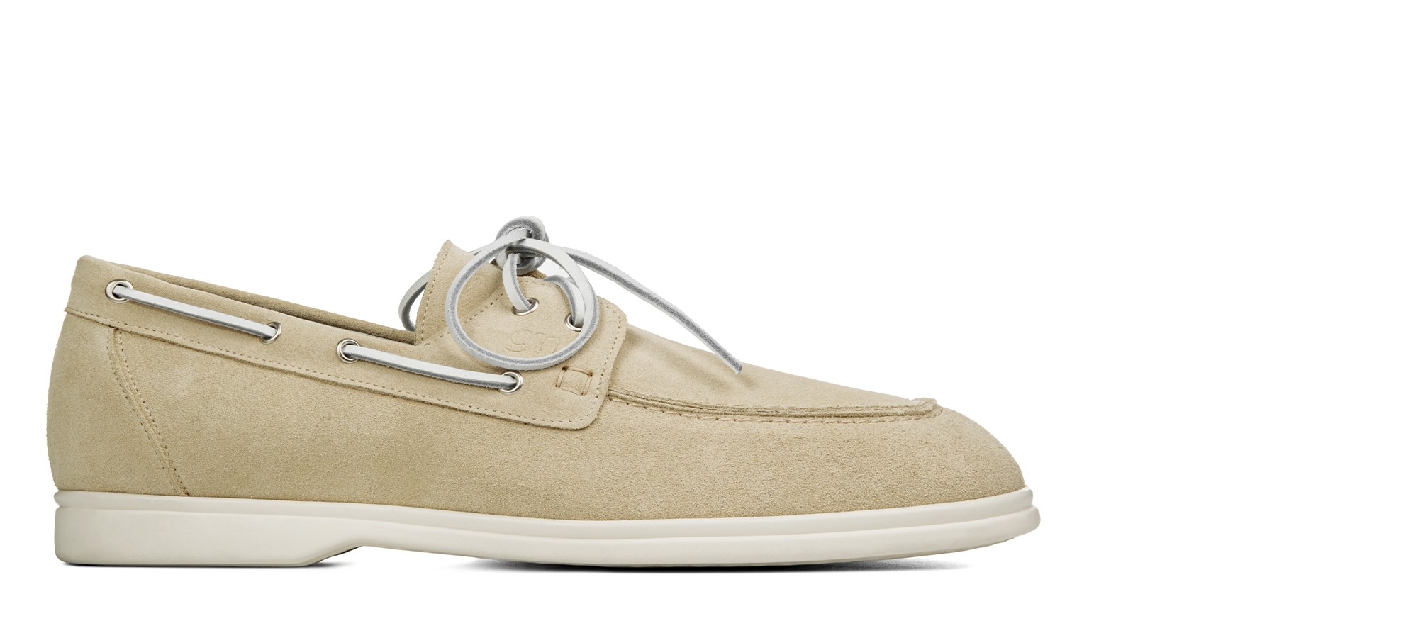 A modern take on the classic boat loafer, this casual model is crafted from soft blue suede, featuring laces and two front eyelets for a secure fit. Stylish and versatile, it’s perfect for seaside strolls or days on the boat.
