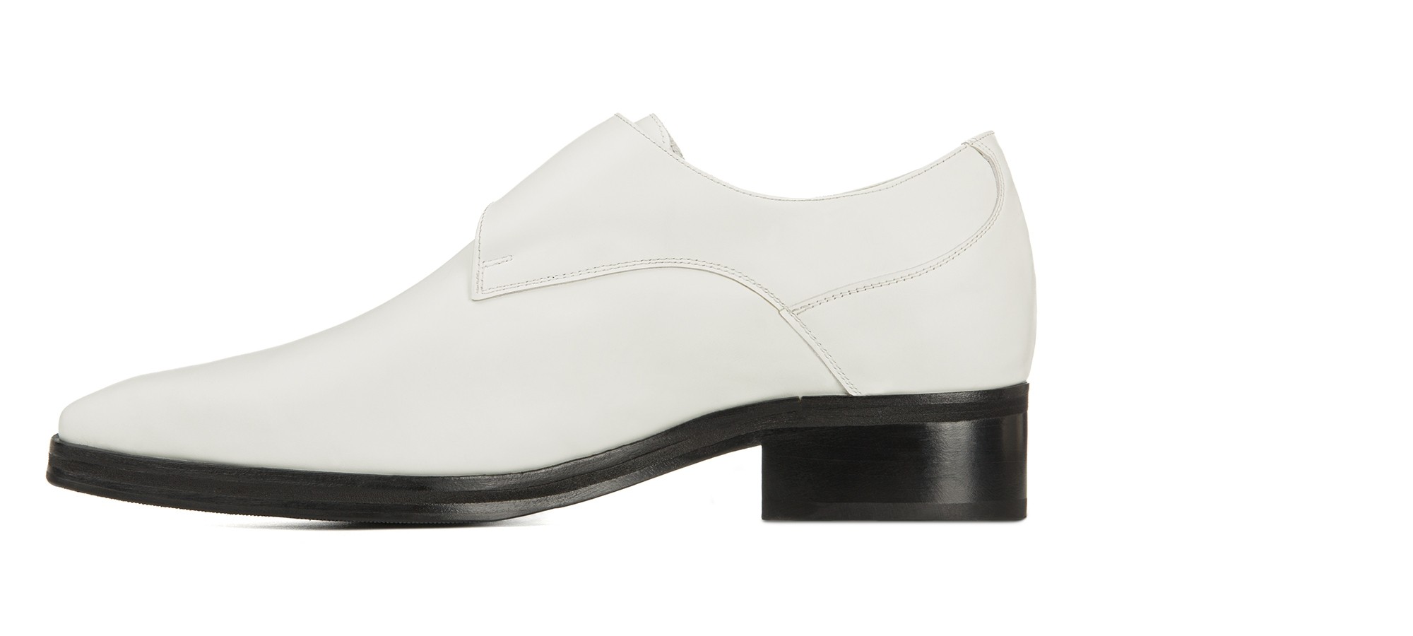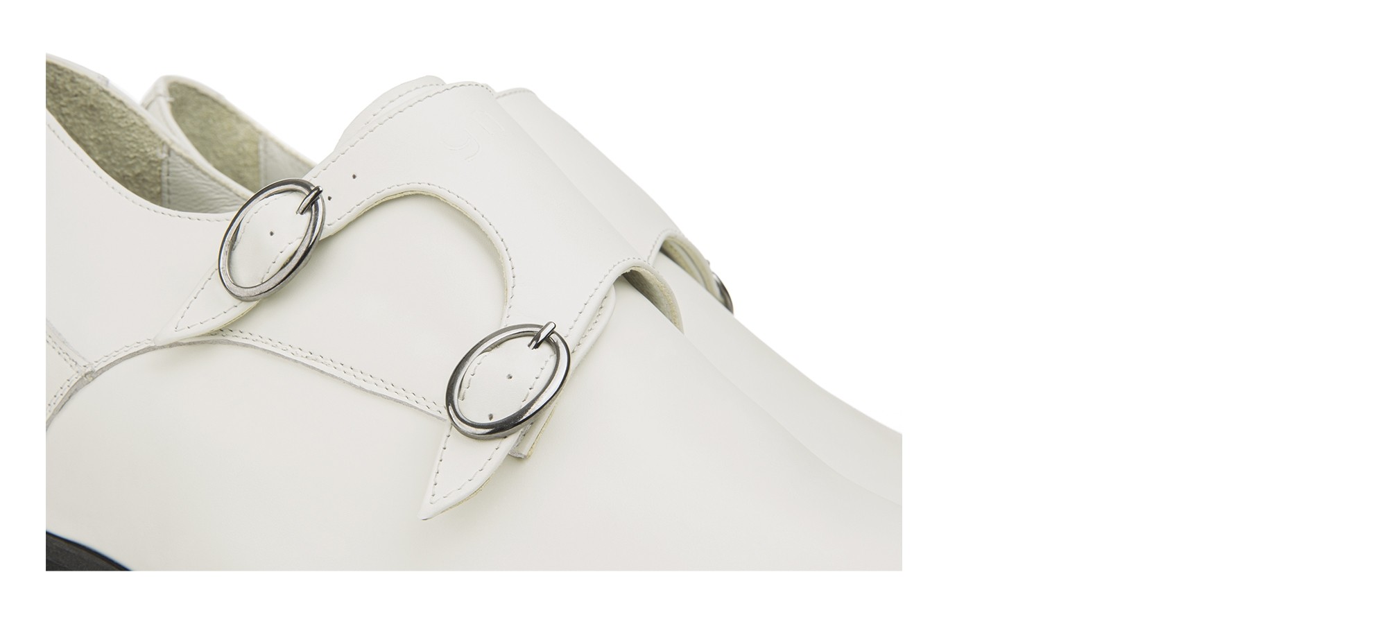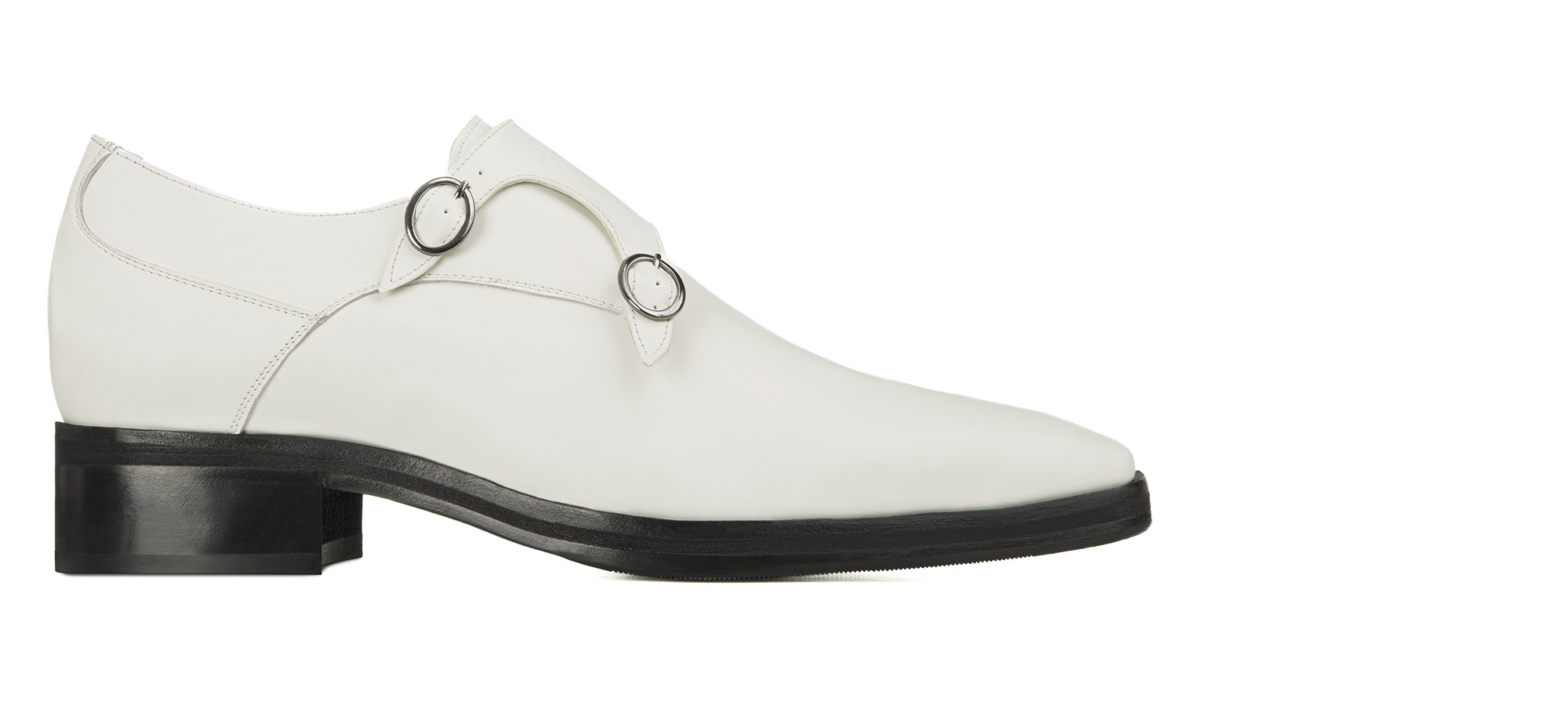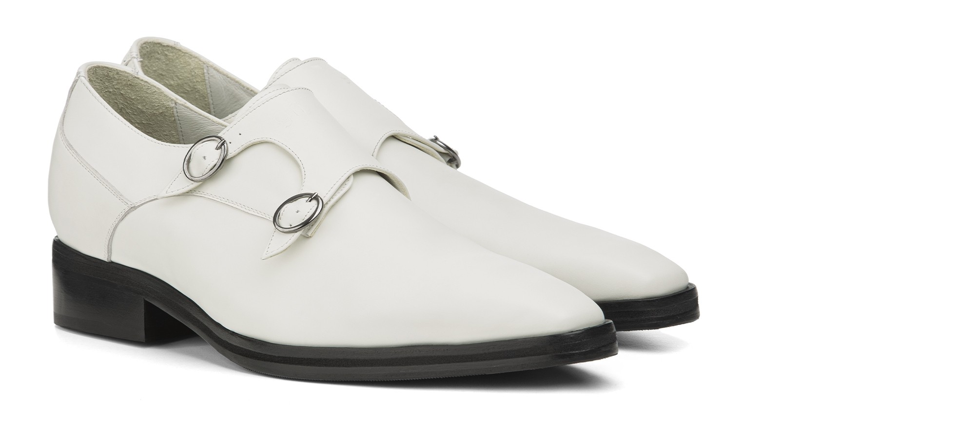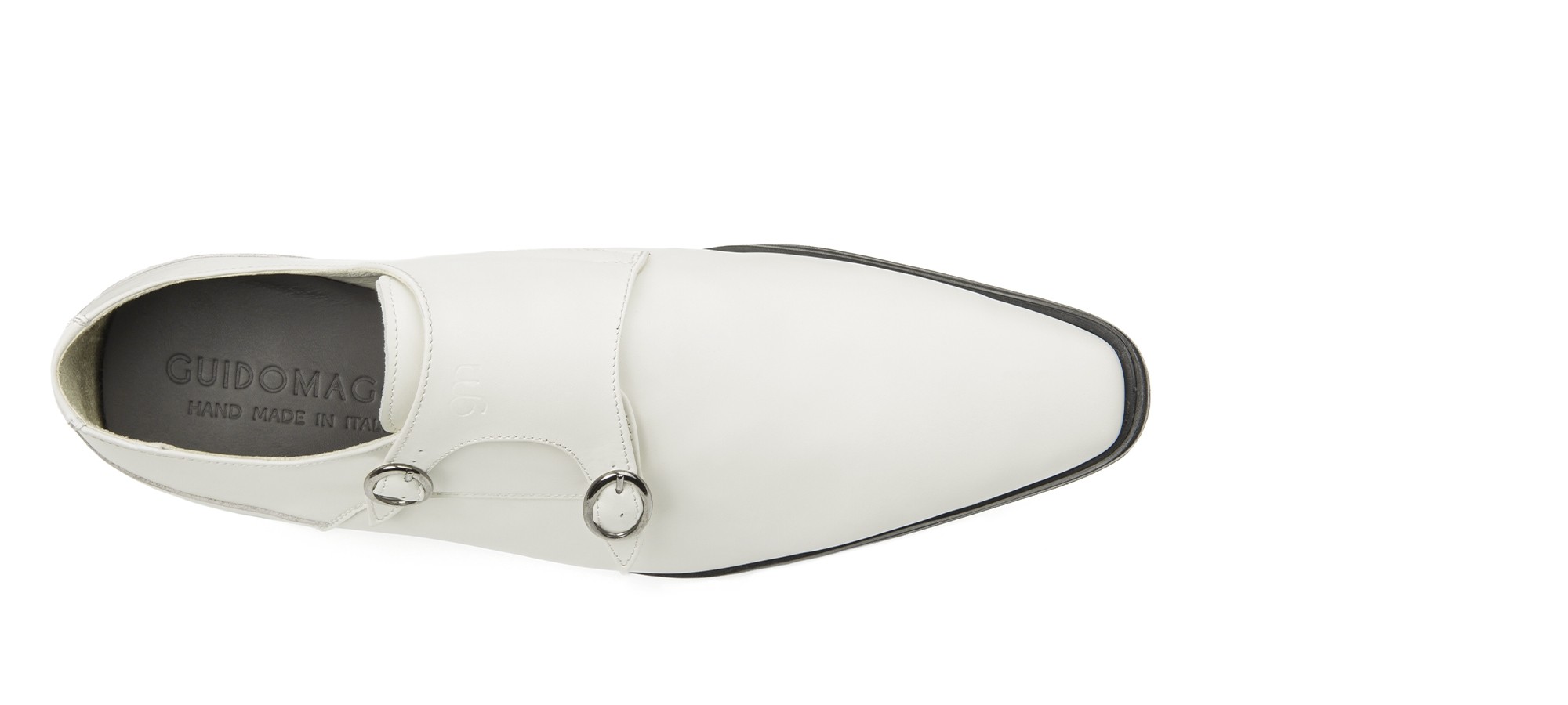 Stylish elevator doublemonk strap, a classic model featuring a white full-grain leather upper. With rounder silver buckles and square toe, it's ideal for the warm season. The sole, in contrasting black, is in 100% Italian leather.