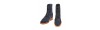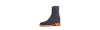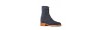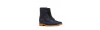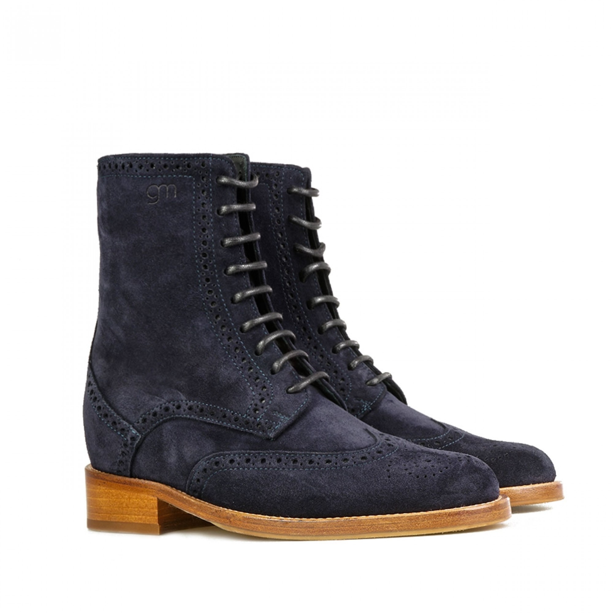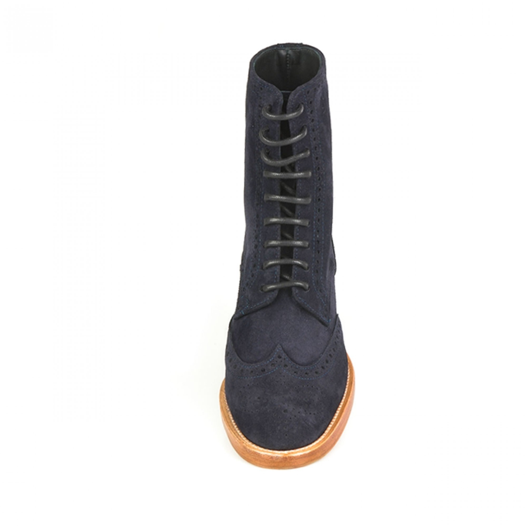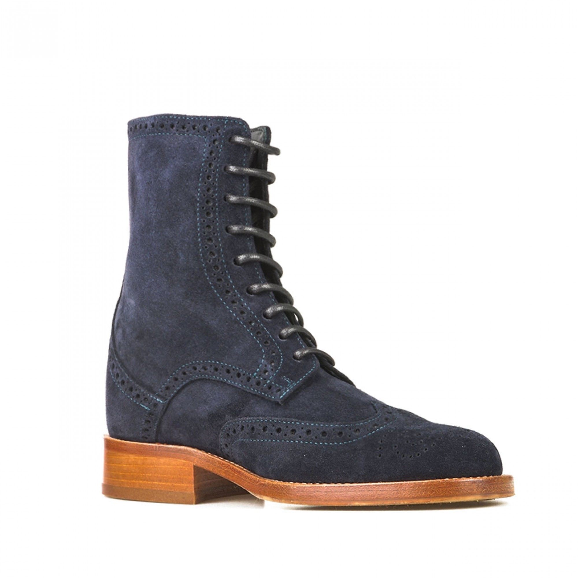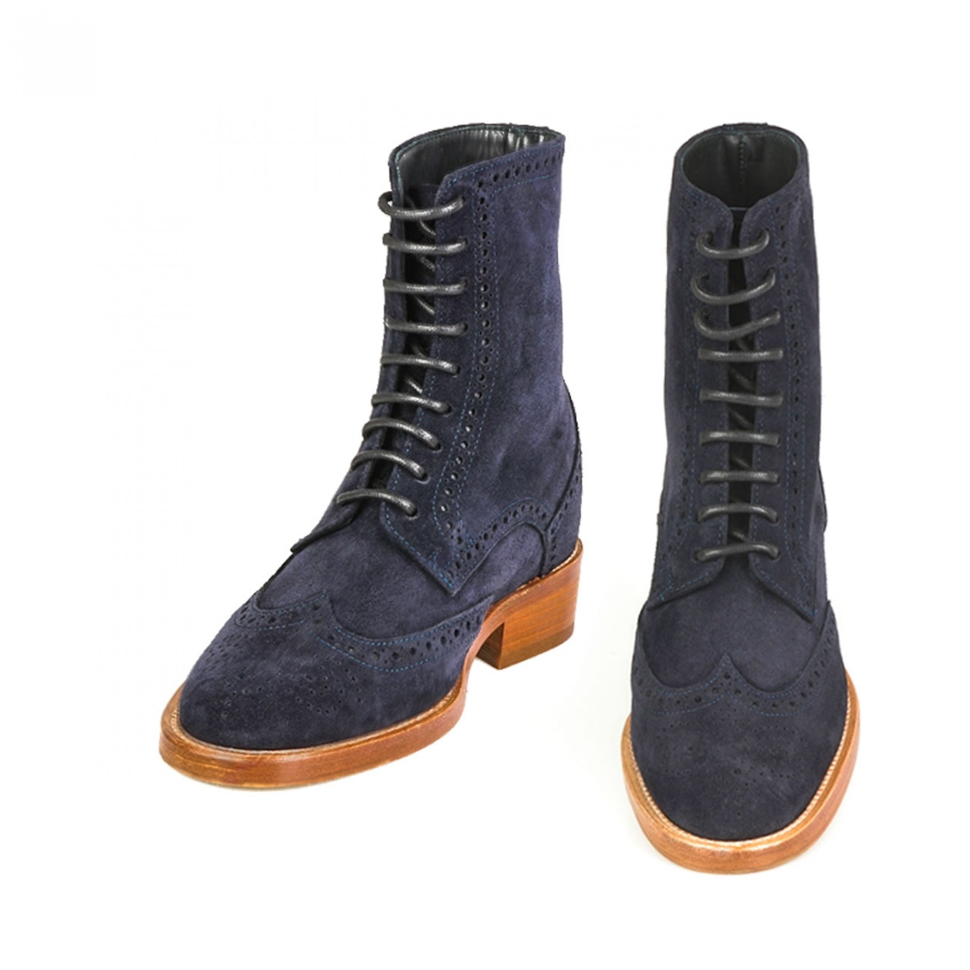 Height increasing boot with upper made of navy blue suede and stiched leather sole with anti slip rubber.