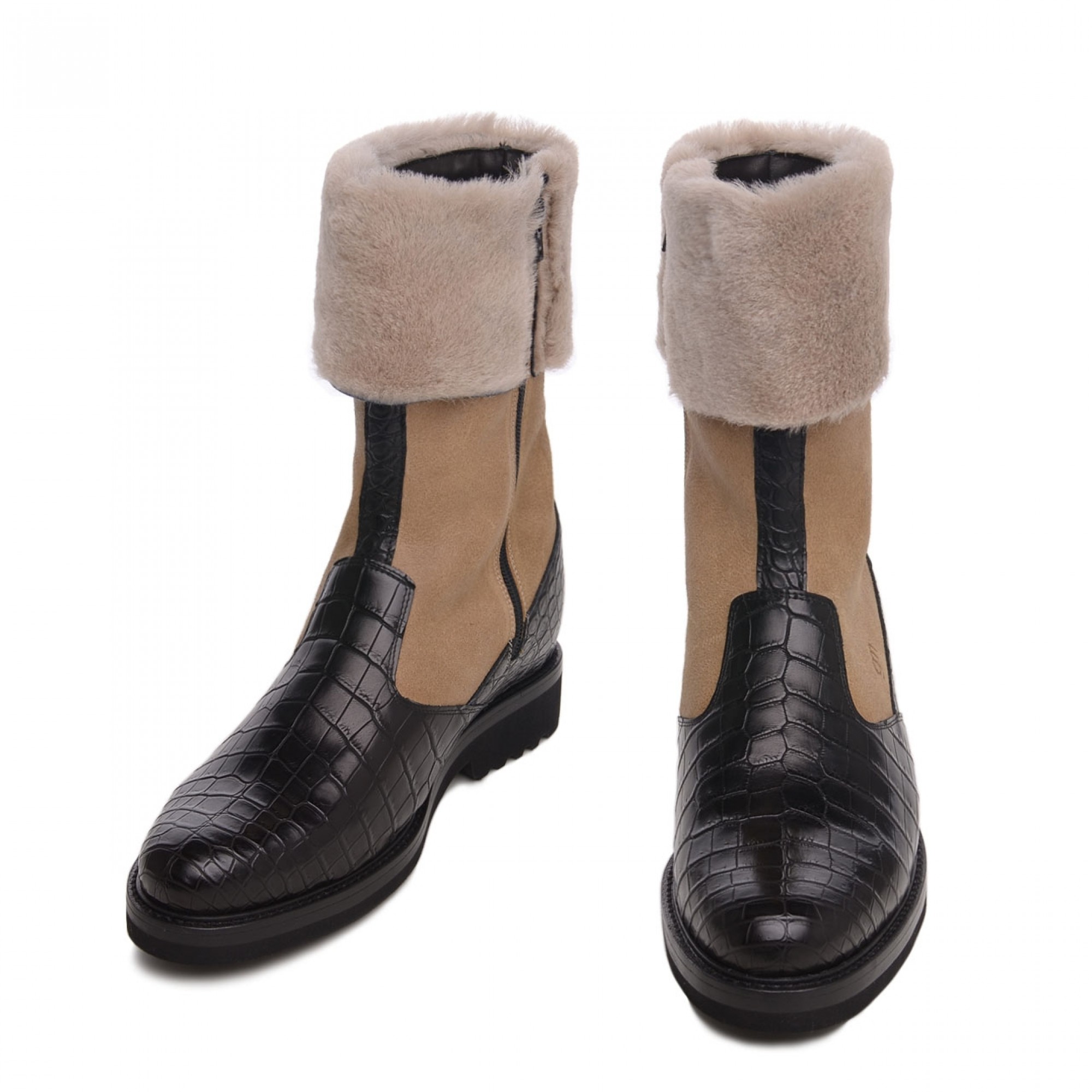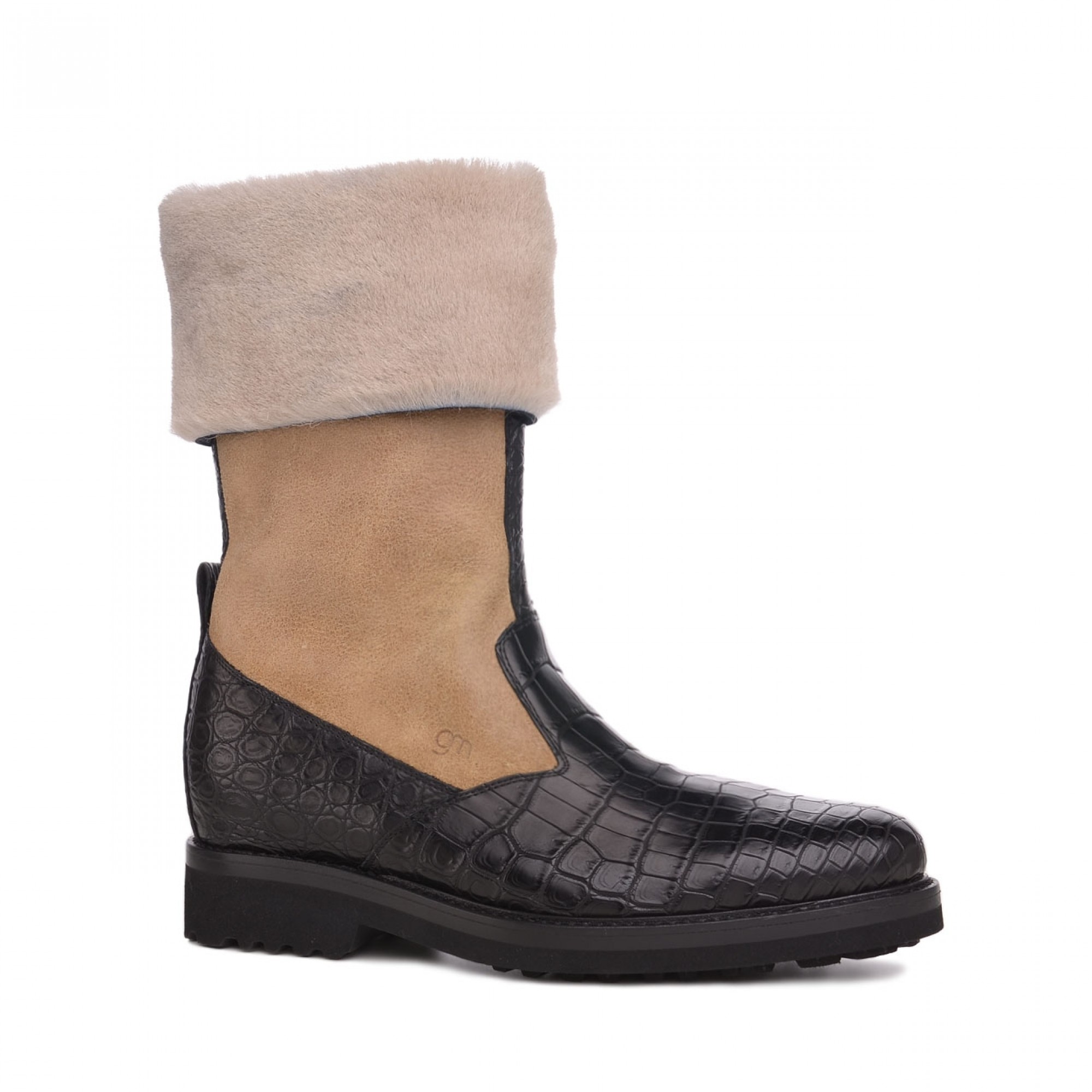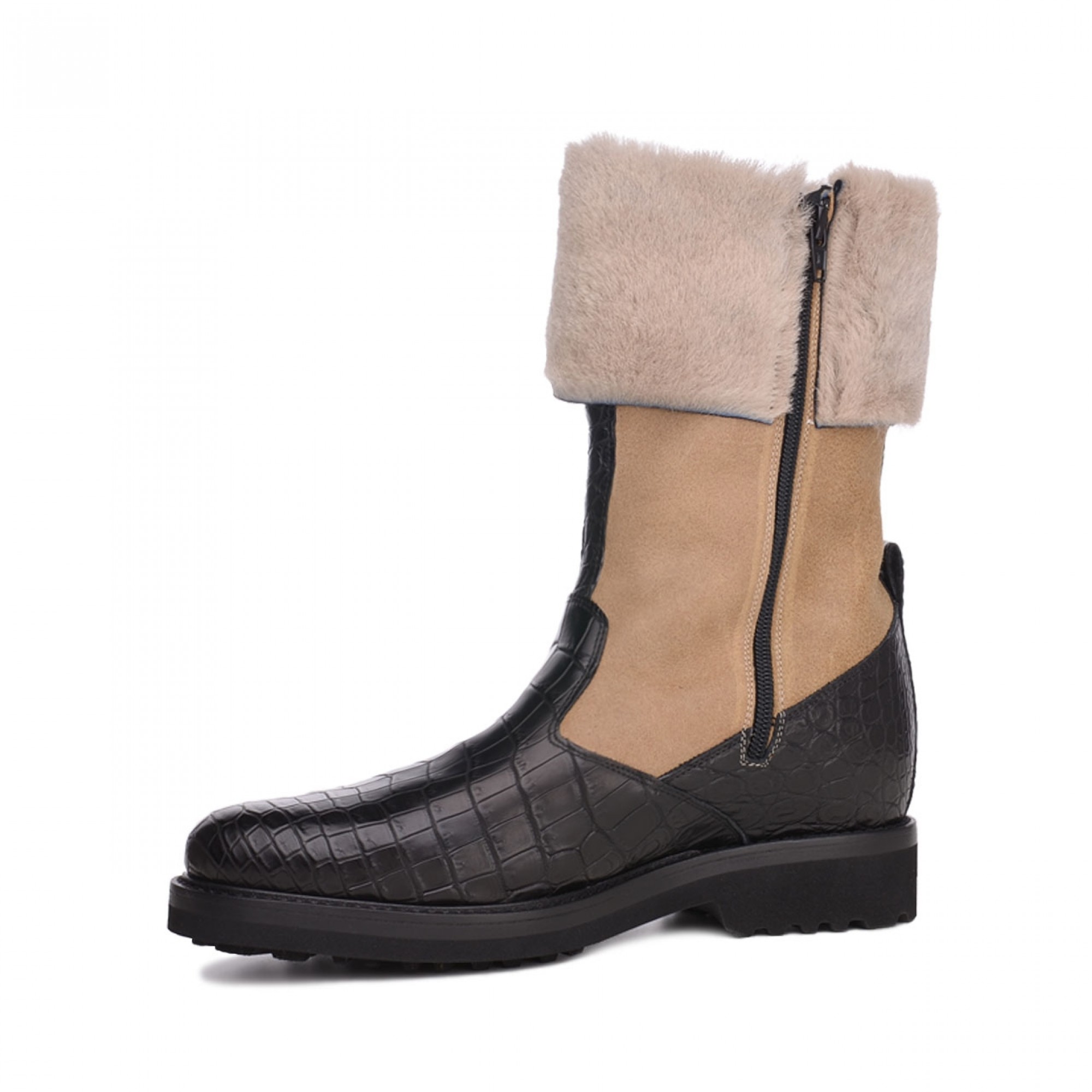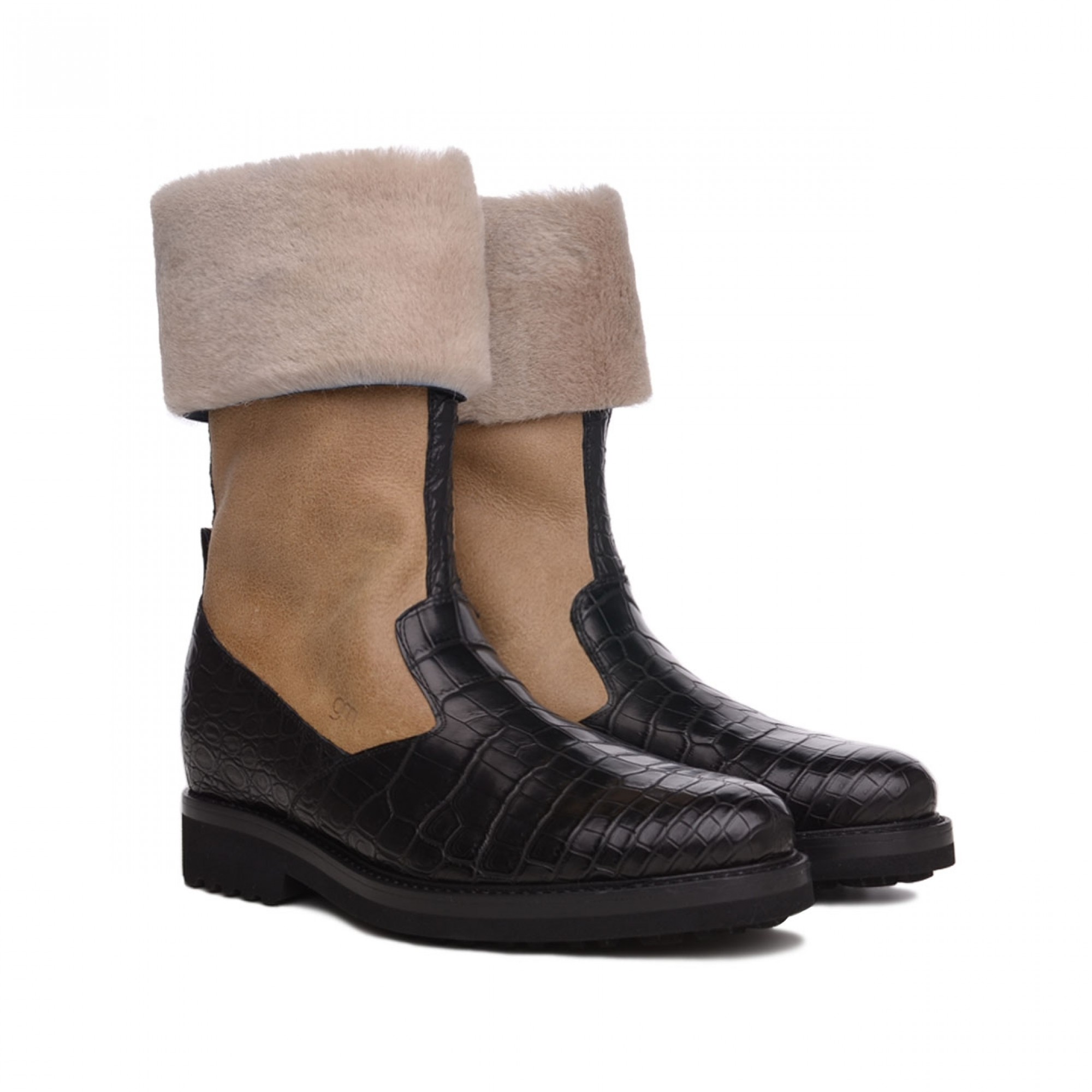Exclusive elevator boots able to increase height up to 4 inches (10 cm) featuring upper in fine dark brown Hermès crocodile leather and shaft in light brown Tuscan full grain leather. The sheepskin collar will keep you warm in the coldest winter days. The ultra-lightweight natural rubber sole is non-slip and allows a comfortable wallk even on icy roads. Handmade in Italy.