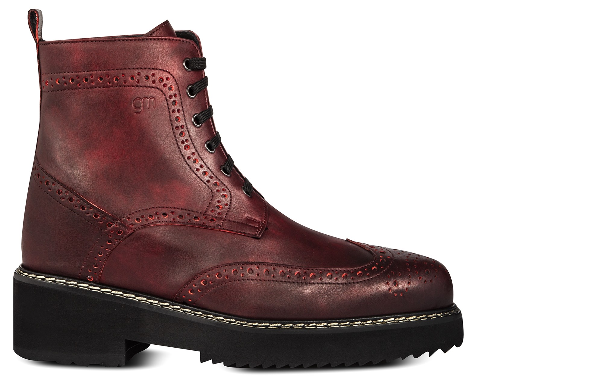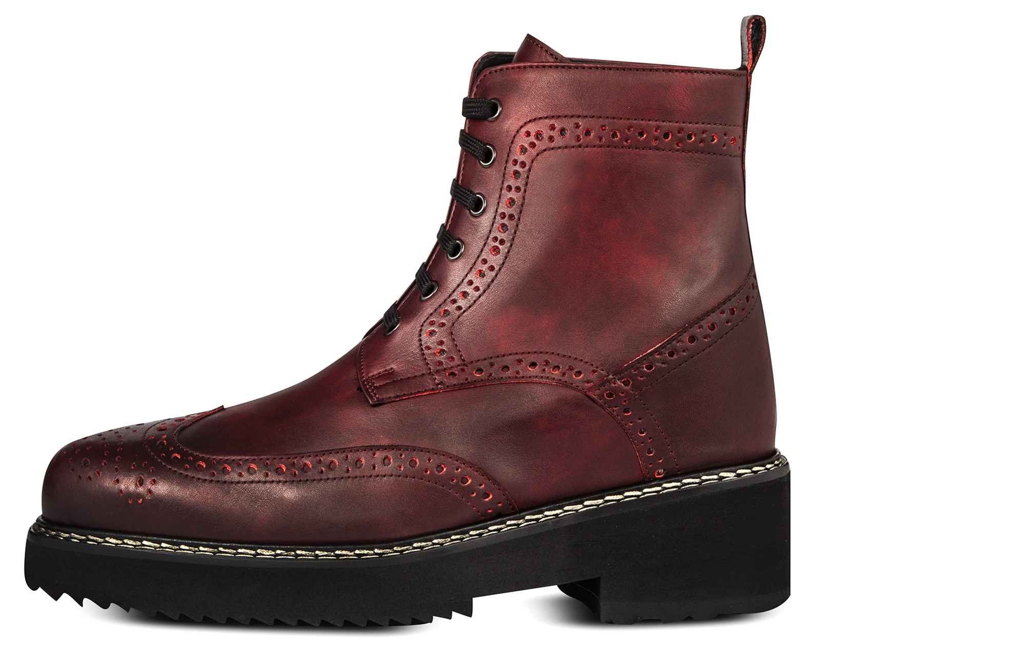 Upper in bordeaux red full grain leather. Lining in soft goatskin. Insole and midsole in genuine leather. Cotton waxed shoe laces. Handcrafted, anti-slip rubber sole. Height increase: 4 in(10cm) , 4.3 in(11cm), 5in(12.5cm), 5.3 in(13,5cm), 6 in (15cm). Hand Made in Italy