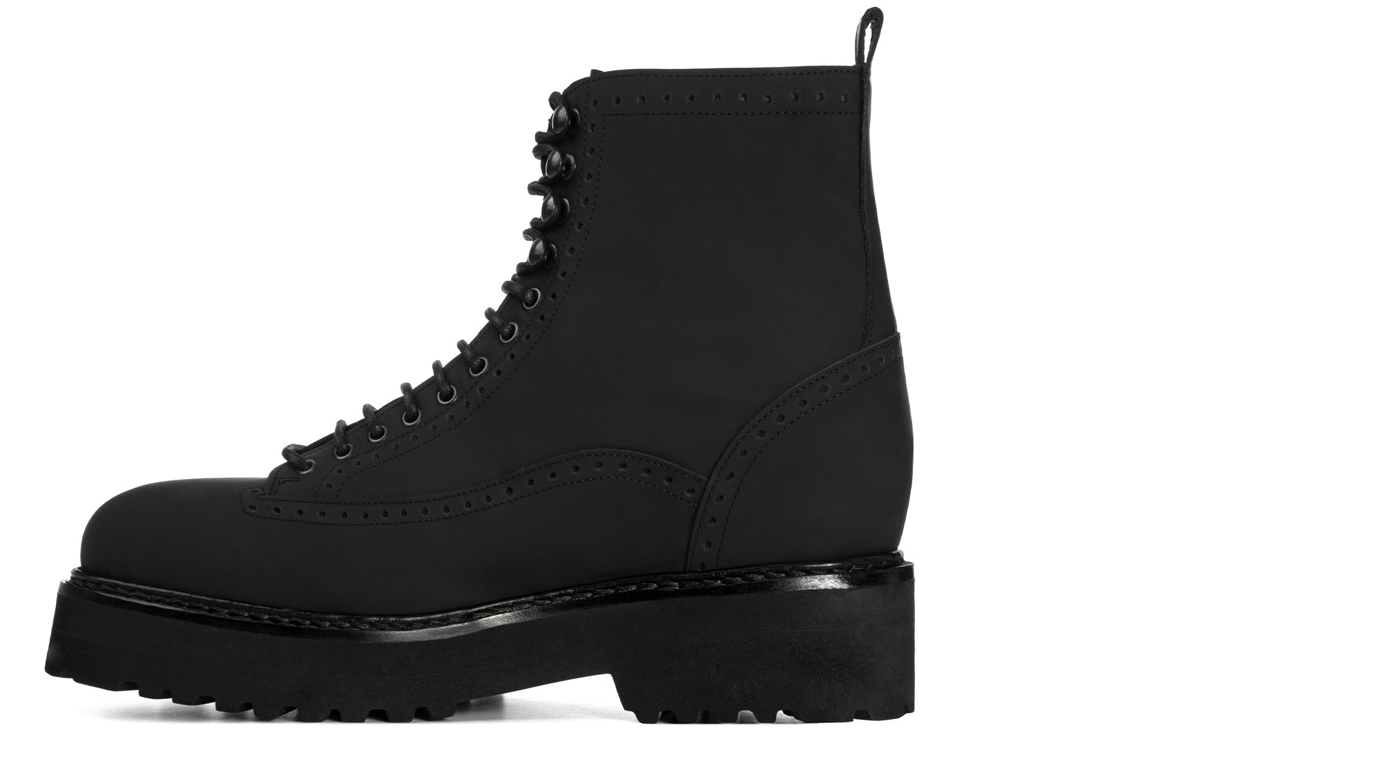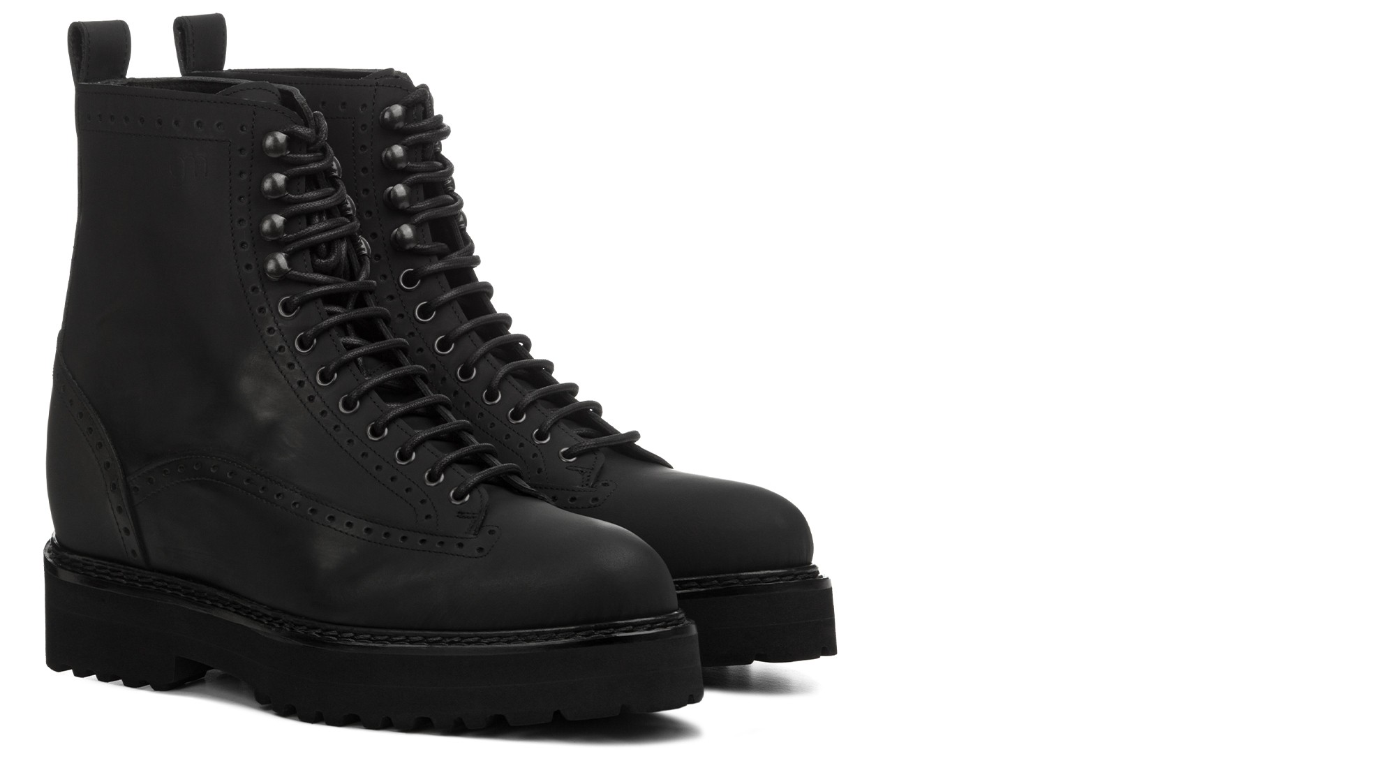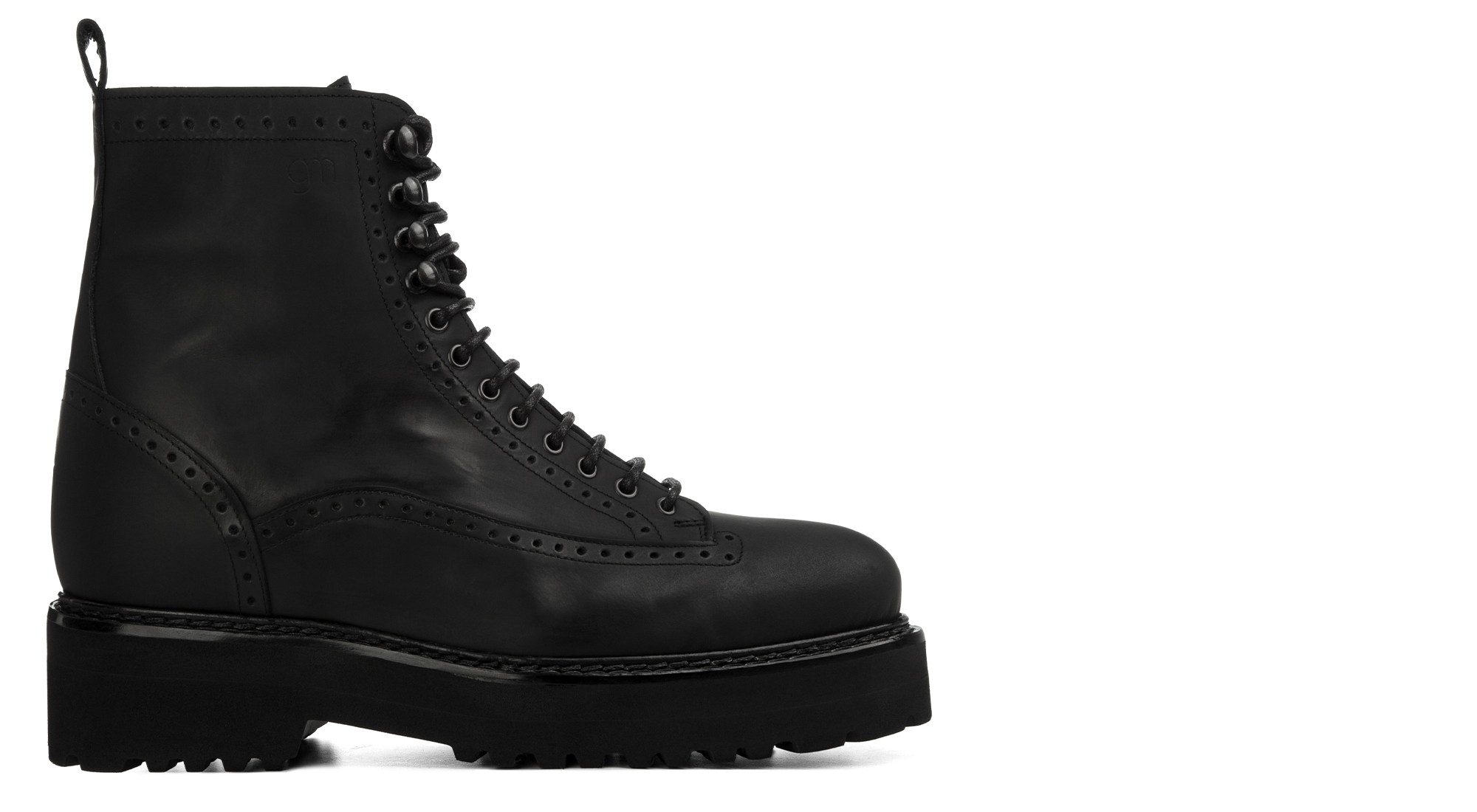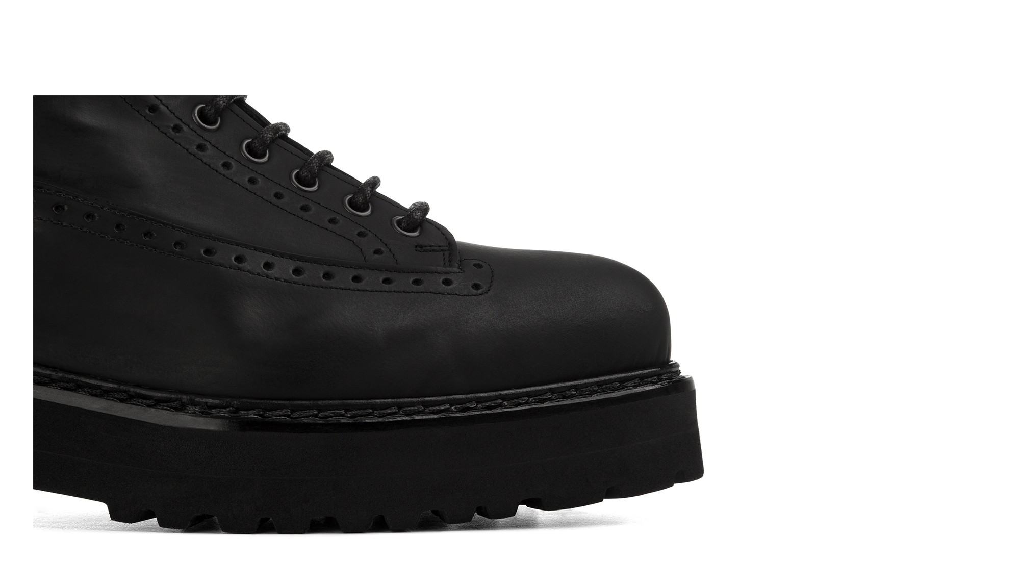 The Capannori combat boot is characterized by clean lines, brogue detailing and a striking all-black structure. Created for those seeking an urban-luxury style, it features an internal elevator system that significantly increases the wearer's height by up to 6 inches without altering the boot's aesthetic. These GuidoMaggi boots are ideal for a bold, contemporary look rooted in artisanal excellence.