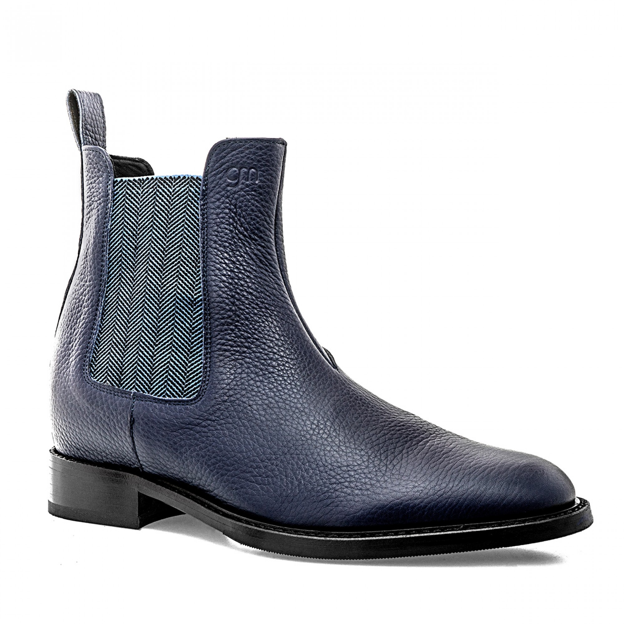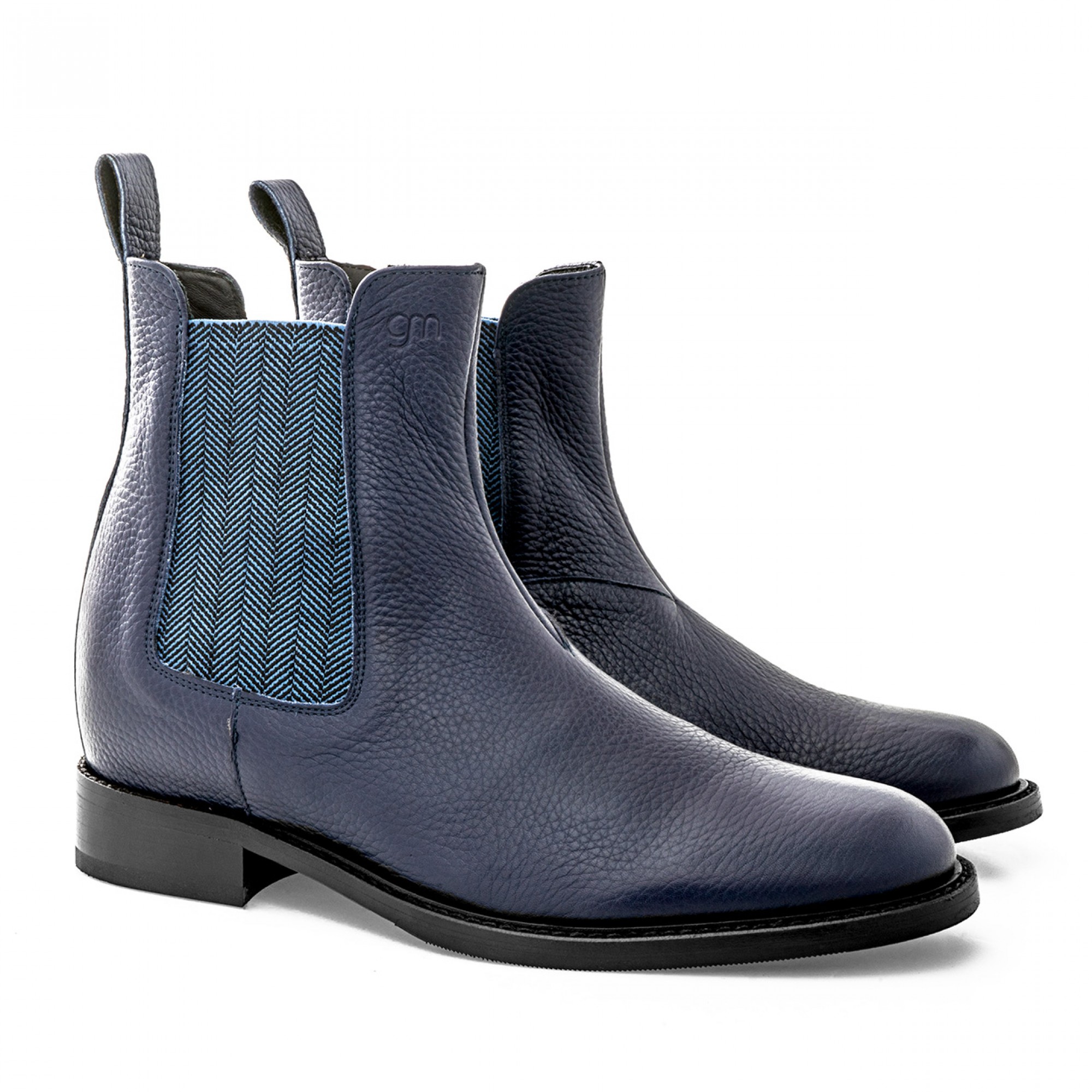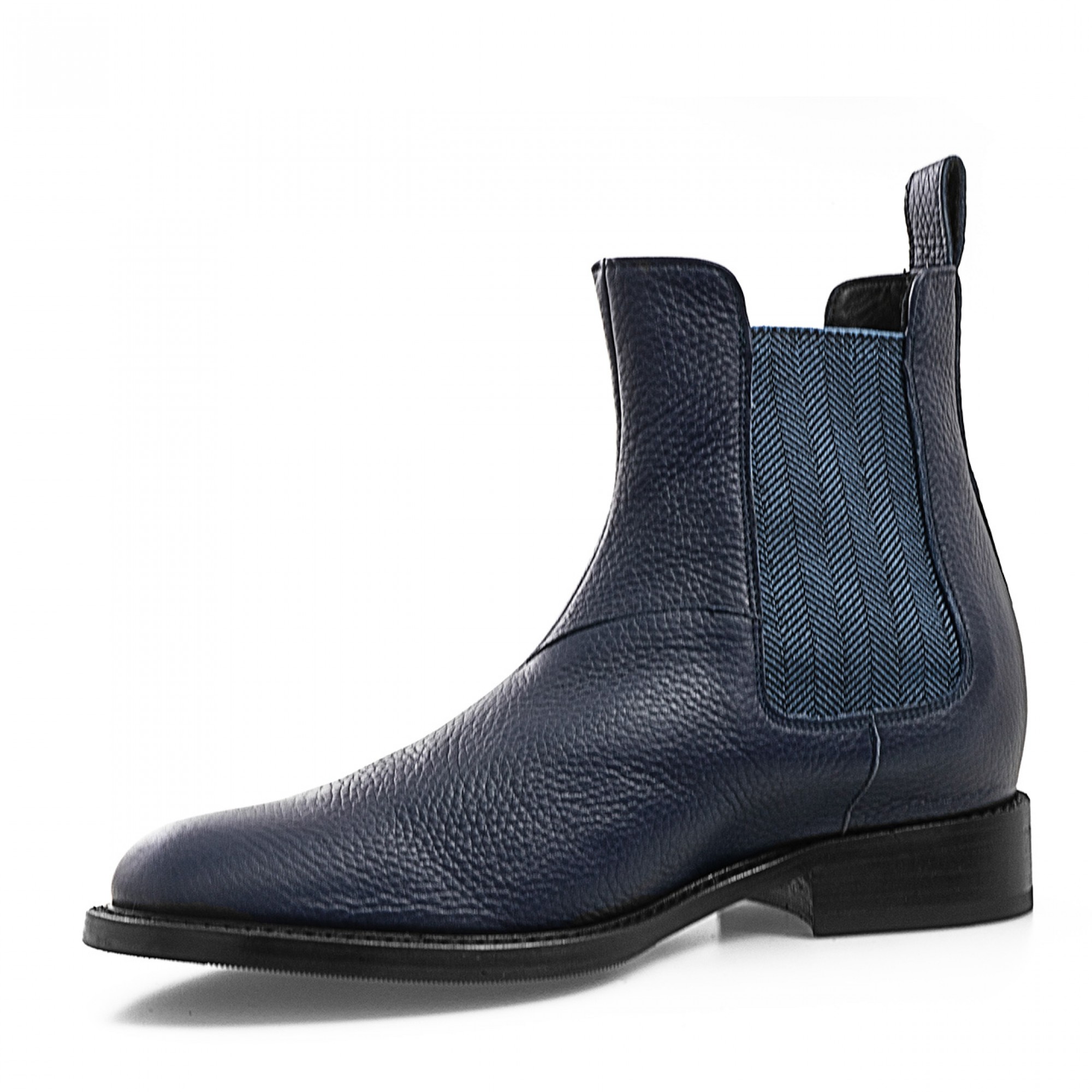 Elevator beatle boots in fine blue navy tumbled calfskin, stiched leather sole with anti slip rubber and elastic bands details on the sides.