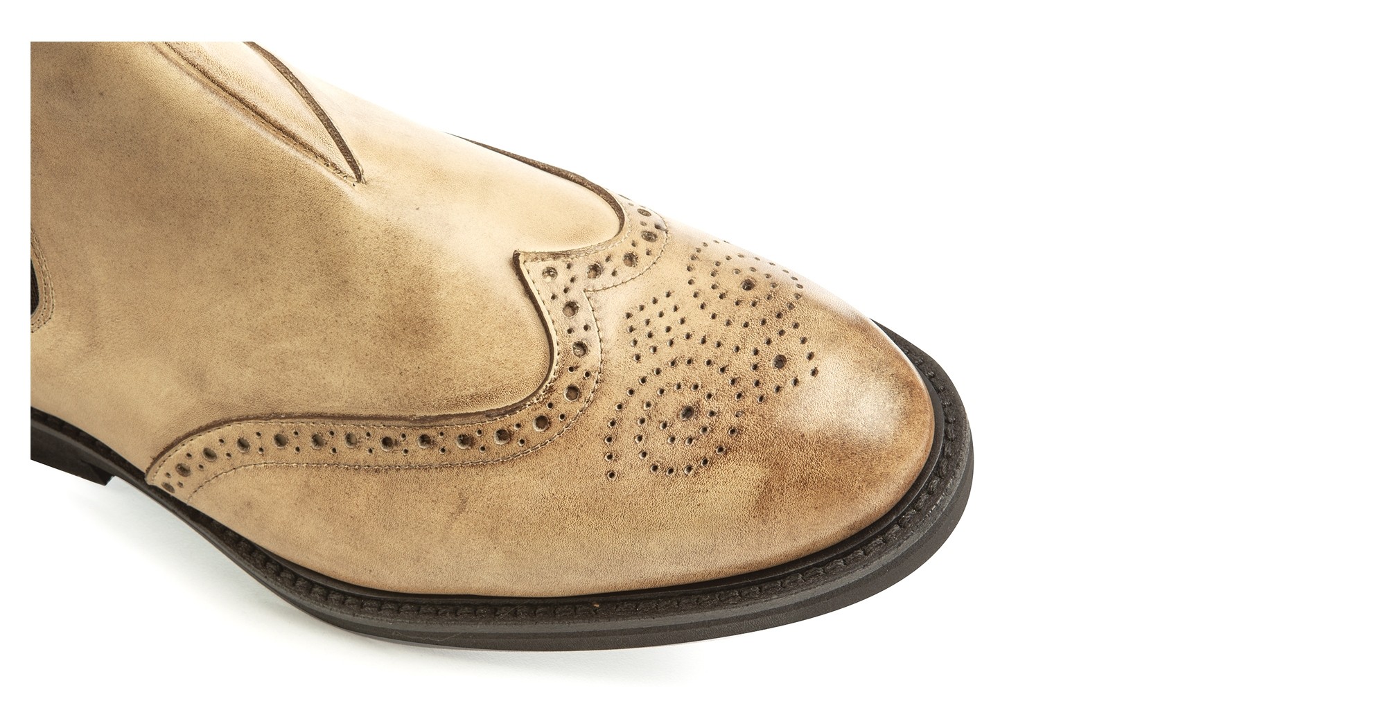 Elevator chelsea boot handmade in light brown burnished full-grain leather and comfortable Vibram rubber sole.