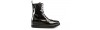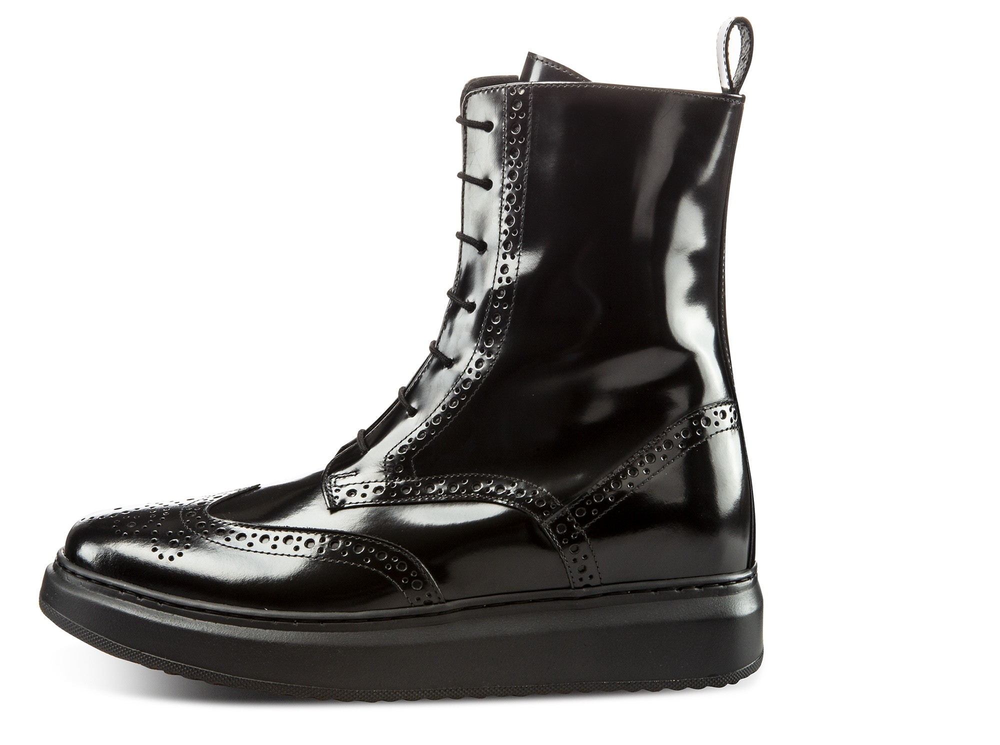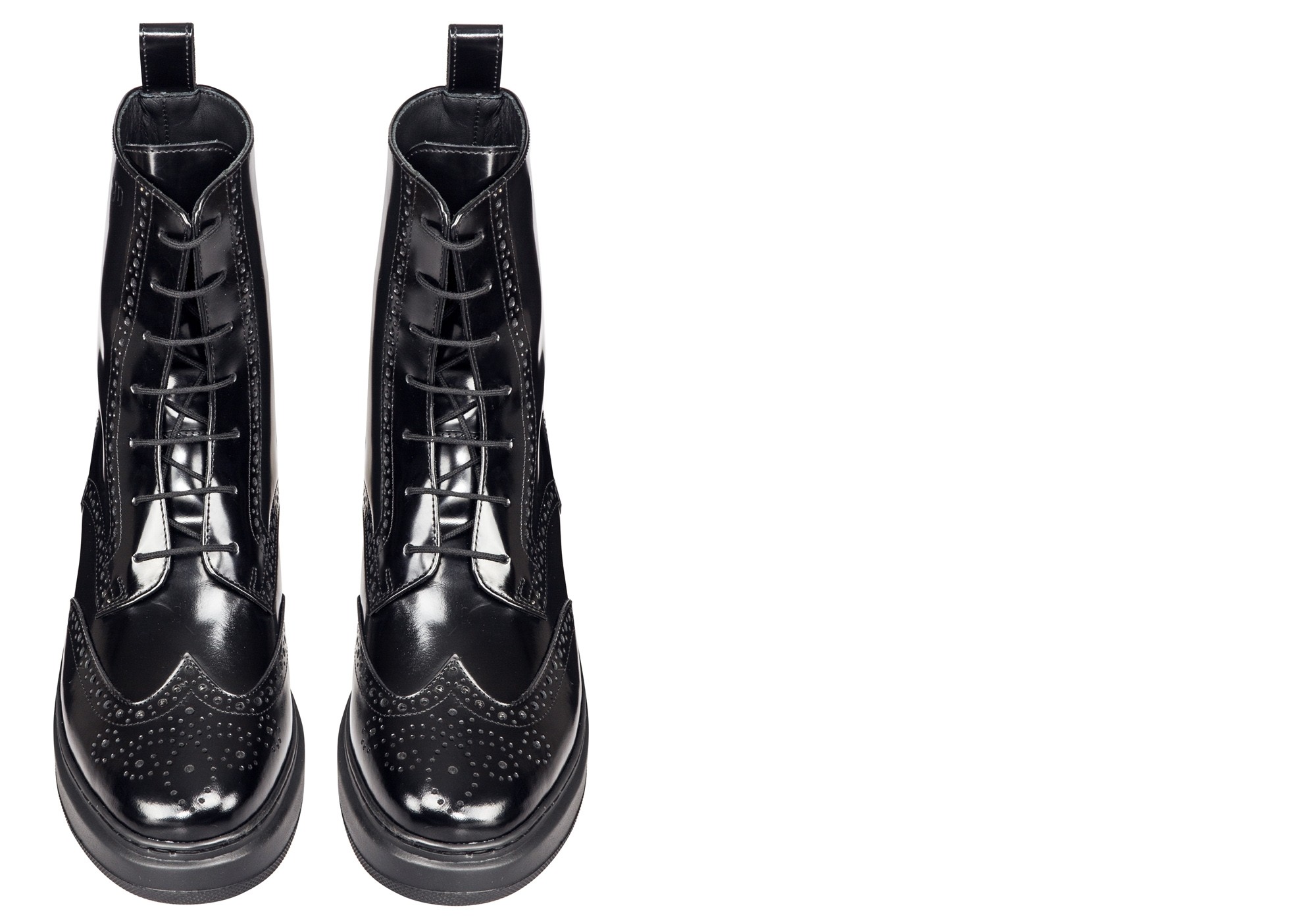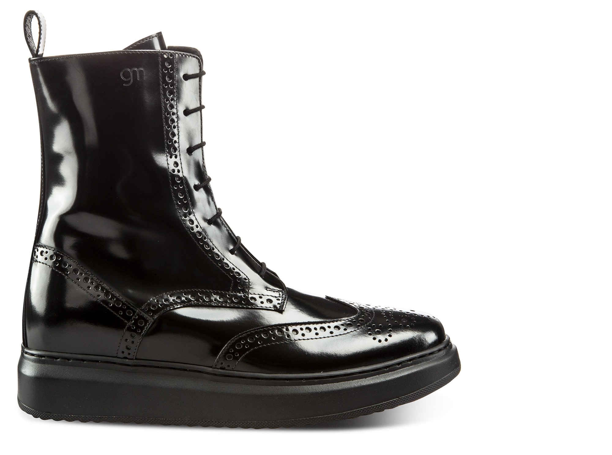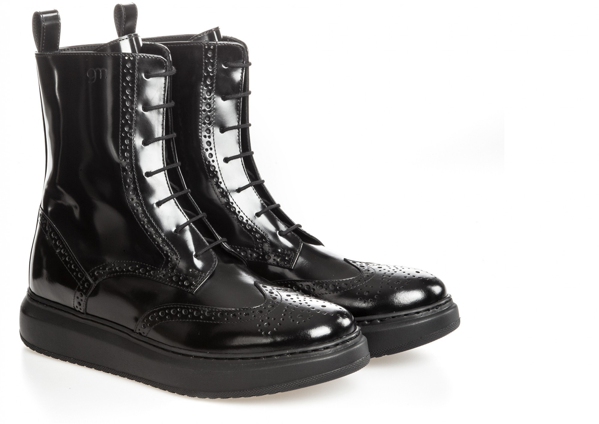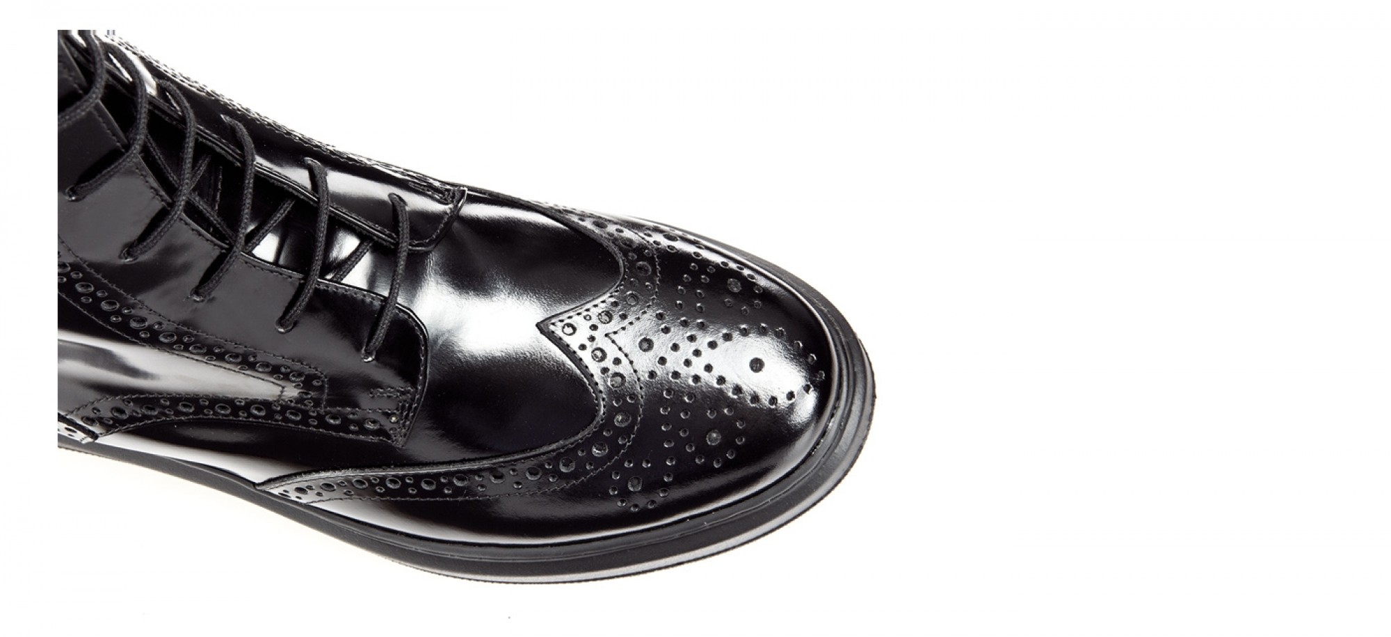 Elevator boots made of black brushed calfskin with a shiny effect featuring full brogue decoration punched by hand. Ultralight rubber sole.