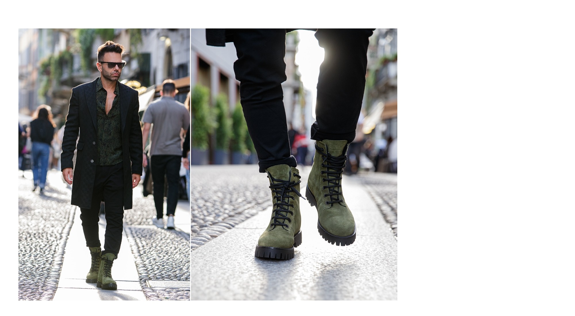 Elevator combat boots with upper made of green suede, soft sheepkin lining and striped sole in super-light rubber.