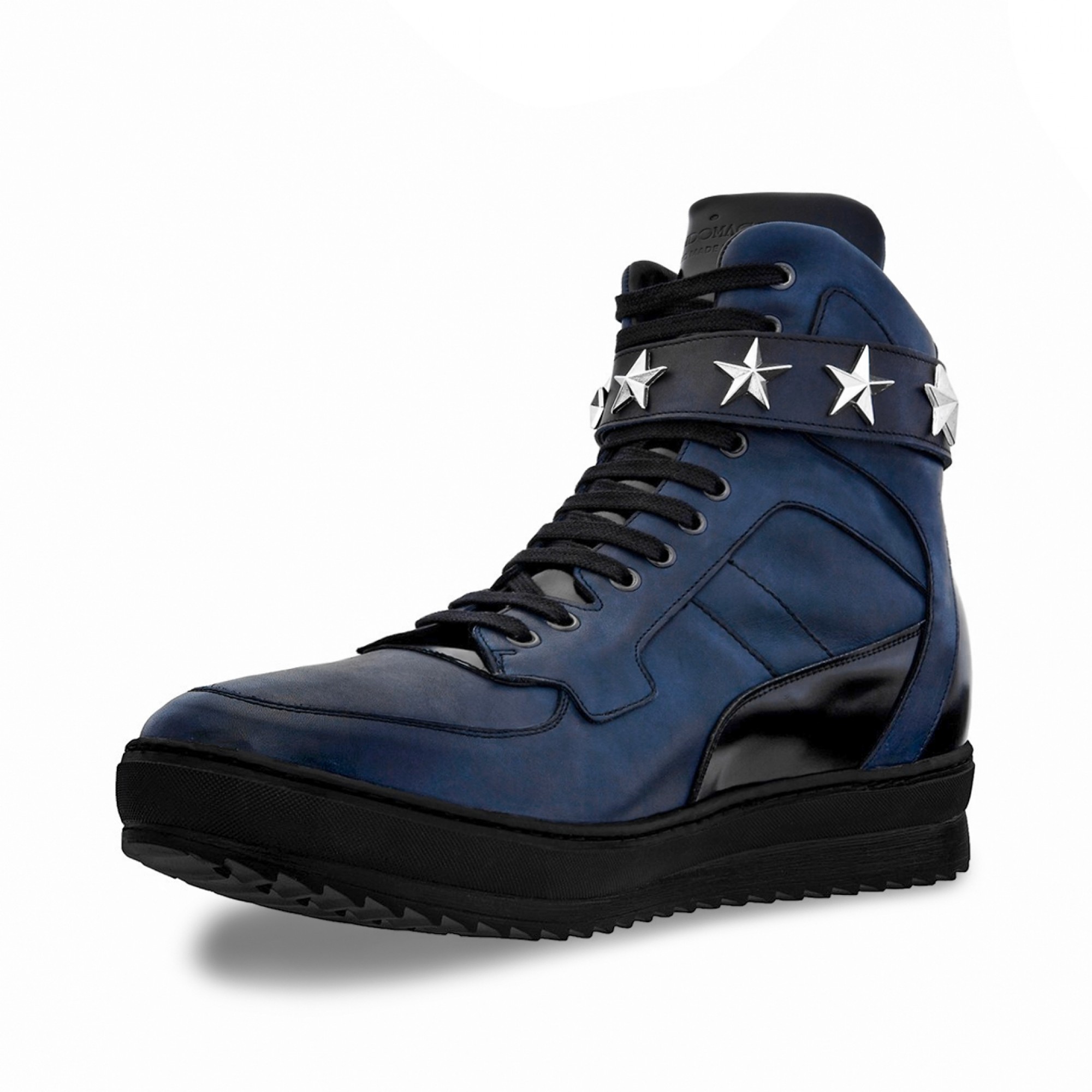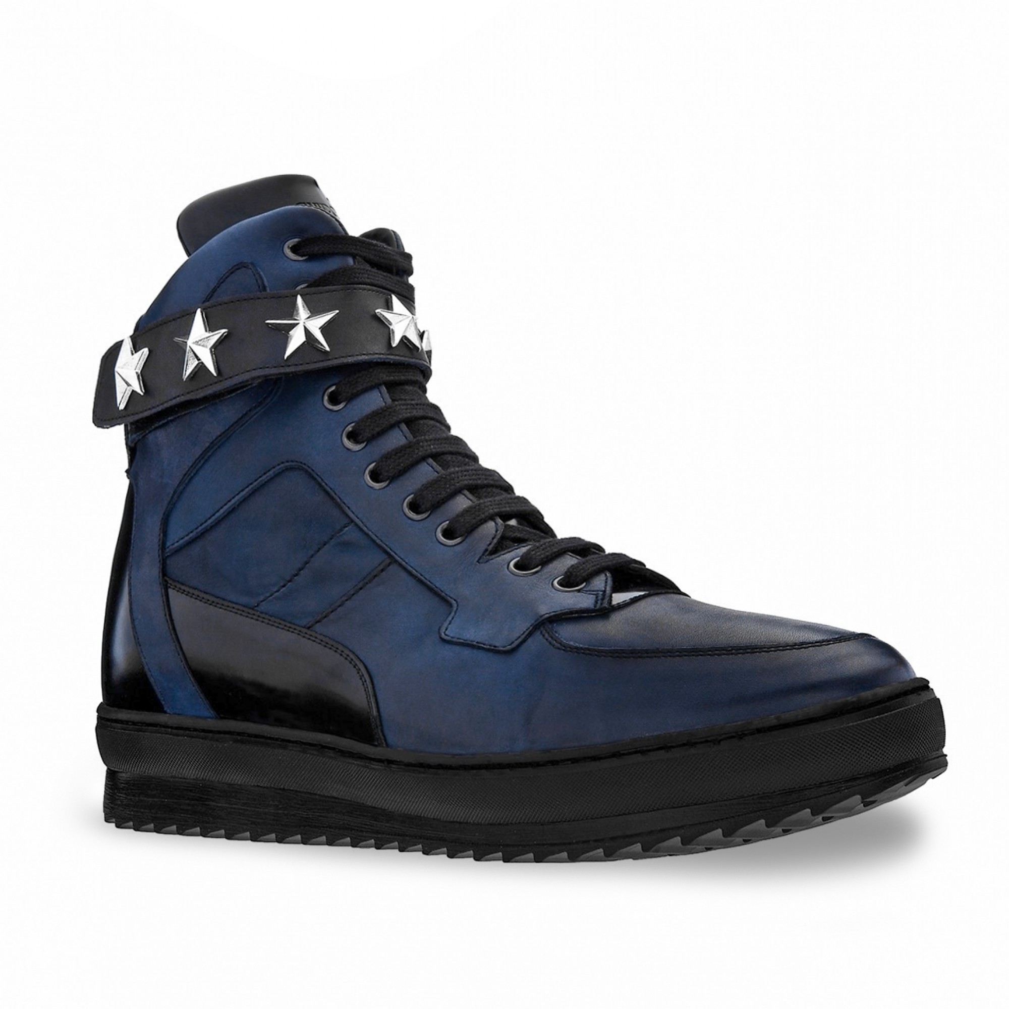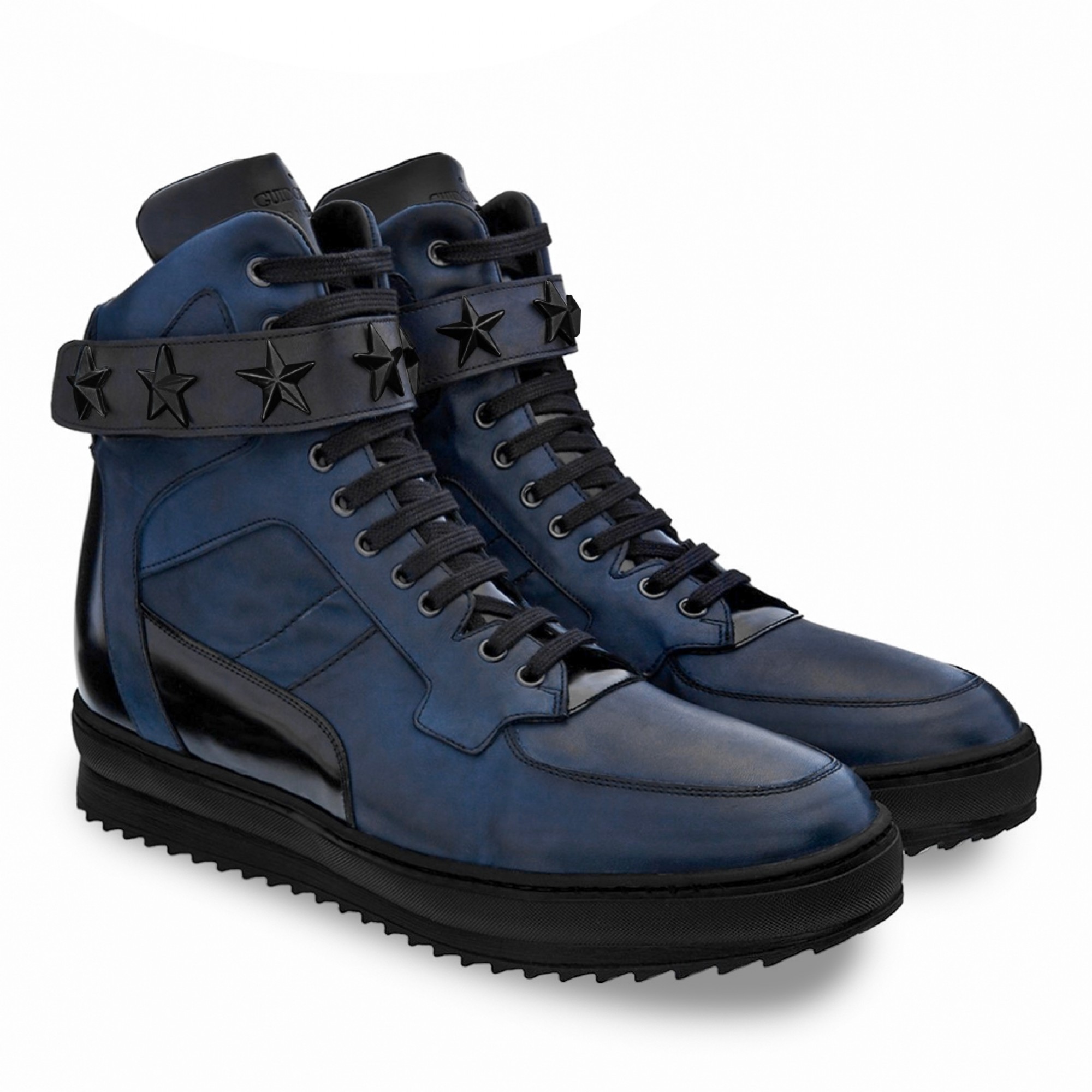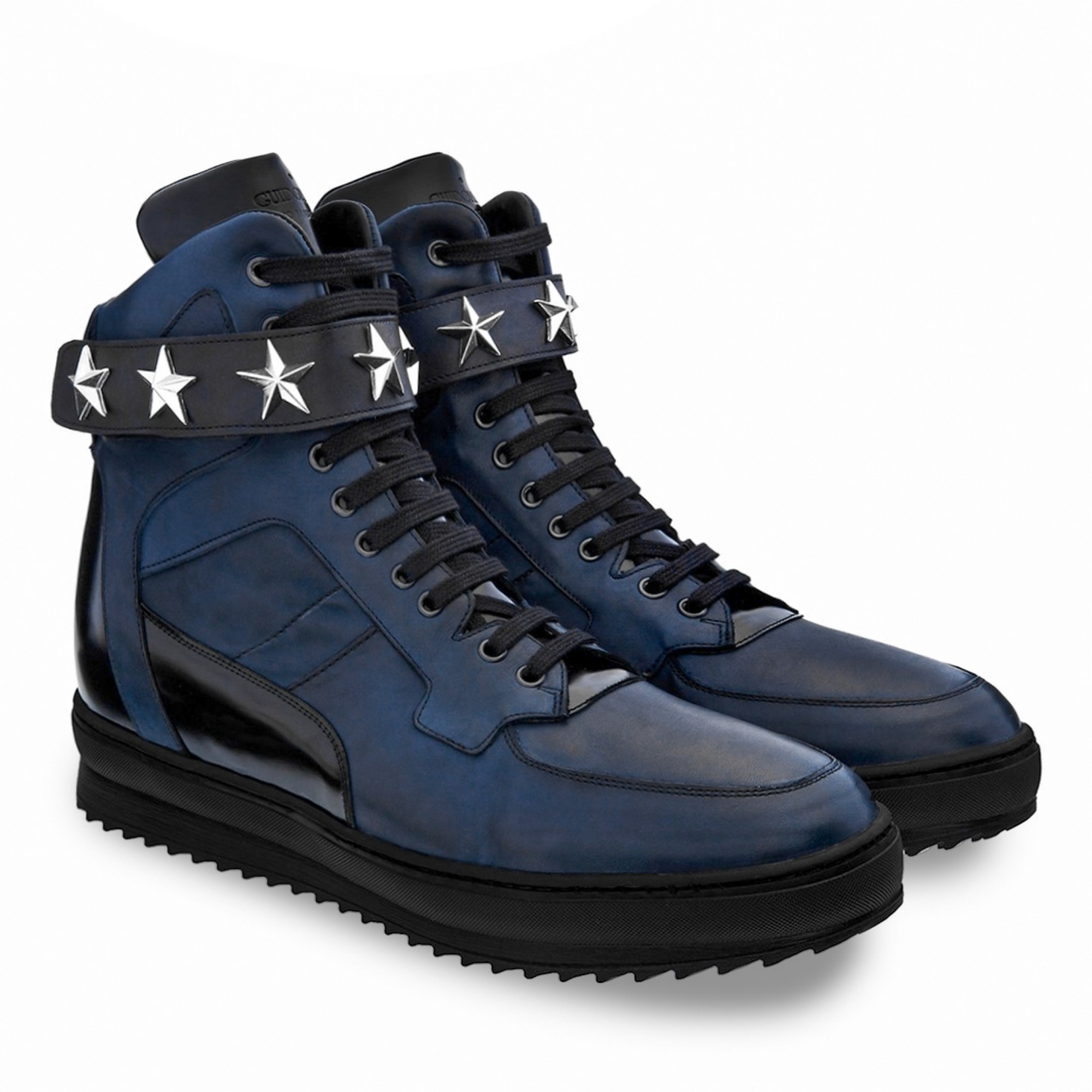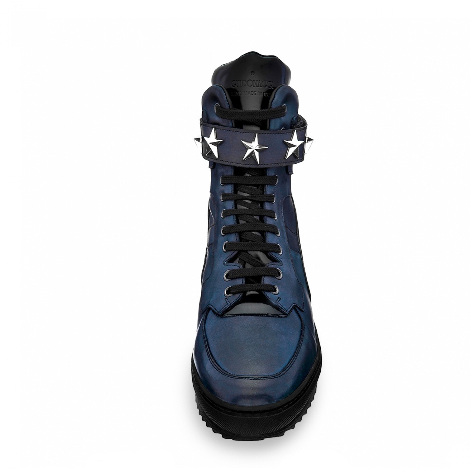 Upper in blue navy full grain leather and shiny blue calfskin. Lining in soft goatskin. Insole in genuine leather. Lightweight high quality rubber outsole anti-slip. Height increase: 2.4in(6cm), 2.75in(7cm), 3.1in(8cm) or 4 in(10cm). Hand Made in Italy