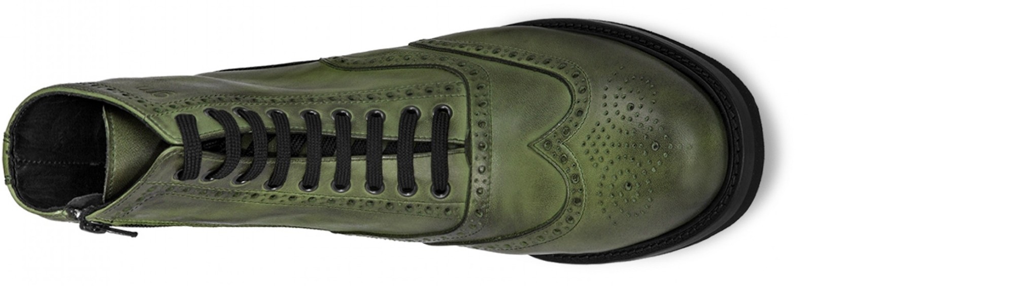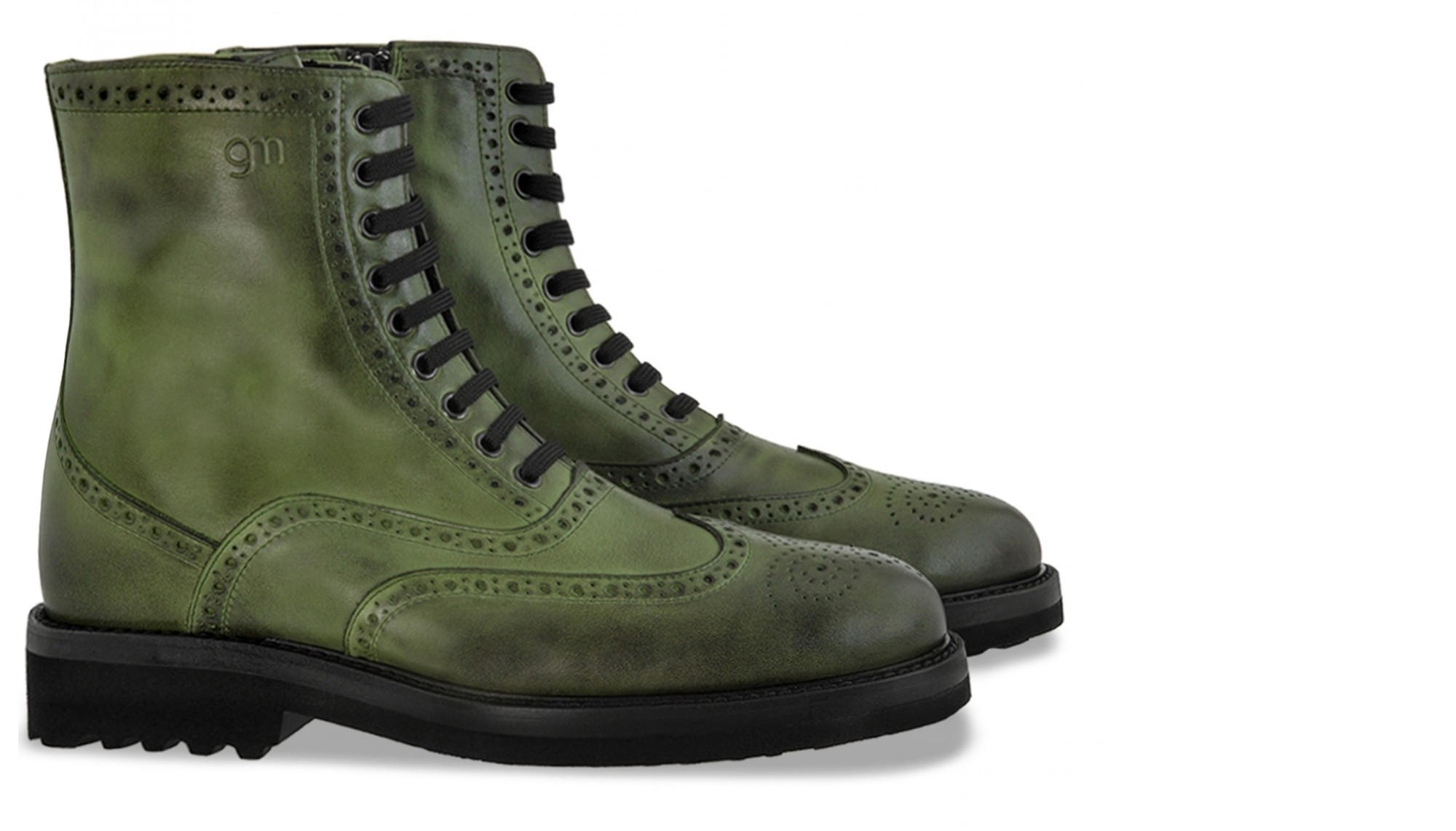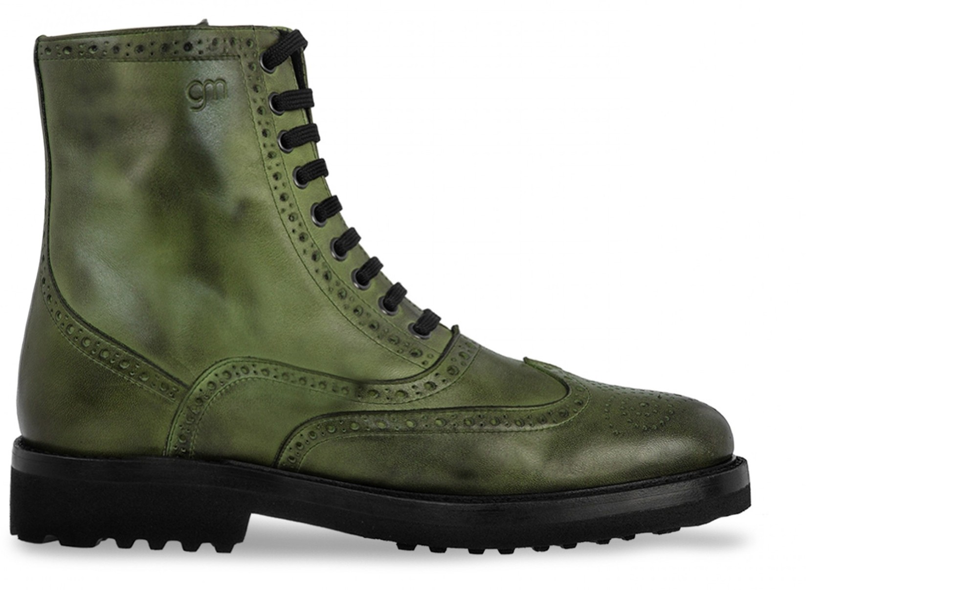 Handcrafted elevator boots with upper made of calf leather painted by hand featuring “deep mint” green nuance and durable black sole made of super light rubber. The full brogue punched by hand adds character to the wearer's style.