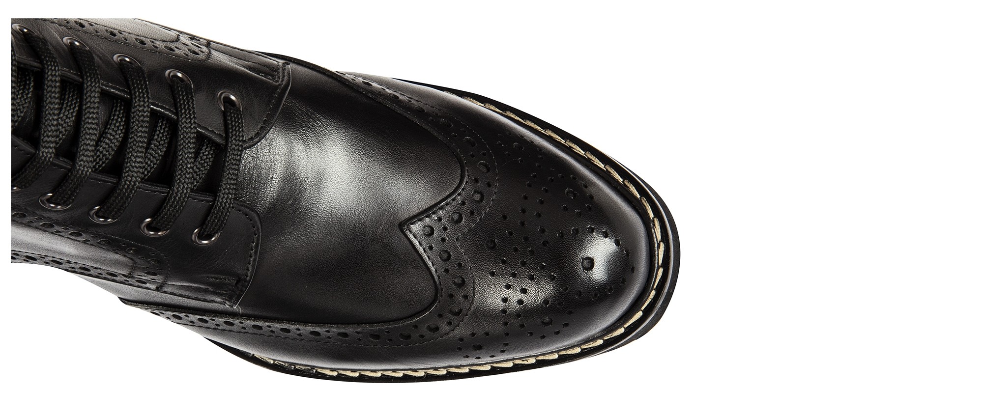Upper in black full grain leather. Lining in soft goatskin. Insole and midsole in genuine leather. Cotton waxed shoe laces. Handcrafted, anti-slip rubber sole. Height increase: 4 in(10cm) , 4.3 in(11cm), 5in(12.5cm), 5.3 in(13,5cm), 6 in (15cm). Hand Made in Italy