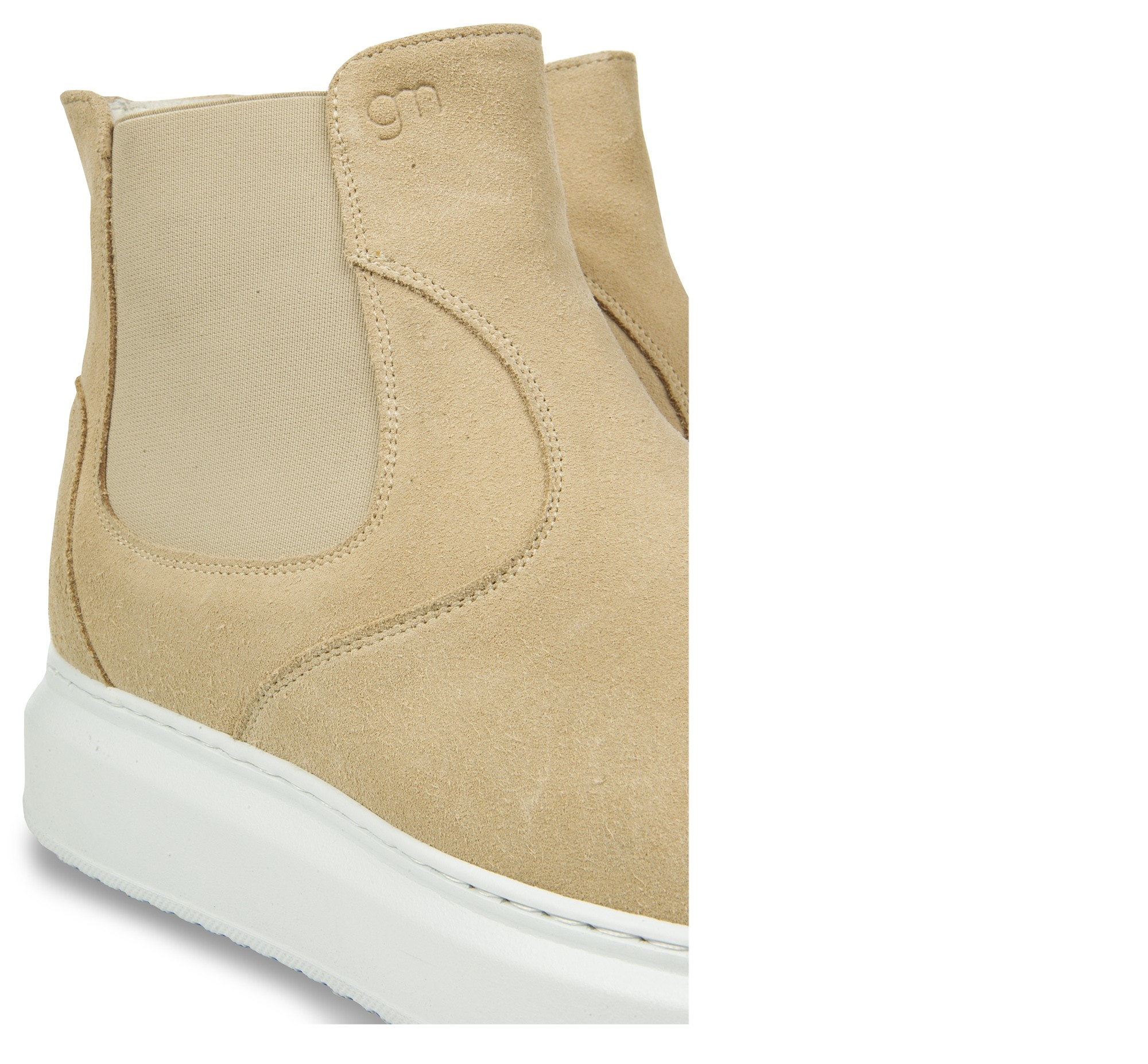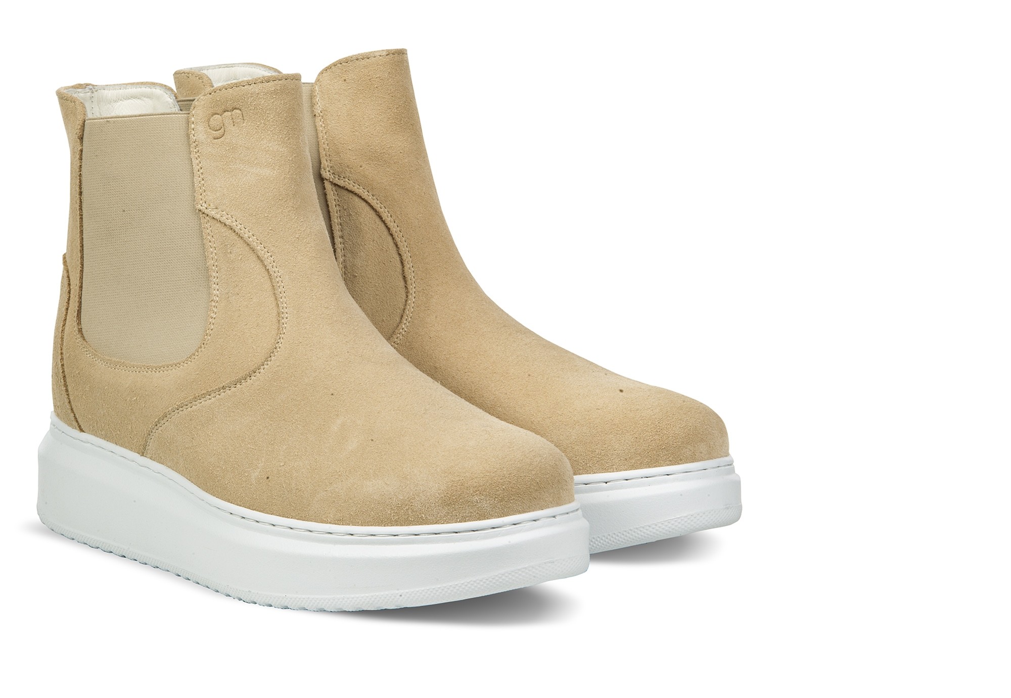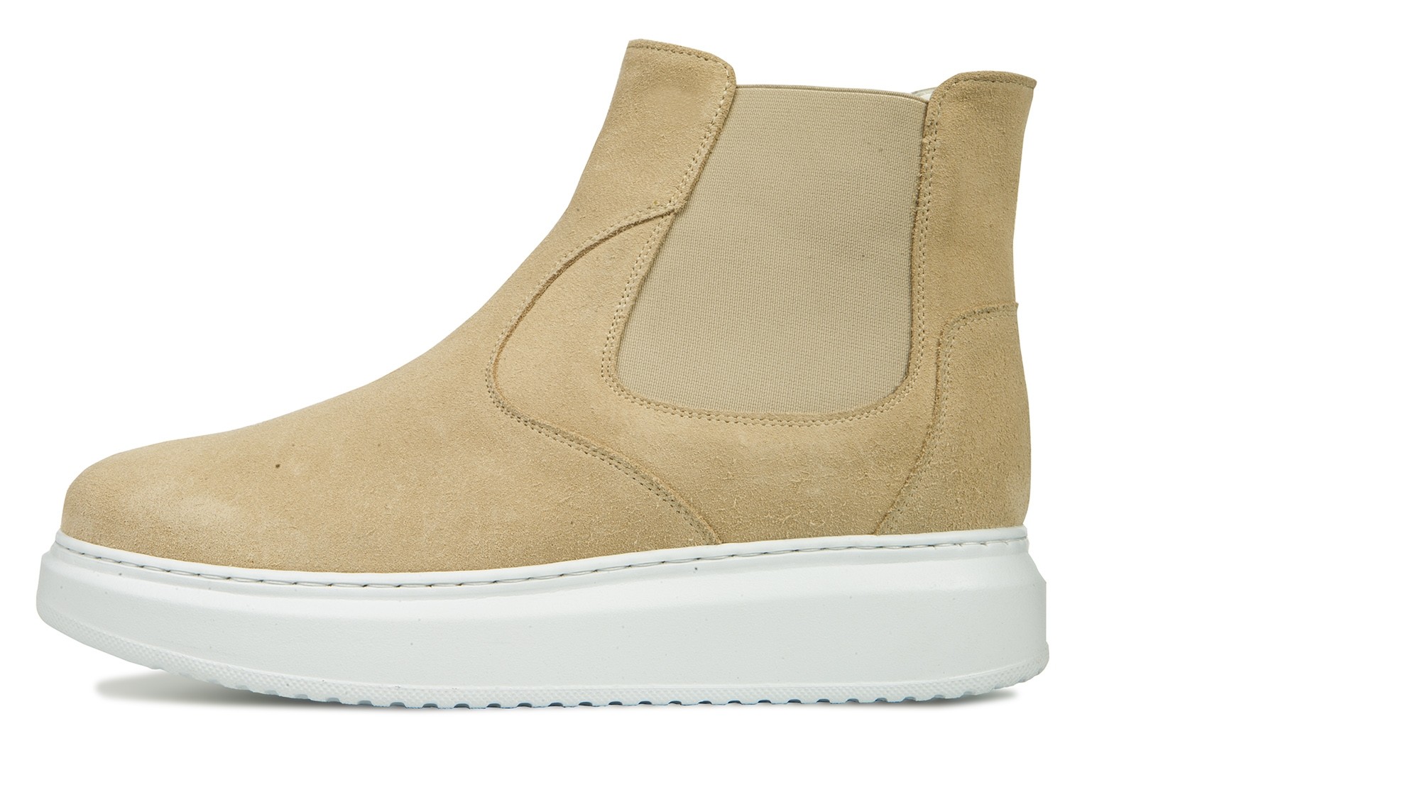 Be cool without sacrificing comfort: this is the spirit that animates the new GuidoMaggi elevator boot. In an innovative mix, the rounded lines of sneakers are combined with the exclusive design of an ankle boot. The result is a dynamic and trendy elevator shoe, extremely versatile and perfect for the casual-chic looks of the season. The handmade model has a taupe suede calfskin upper with matching elastics and adds up to 3.1" of extra height. Handmade in Italy.