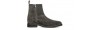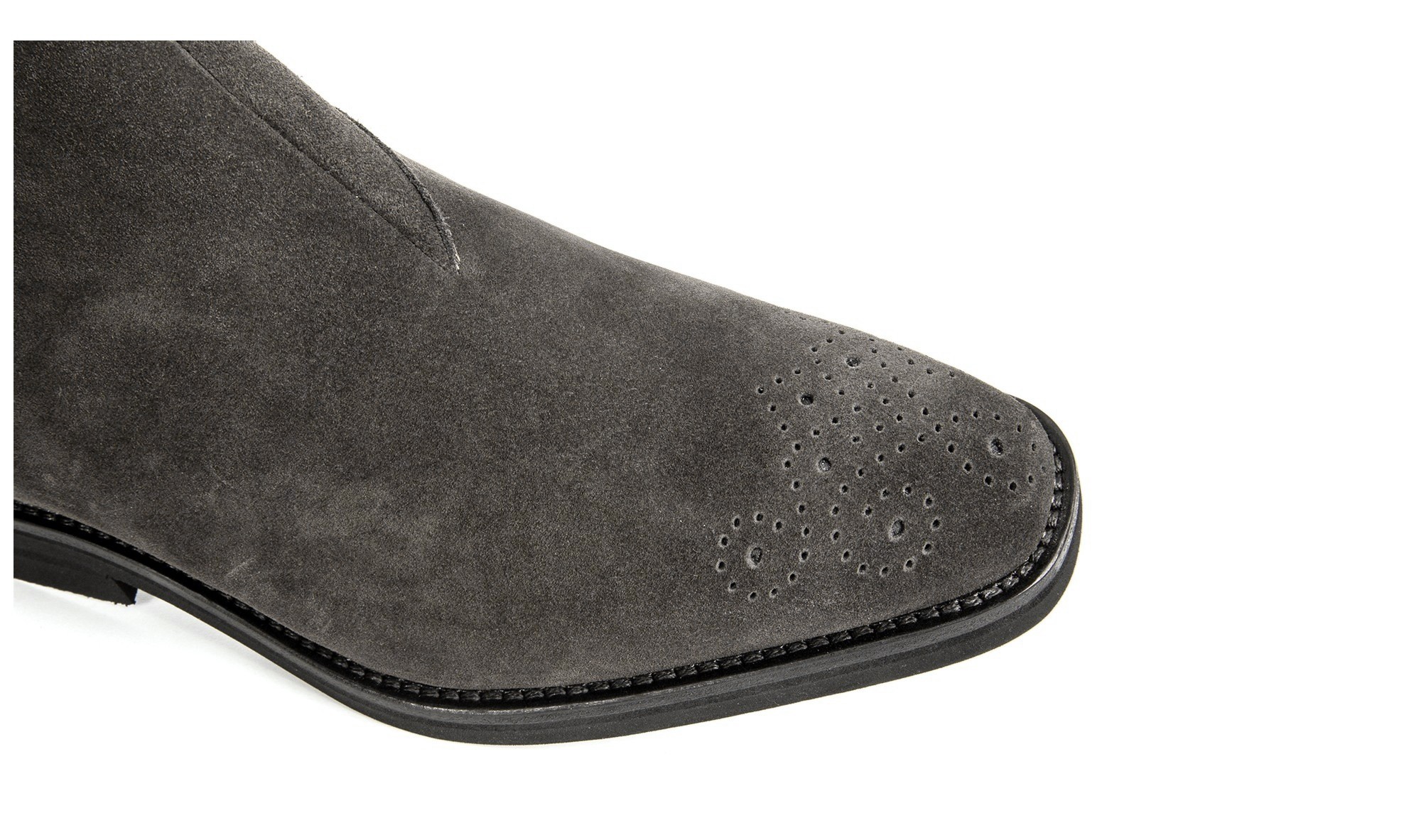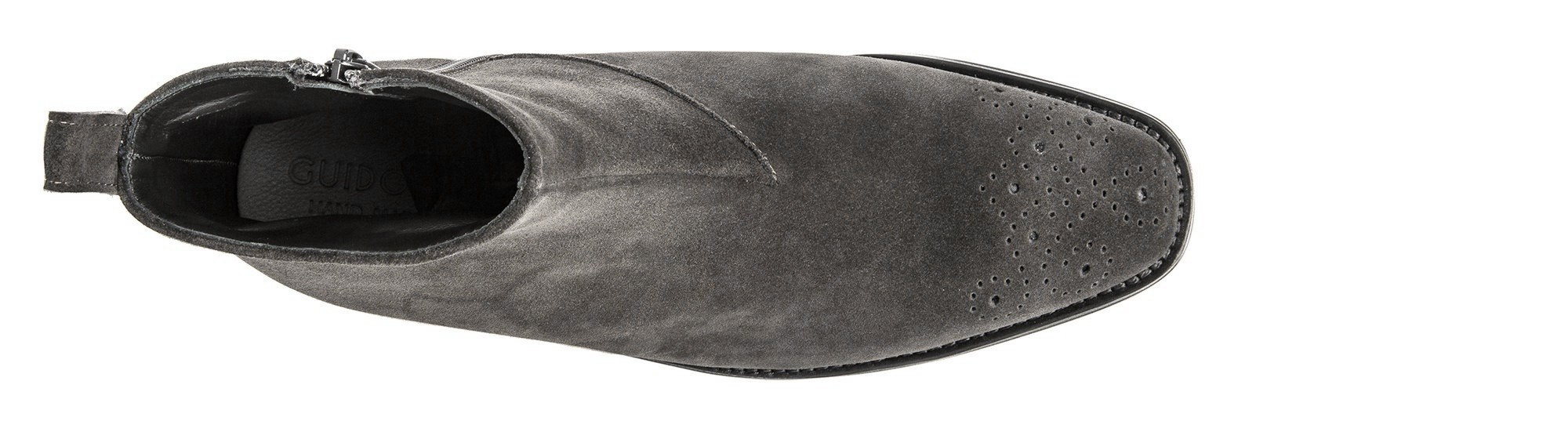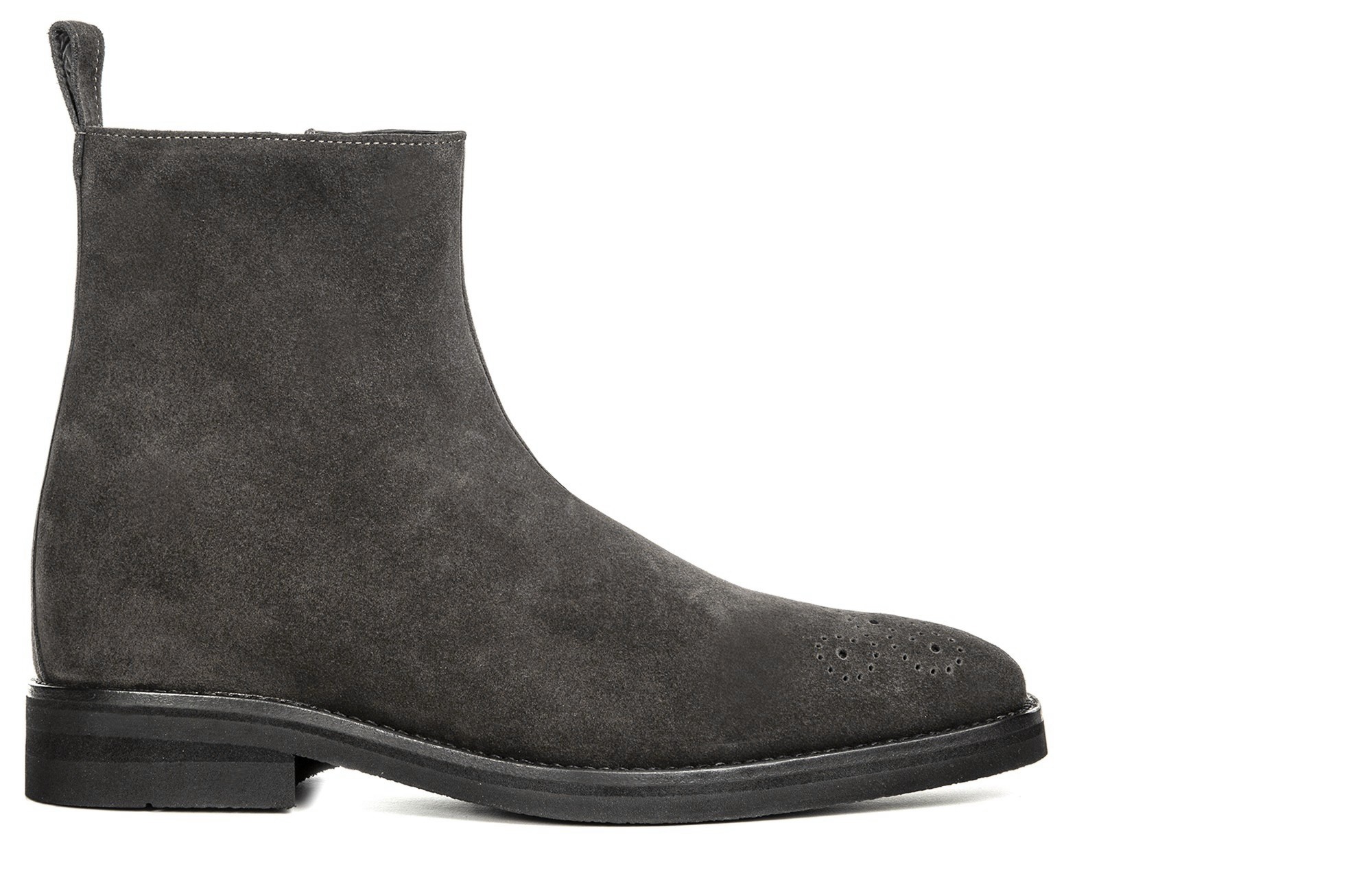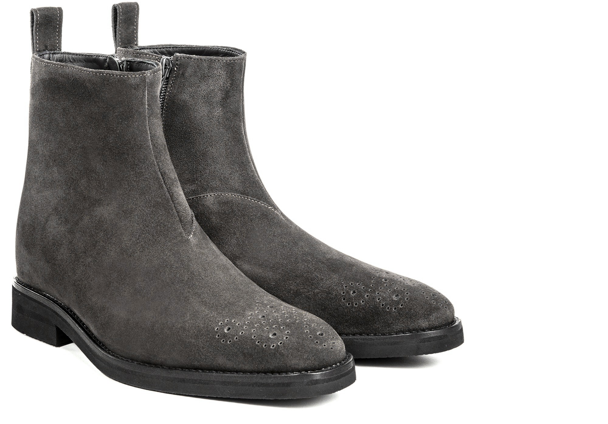 Handcrafted elevator chelsea boots with upper made of soft suede calf leather featuring a particular ash brown color, flower decoration on the toe and Vibram rubber sole. The closure is regulated by a side zip.