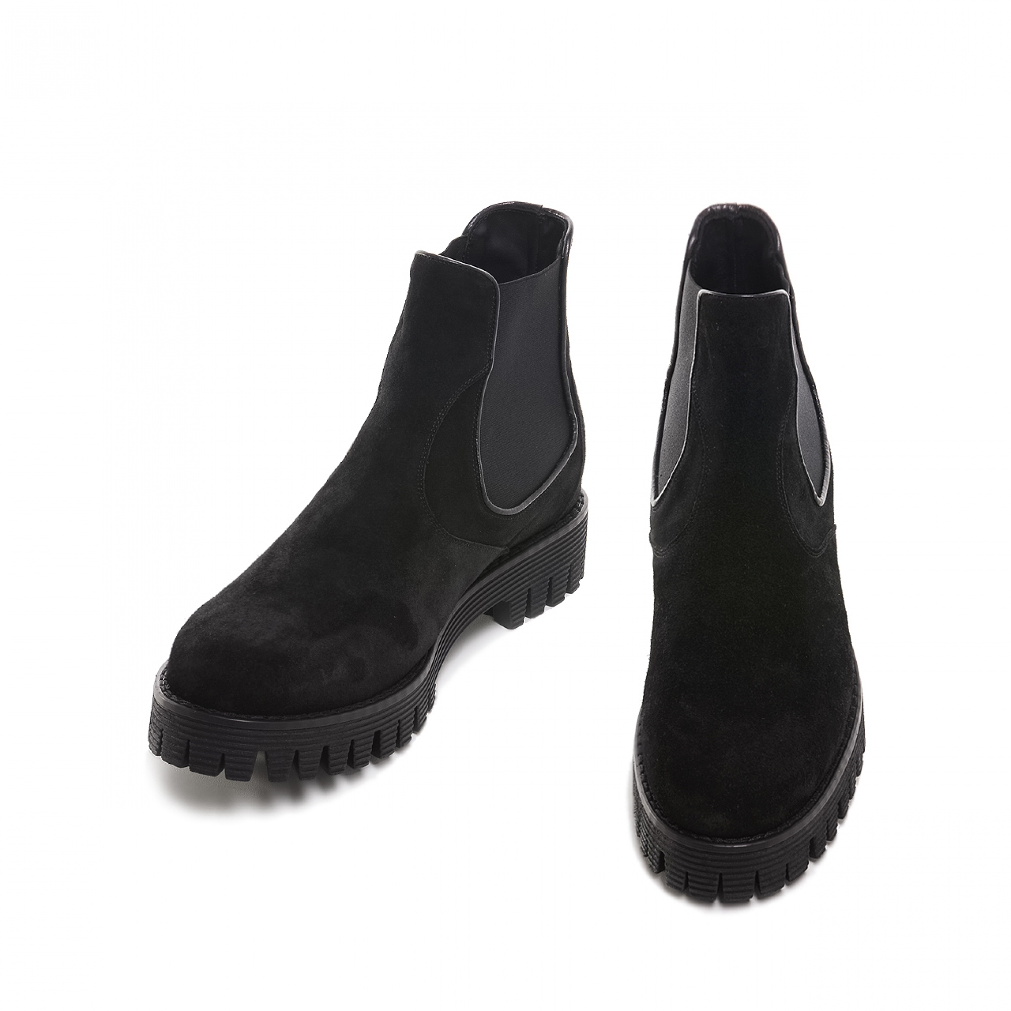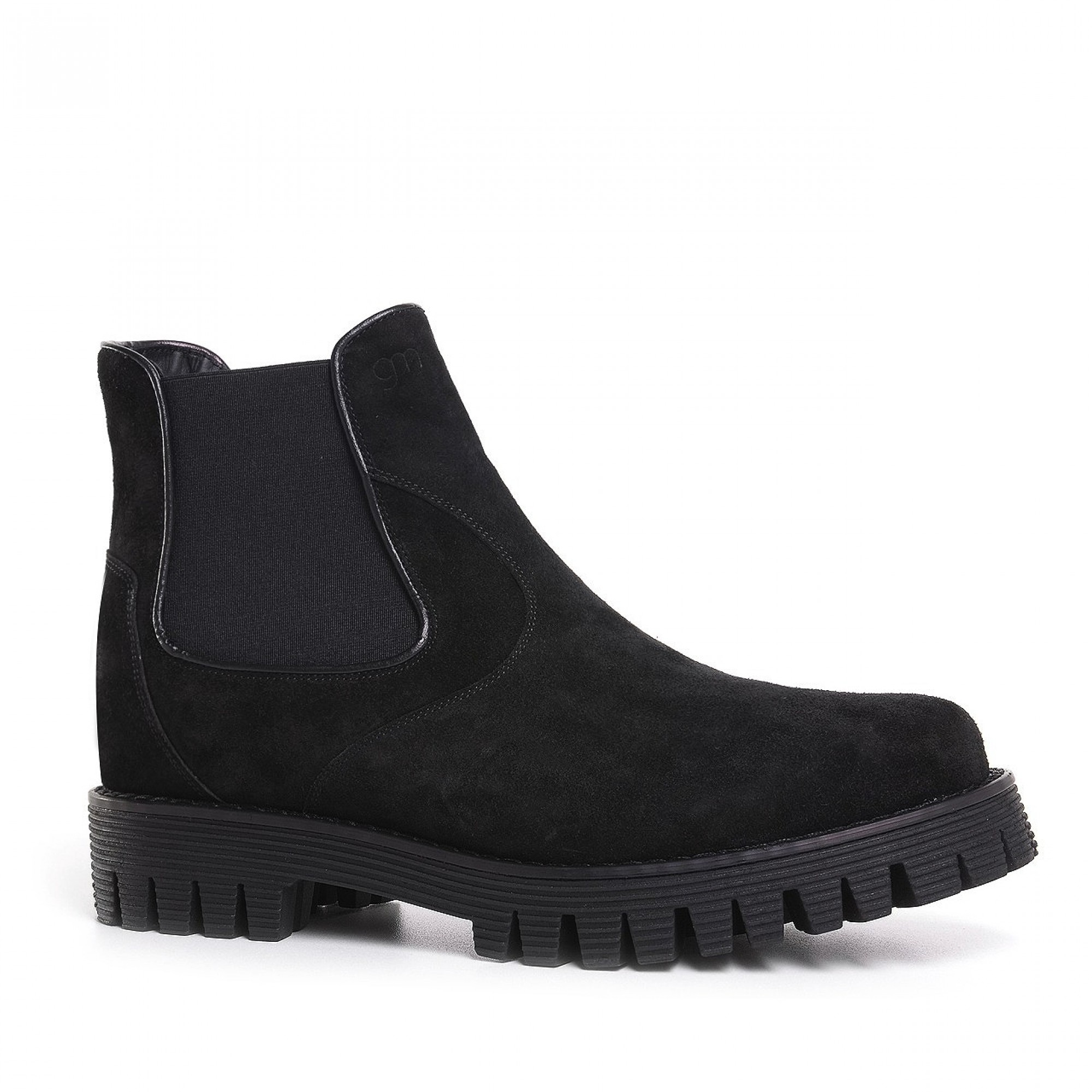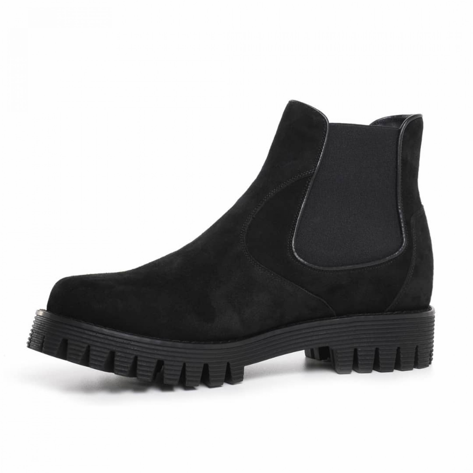 Elevator ankle boot handmade in Italy with upper in soft black suede and super light tone on tone rubber sole.