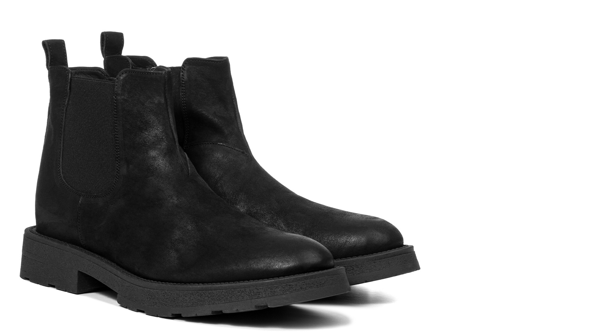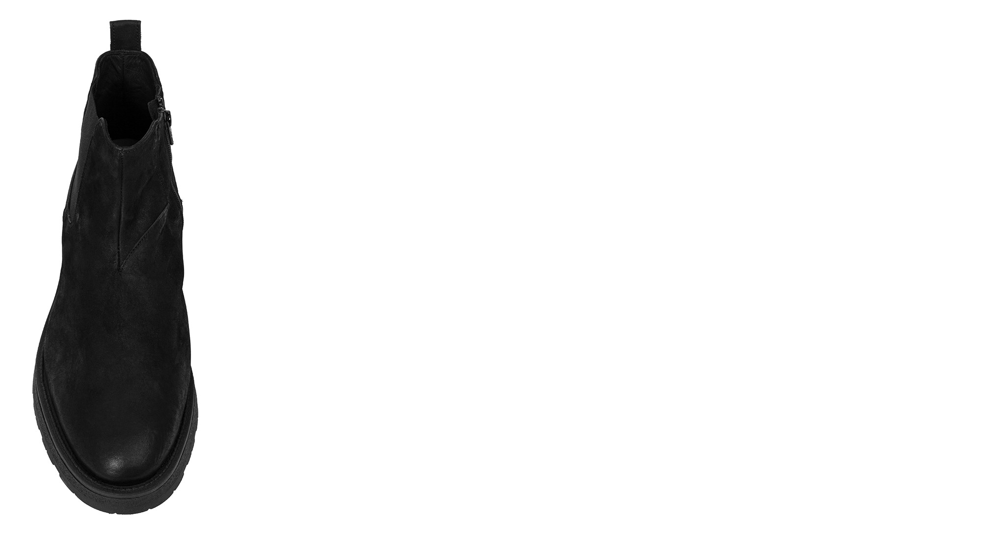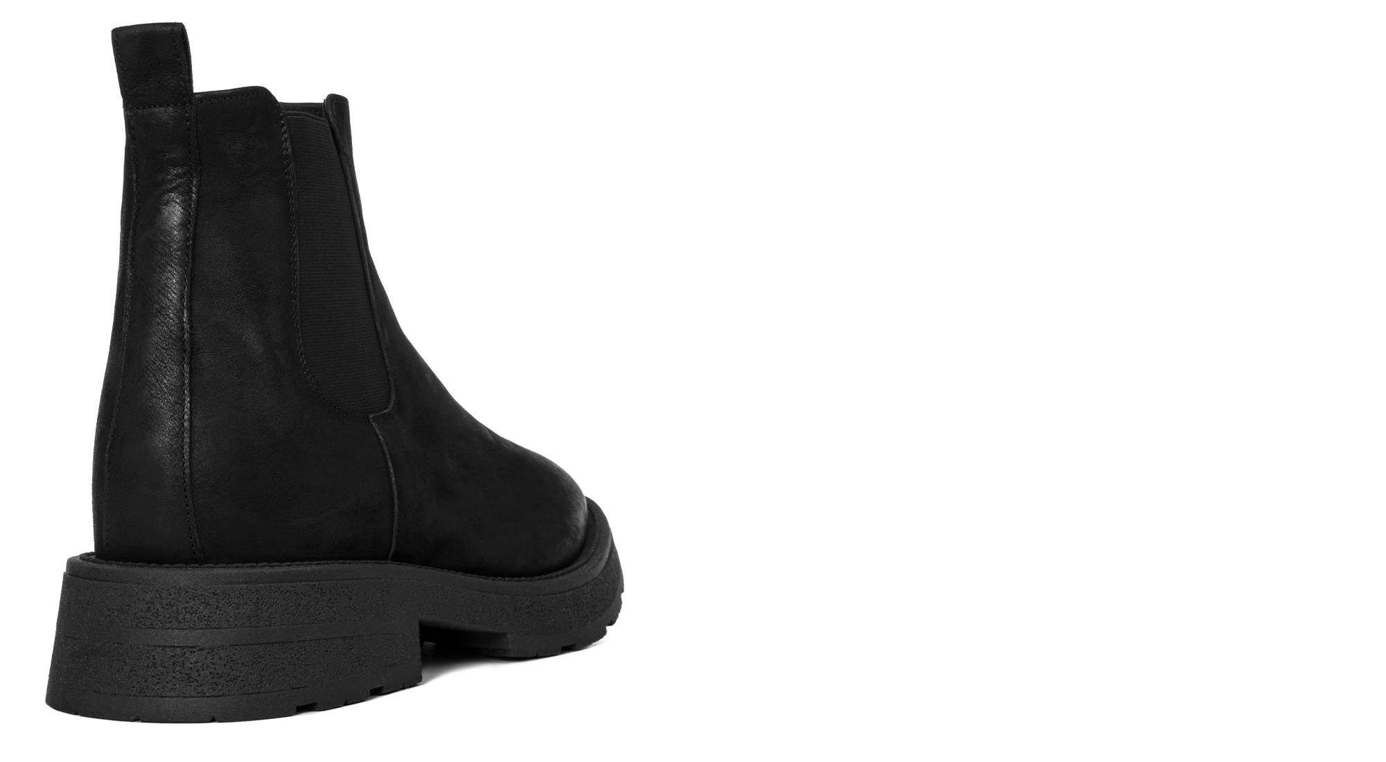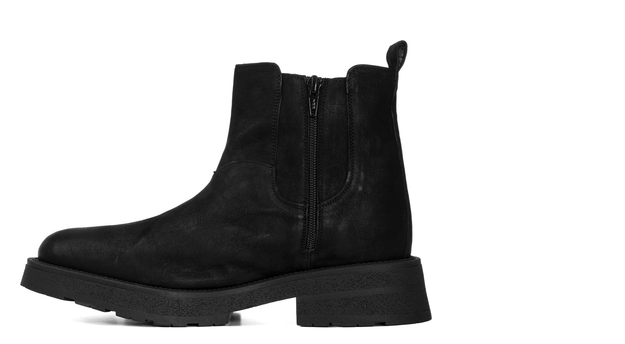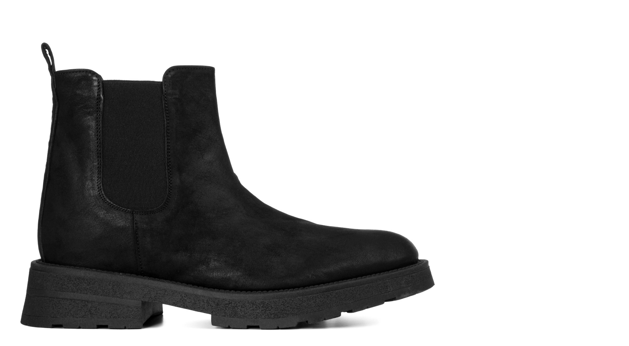 Elevator Chelsea boot made of waxed leather, offering a worn-in look and a unique charm that balances urban style with vintage appeal. The surface features a soft and velvety finish, in the classic black color. The footwear is equipped with a practical pull-tab and an ultra-lightweight, non-slip rubber sole for maximum comfort.