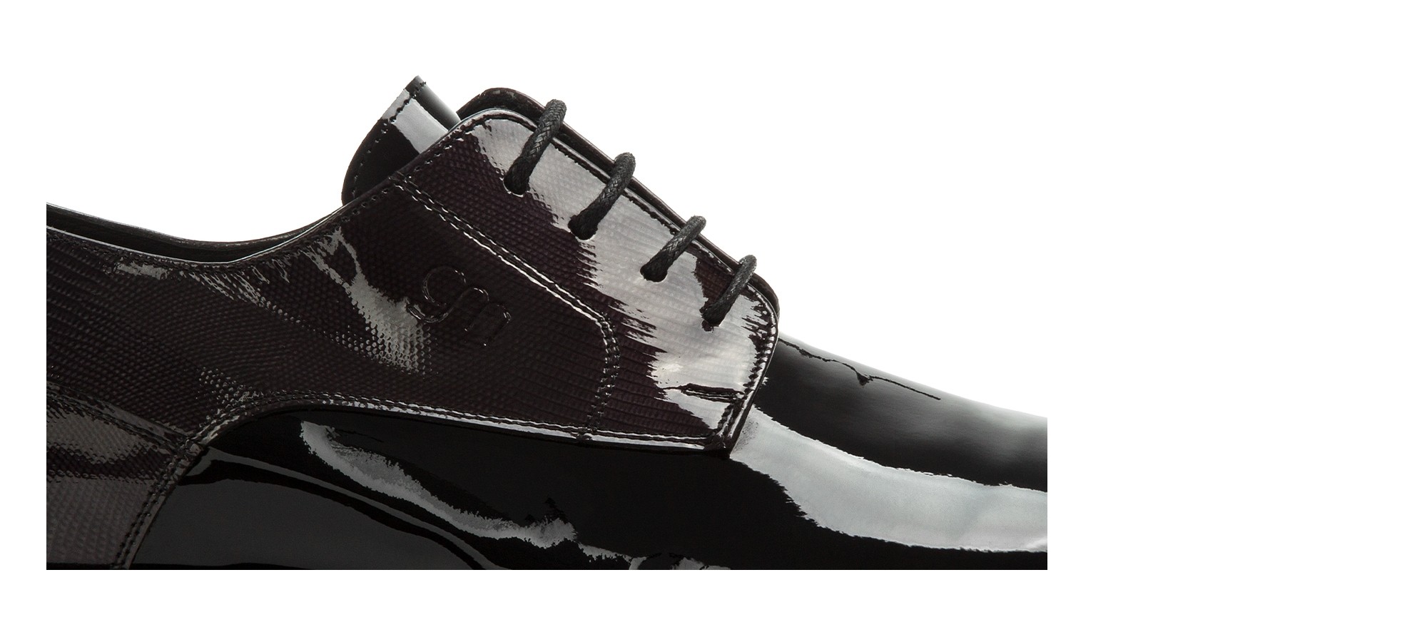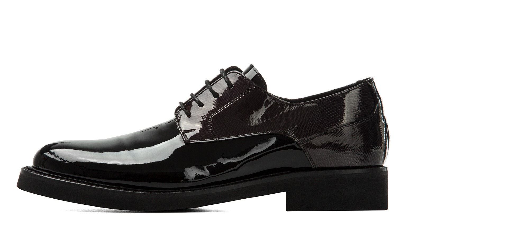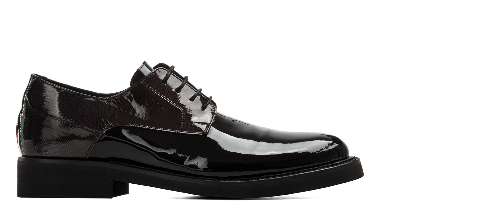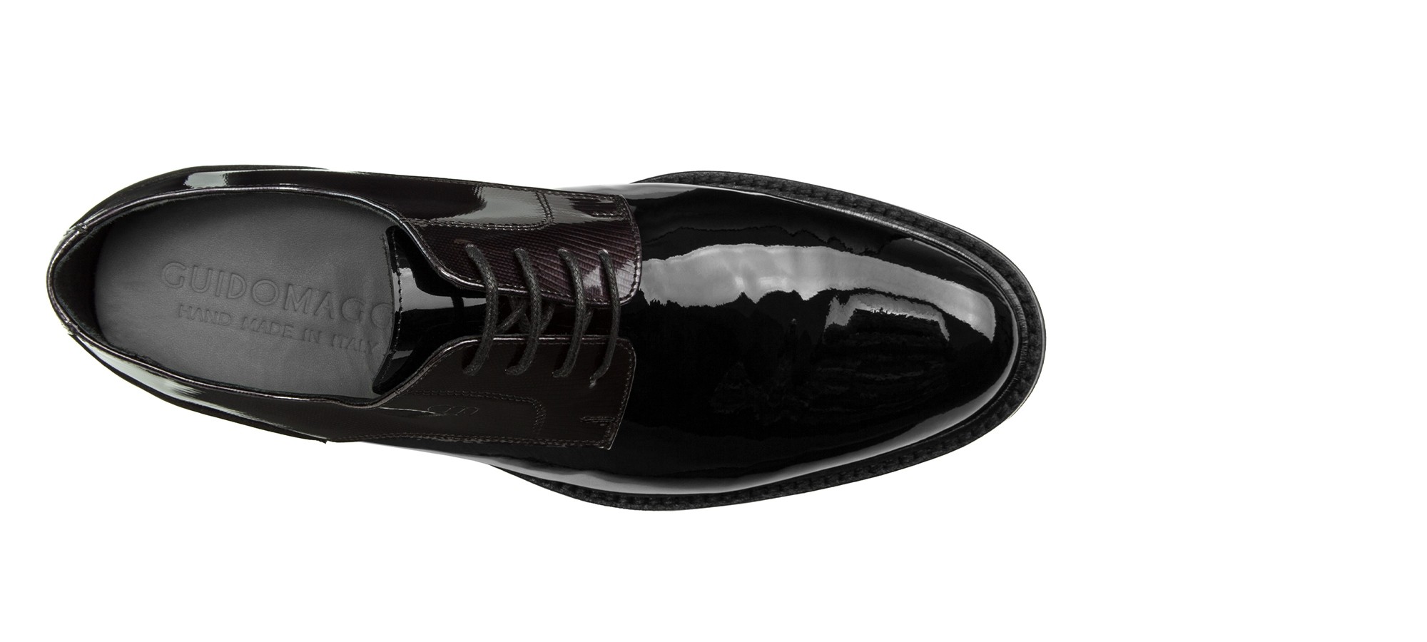 Classic elegant derby shoe with black patent leather upper and round toe. Entirely handcrafted by GuidoMaggi artisans, this tuxedo shoe combines elegance with ultimate comfort thanks to its super soft Vibram sole. 100% Made in Italy, elevates height by up to 3.1 inches (8 cm).