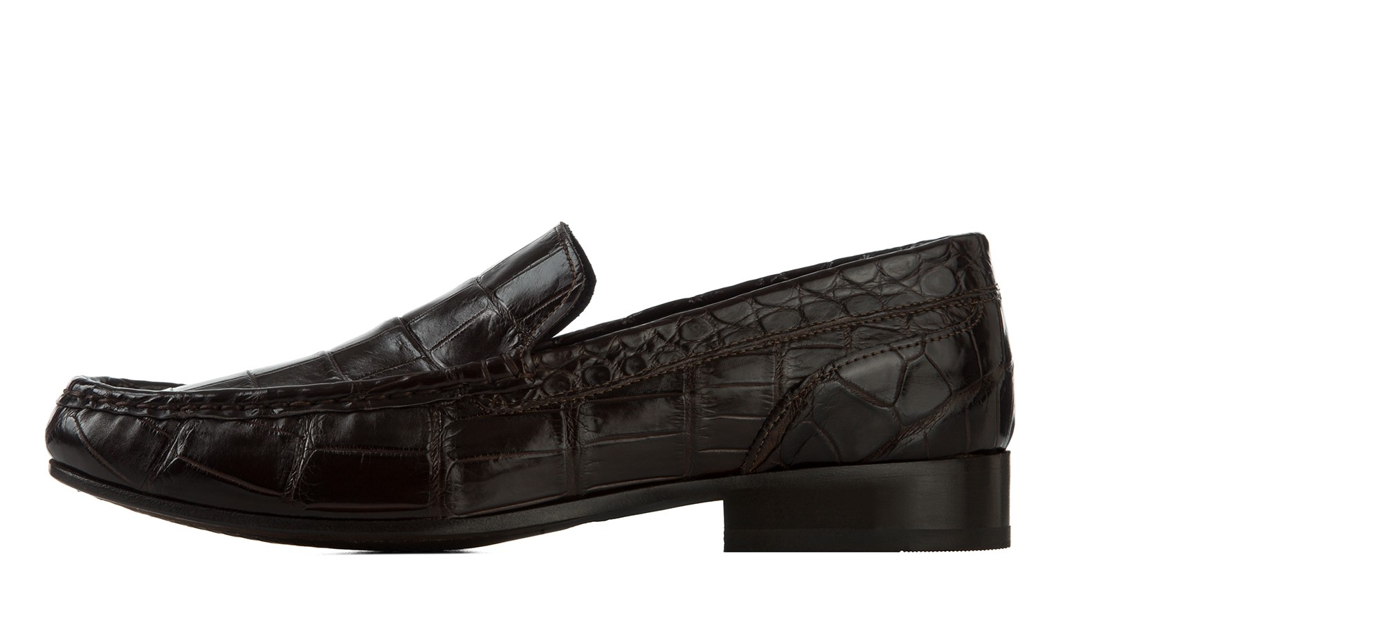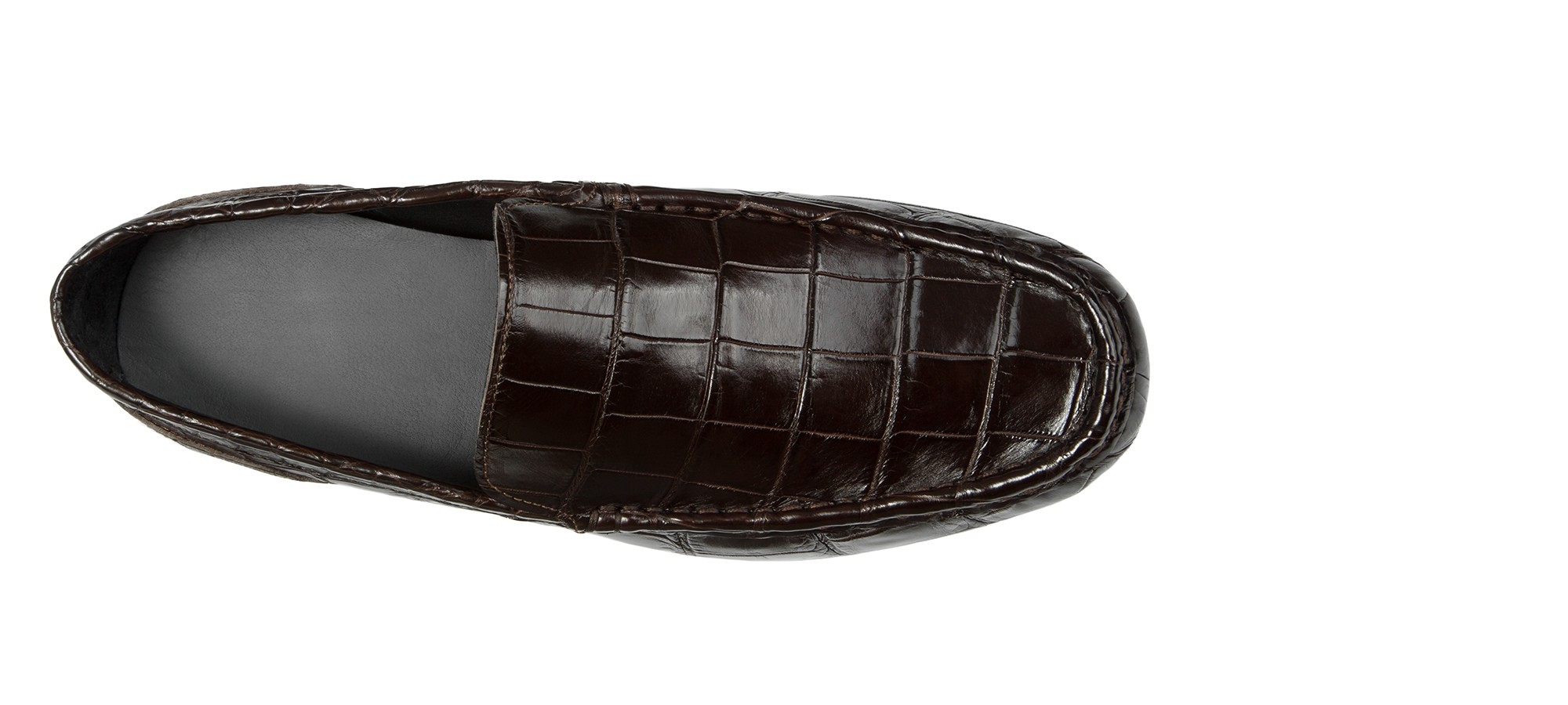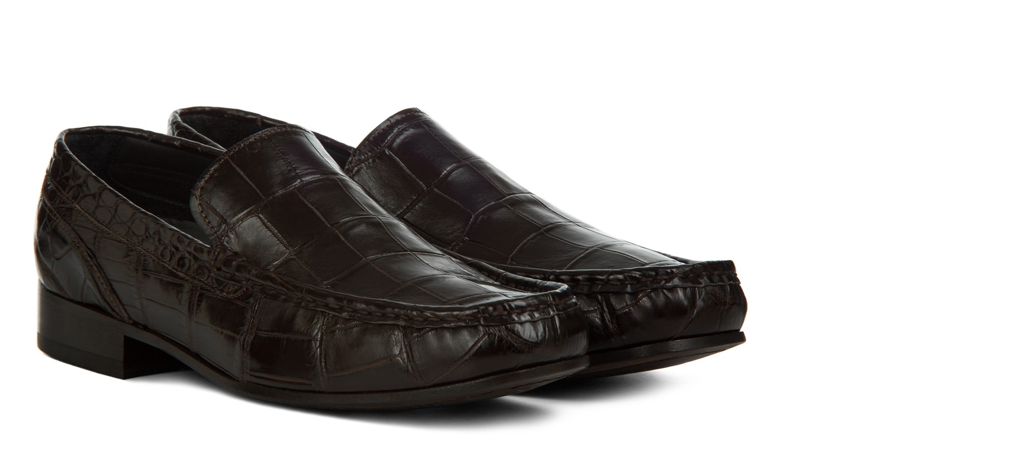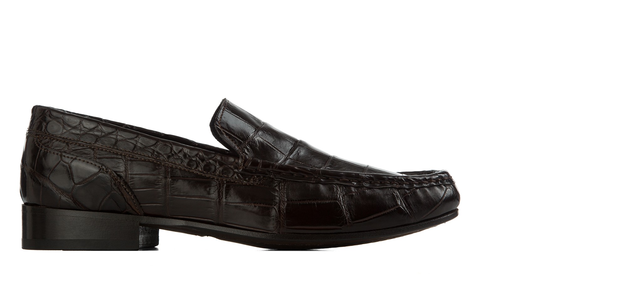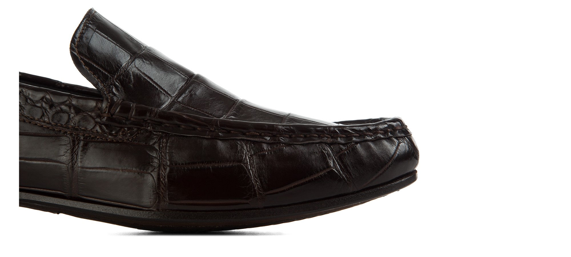 The Alvito loafer embodies the essence of GuidoMaggi's sartorial elegance. A clean, sophisticated design without a horsebit, it is crafted from genuine crocodile leather with a semi-glossy Millennium-effect finish. The uniform brown hue enhances the natural grain of the skin, making every pair unique.