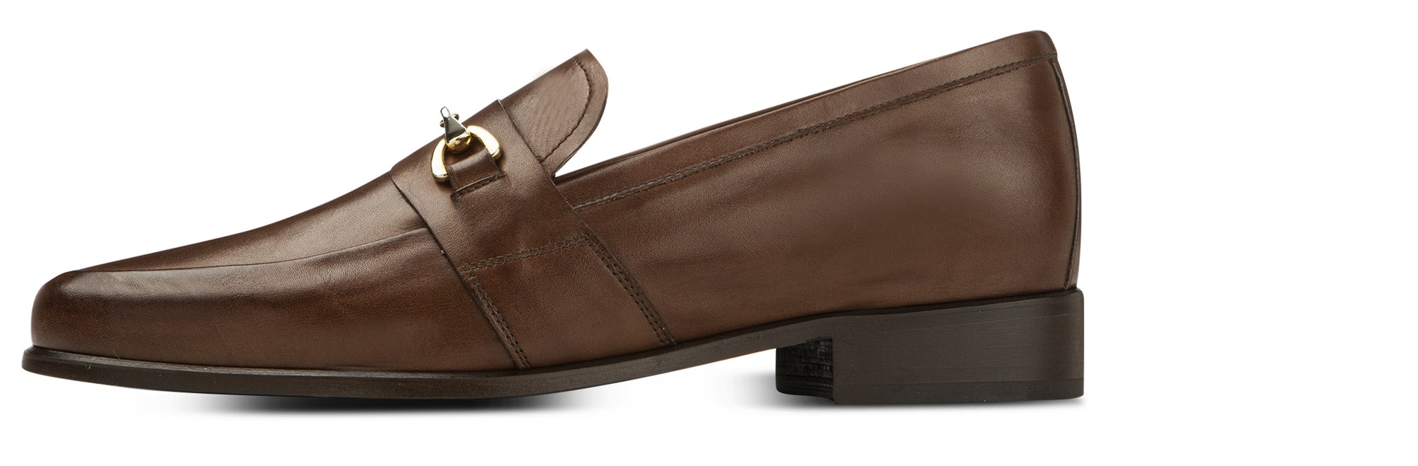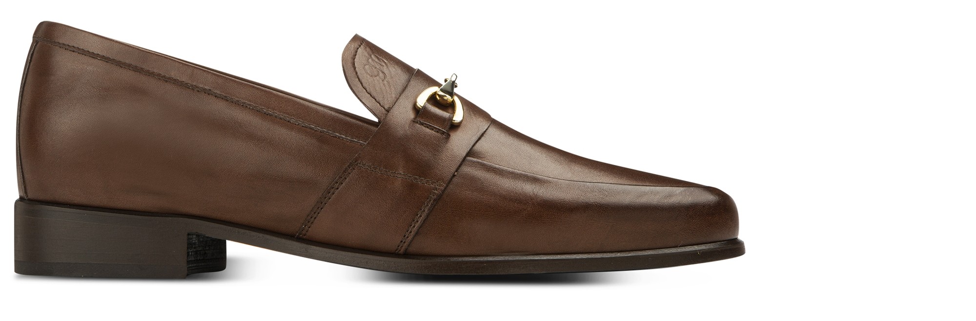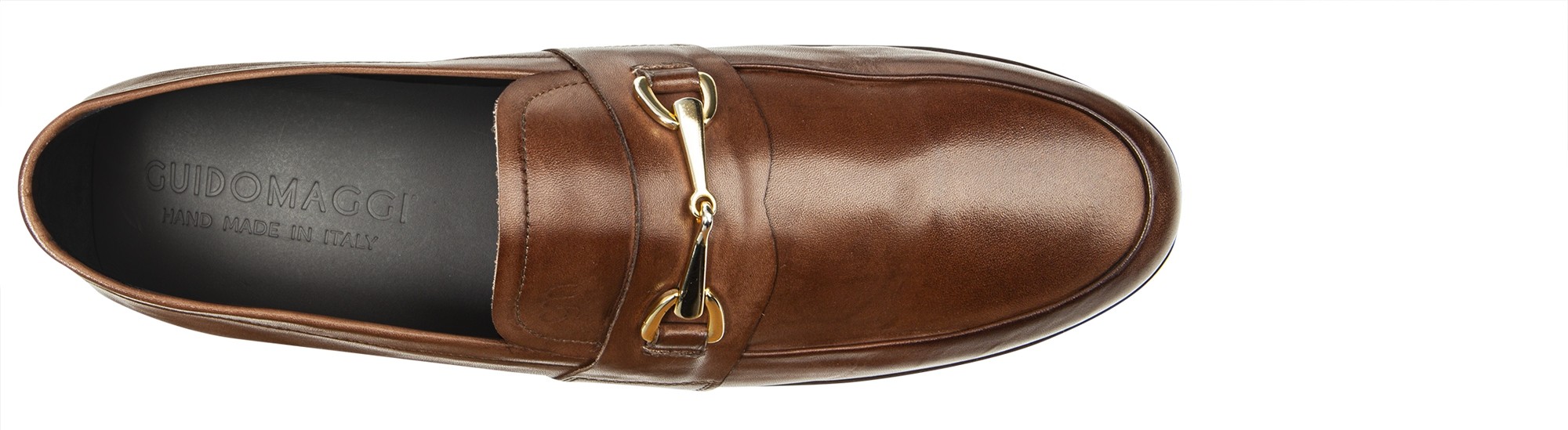 All the experience and talent of the GuidoMaggi master artisans are enclosed in this elegant moccasin with horsebit: classic workmanship but with a contemporary soul. The upper is dark brown full-grain leather embellished with a gold horsebit. Very chic, ideal for special occasions, important events or business meetings. Slim the silhouette by increasing your height by 2.56", with discretion and style. Handmade and made to measure.