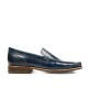 Classy height increasing loafers handmade in Italy with upper in soft blue Tuscan nappa leather and stiched leather sole with anti slip rubber. The fine Tuscan nappa ages overtime assuming a unique and particular texture.