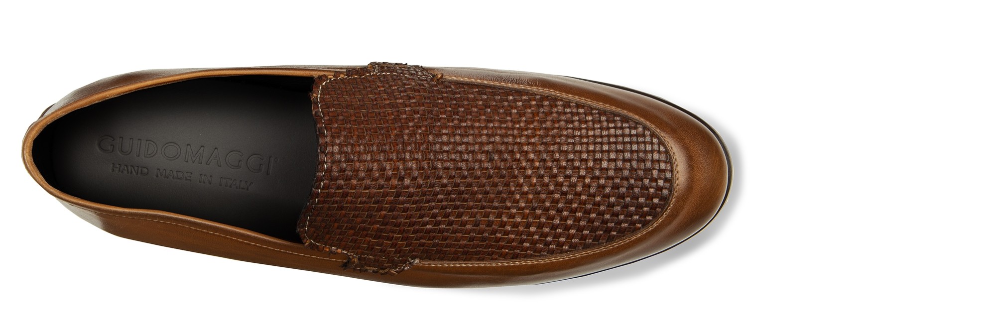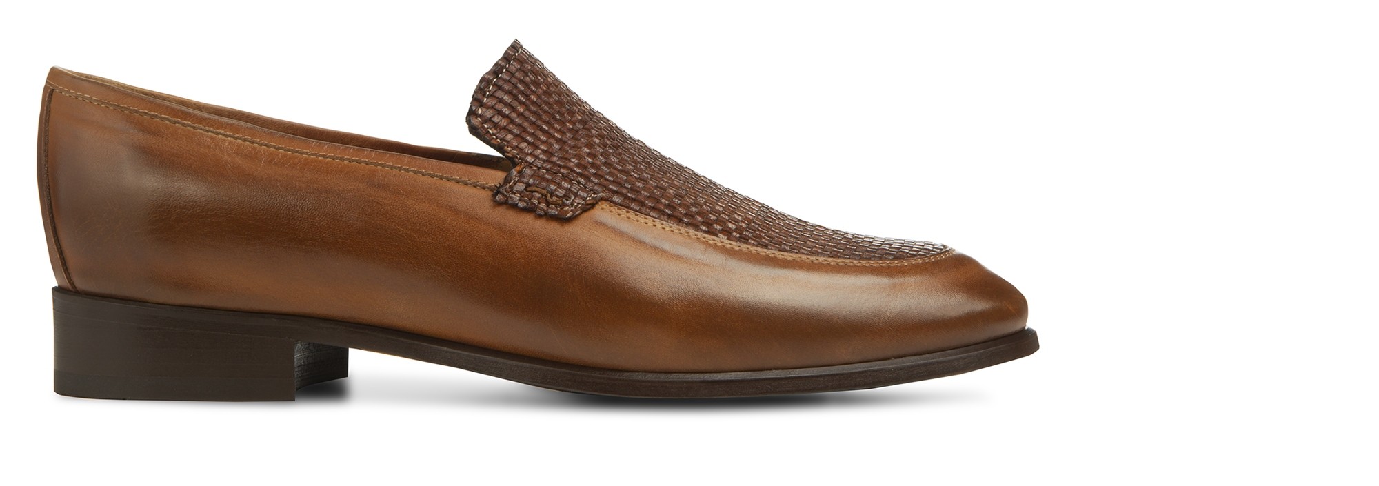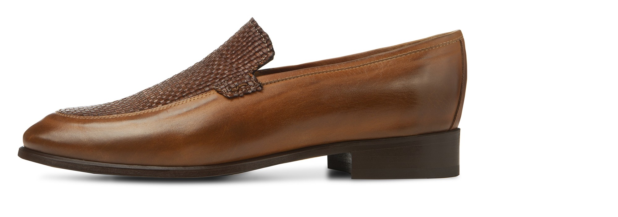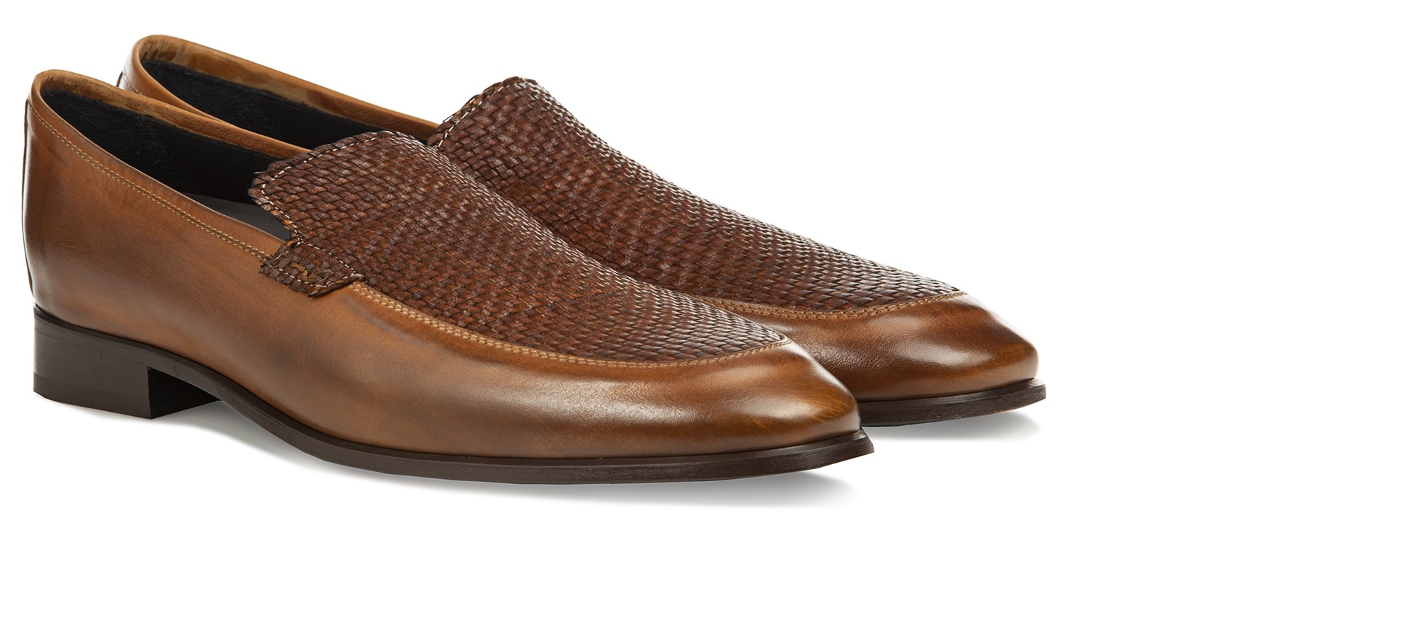 Sinuous lines and contemporary design for a timeless classic in the tones of brown ideal for seasonal chic outfits. The upper is made by hand working two different types of leather: the soft full-grain leather and the hand-painted brown braid. The dark brown contrasting sole is made of 100% Italian leather. It has a comfortable and discreet lifting system that adds up to 2.55" of extra height. Handmade in Italy