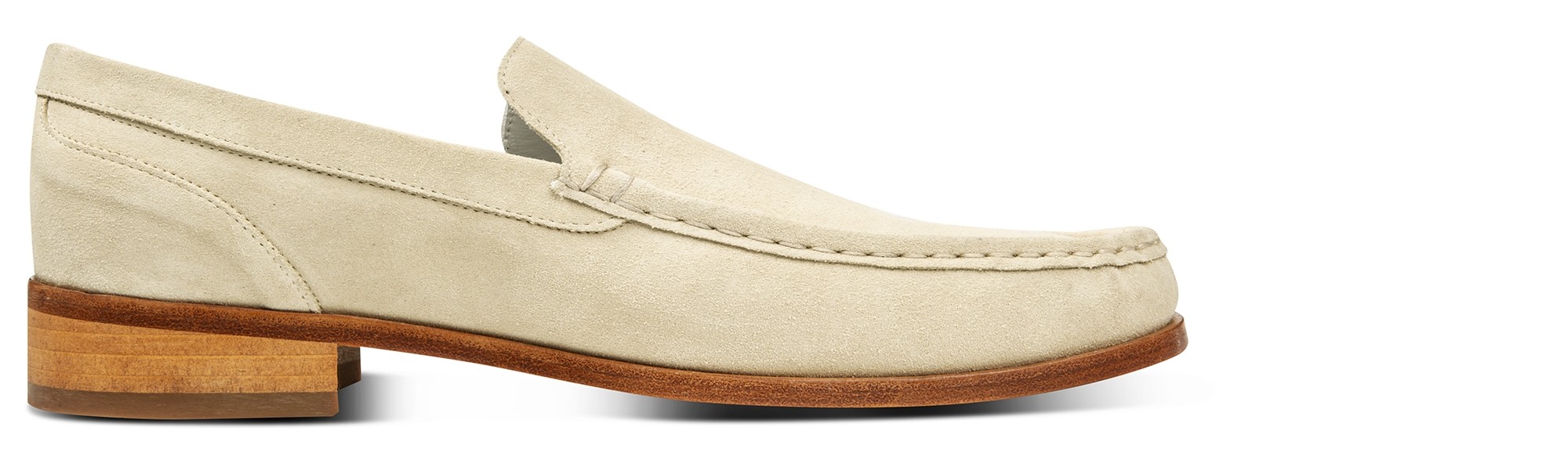 Upper in beige suede calf leather . Upper leather, outsole and midsole are sewn at sight. Insole and midsole in genuine leather. Leather heel with special anti-slip rubber