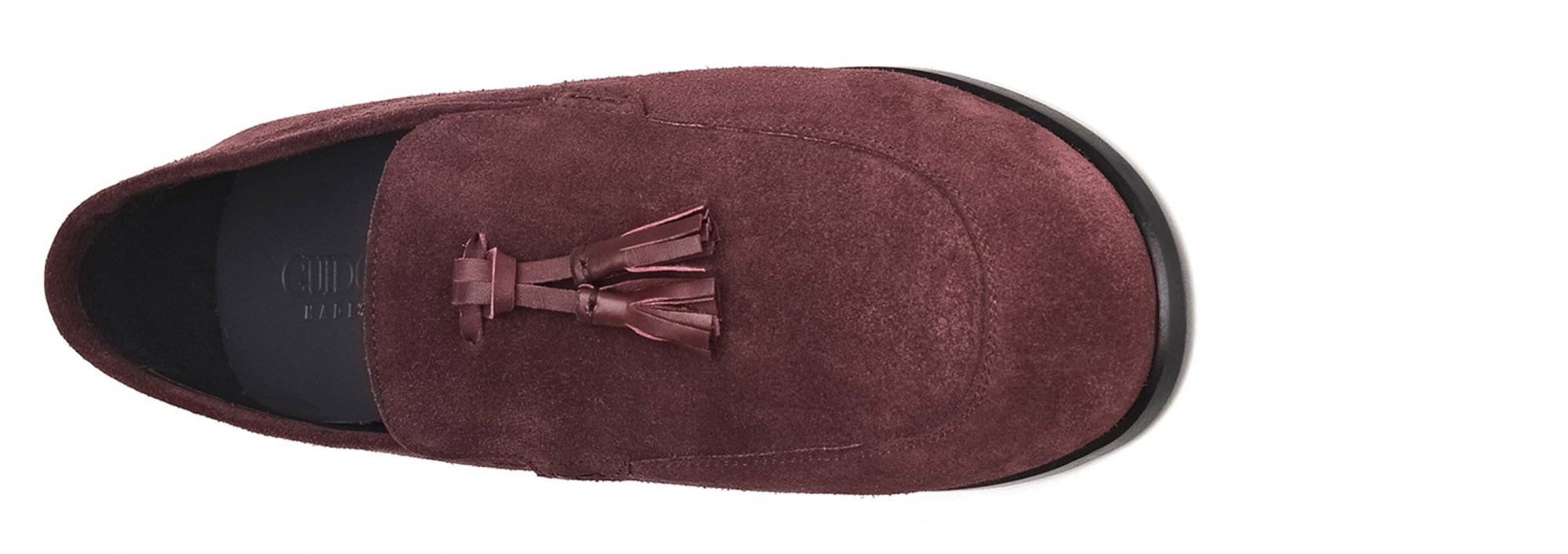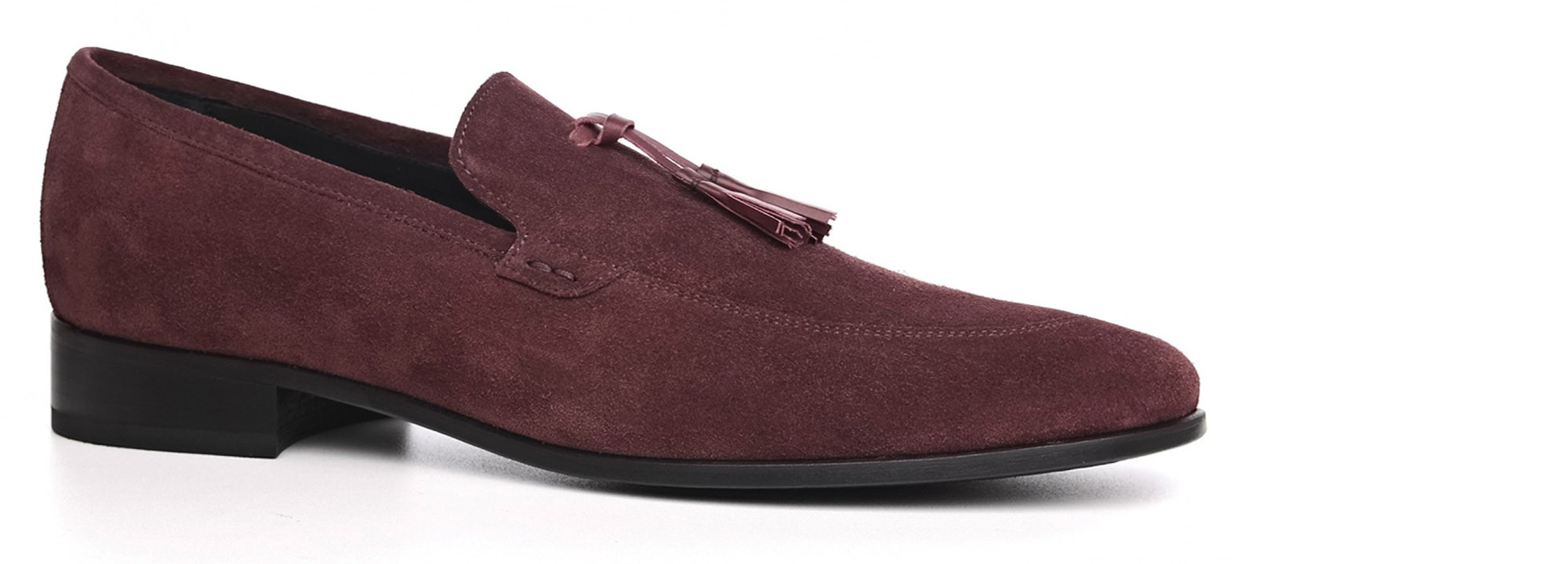 Exclusive handcrafted elevator loafers with upper in burgundy suede calf leather and elegant tone-on-tone tassels in full-grain Tuscan leather. The sole made of genuine leather is stitched at sight.