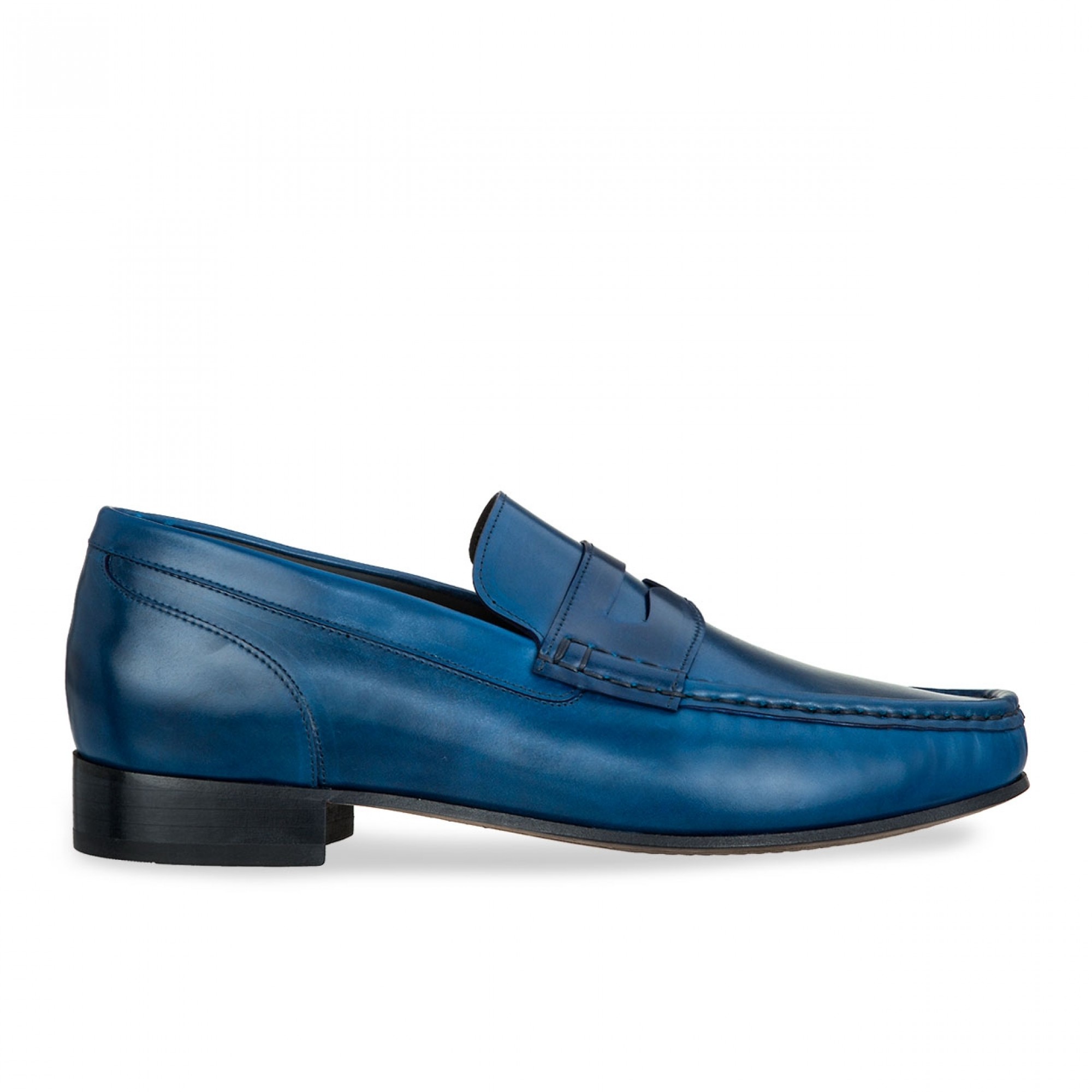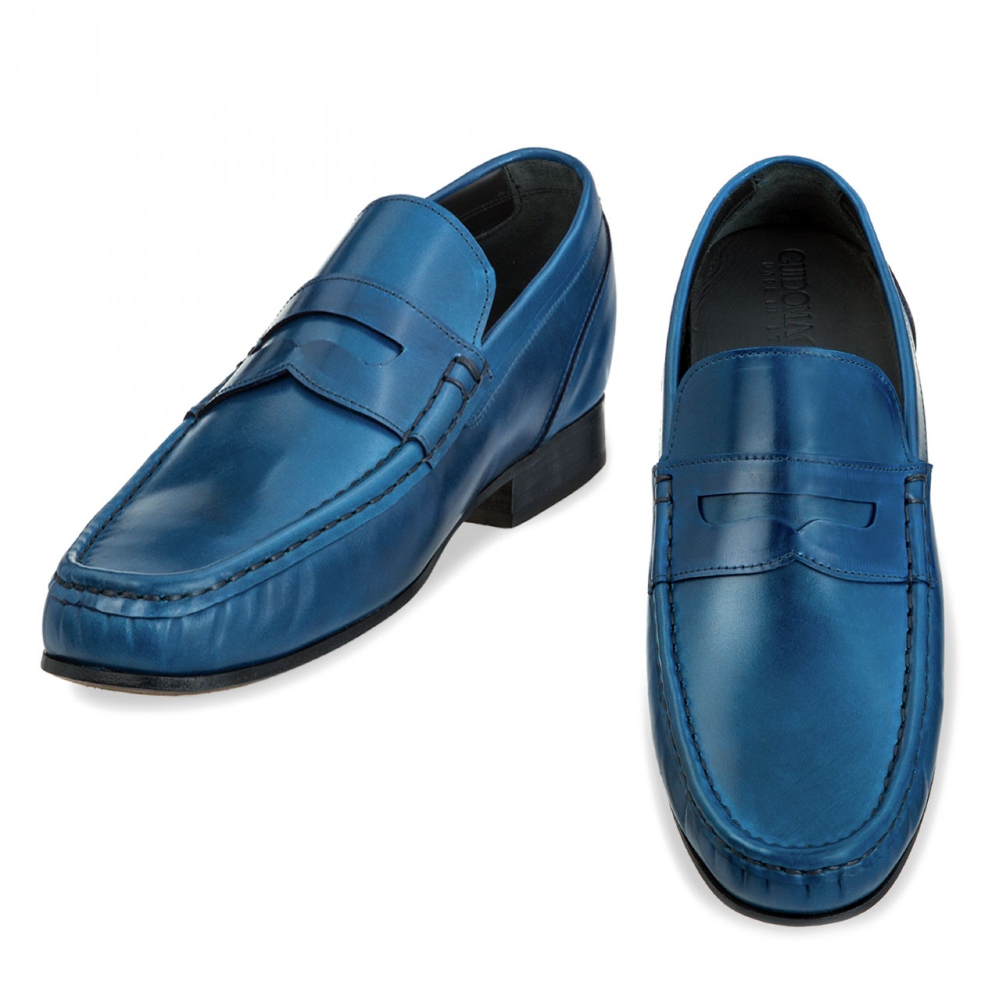 Elegant elevator moccasin with clamp made of genuine shell cordovan leather featuring a soft cobalt blue colour and stiched leather sole with anti slip rubber.