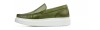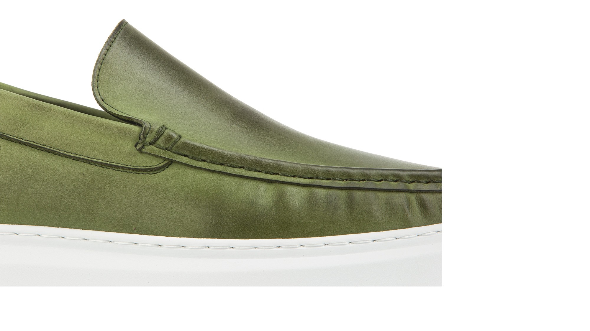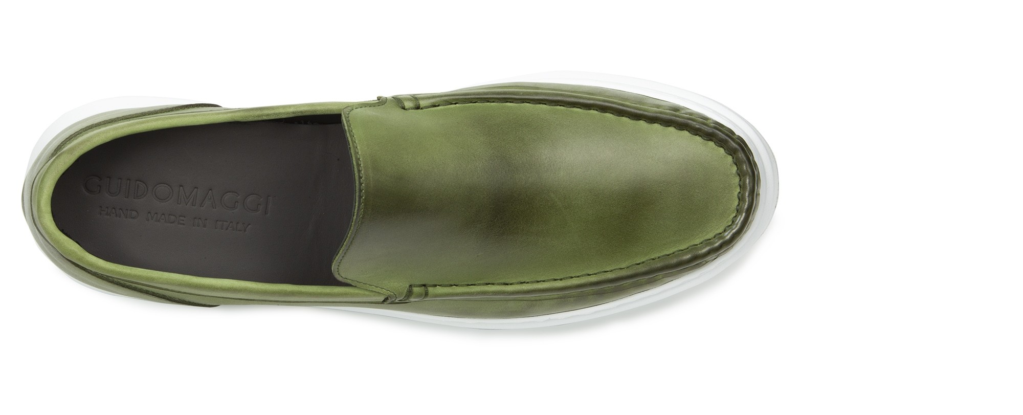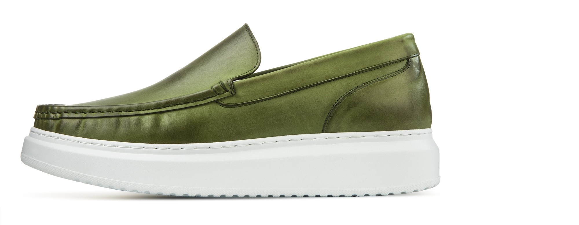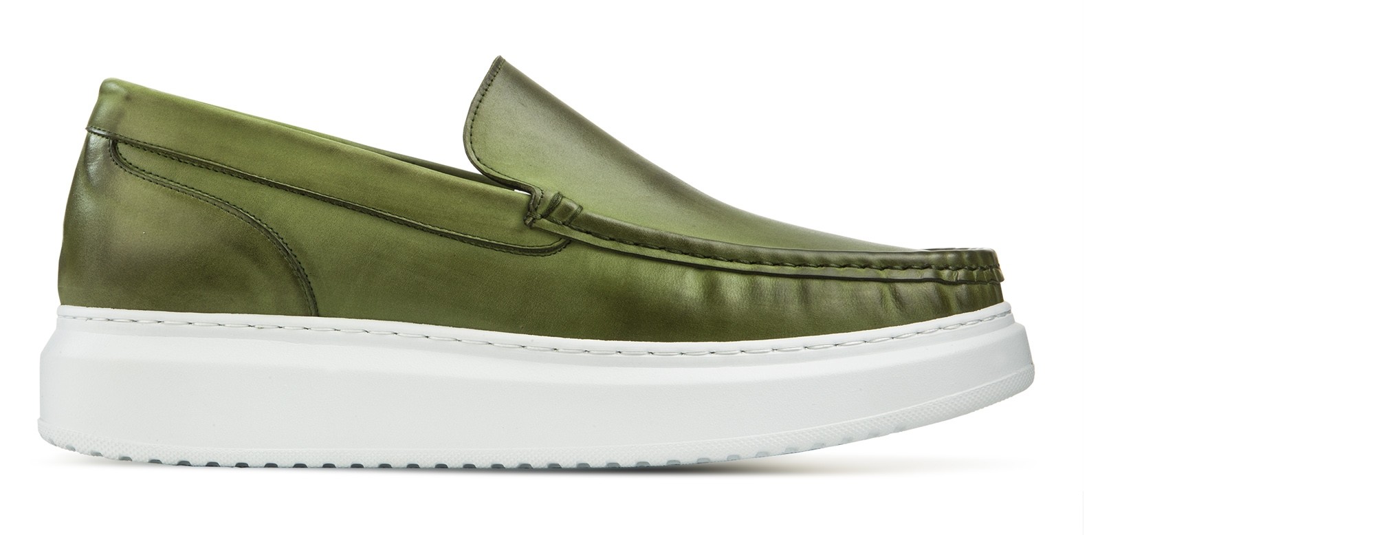 This elevator shoe has soft lines and a contemporary design with a super-light rubber sole, topped by an elegant plein loafer without a clamp. It features a lifting system that adds up to 2.6" (6.5 cm) of extra height in total comfort and discretion. The upper is hand-dyed calfskin with a patina effect, with non-uniform green shades. Ideal for any seasonal outfit. 100% made in Italy.