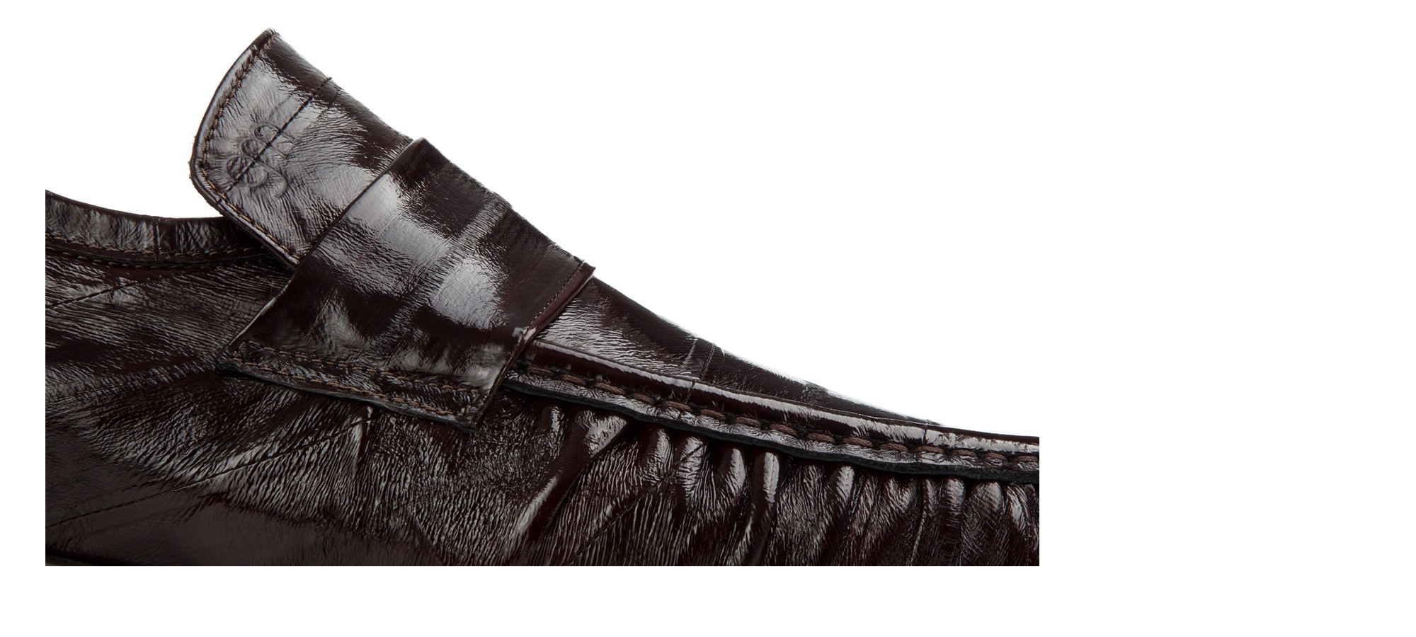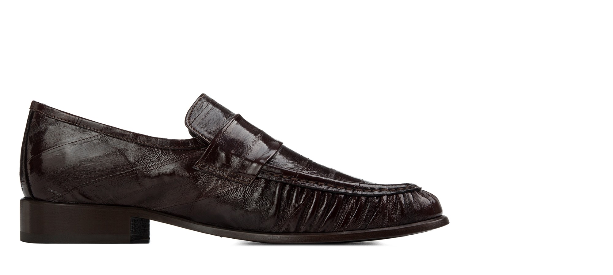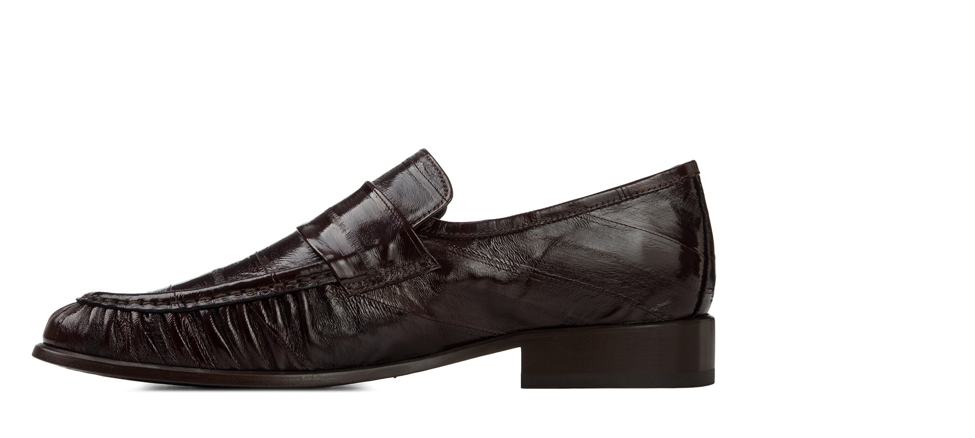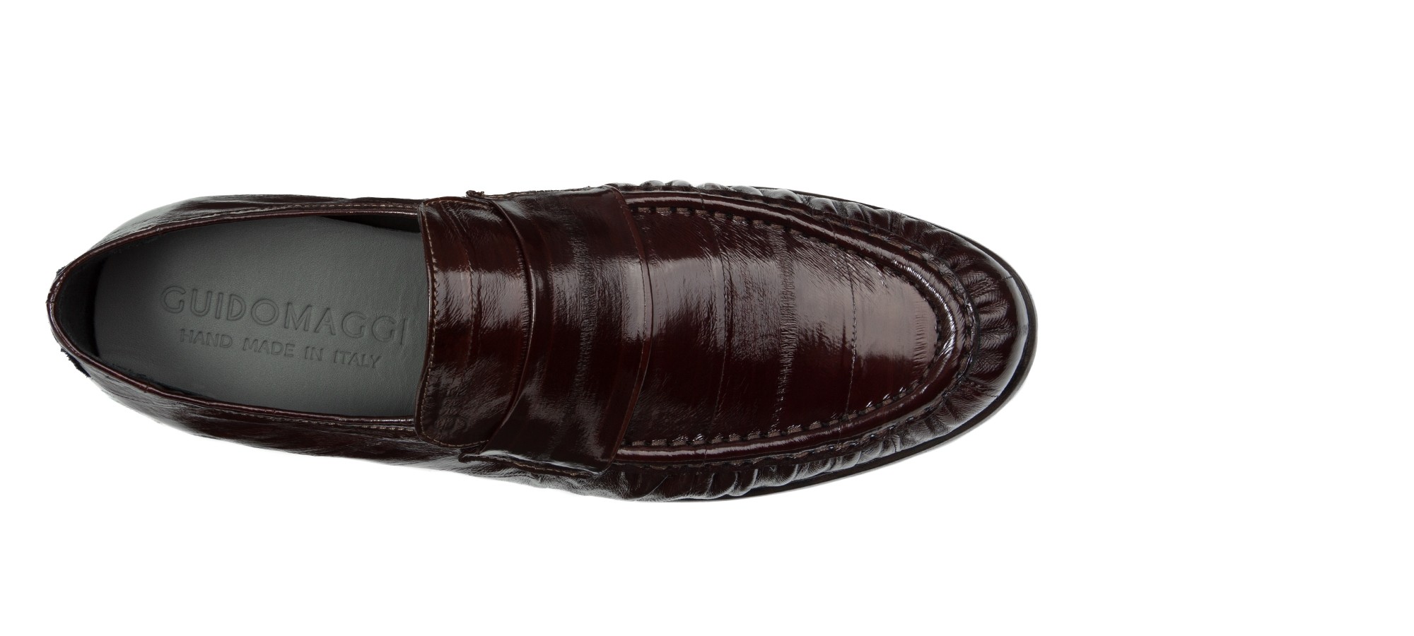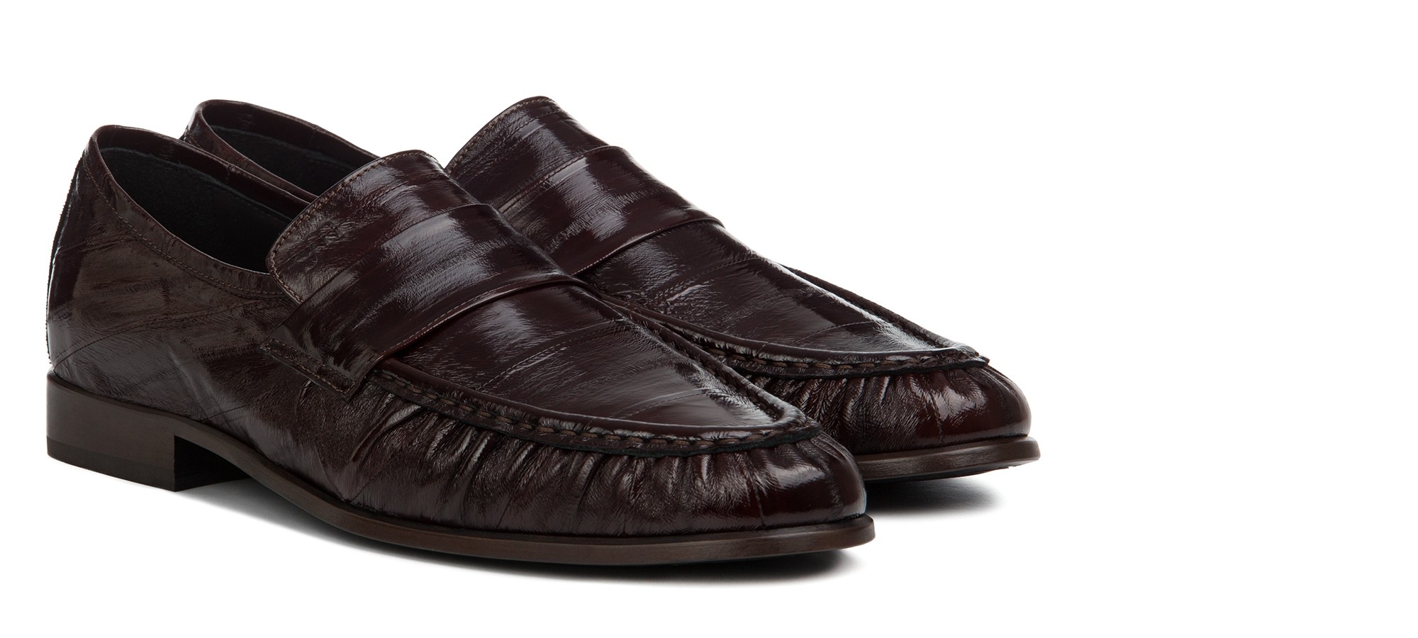 Elevator loafers crafted from eel leather, distinguished by its naturally pleated texture, available in shades inspired by the nuances of burgundy.