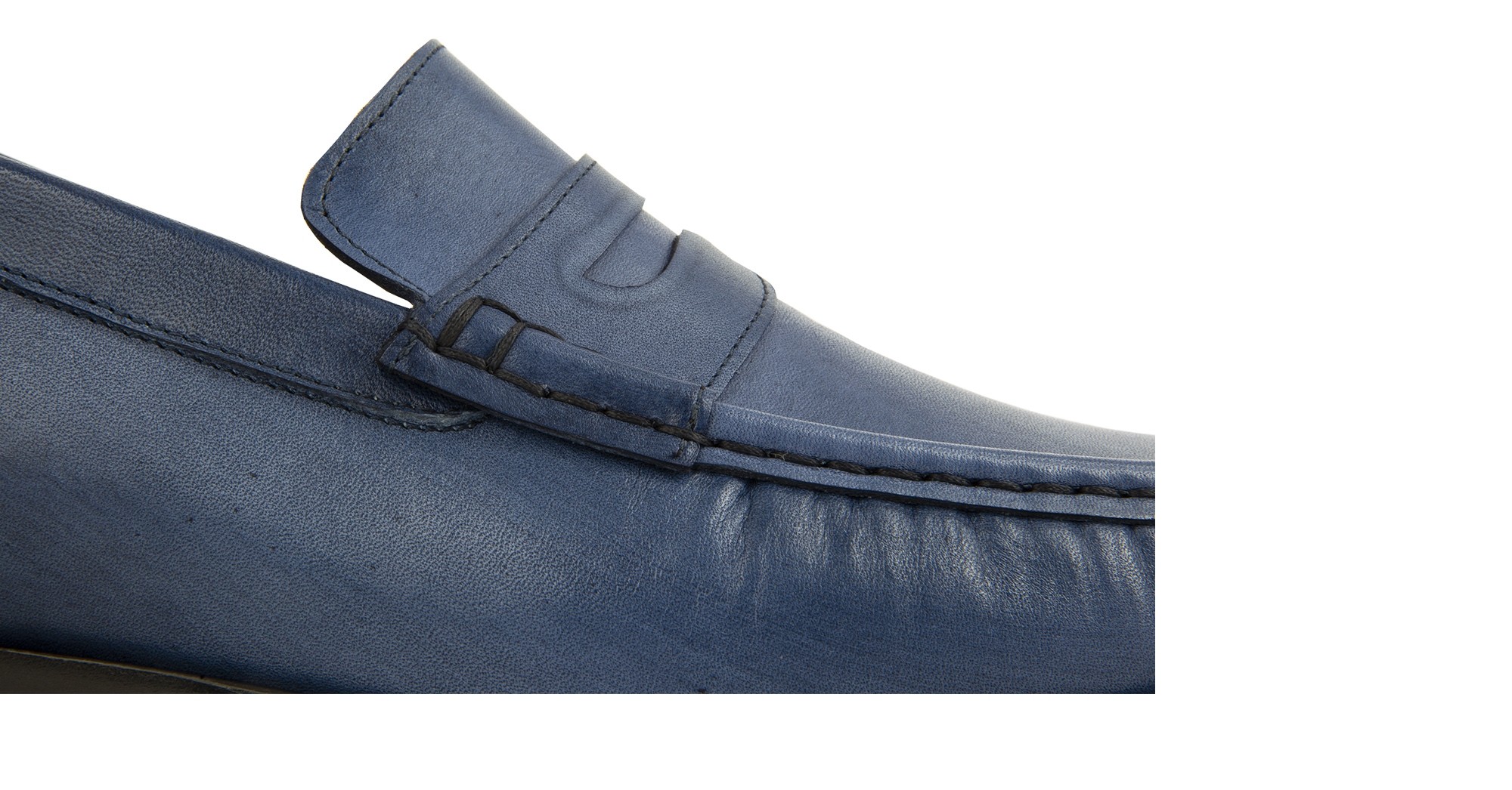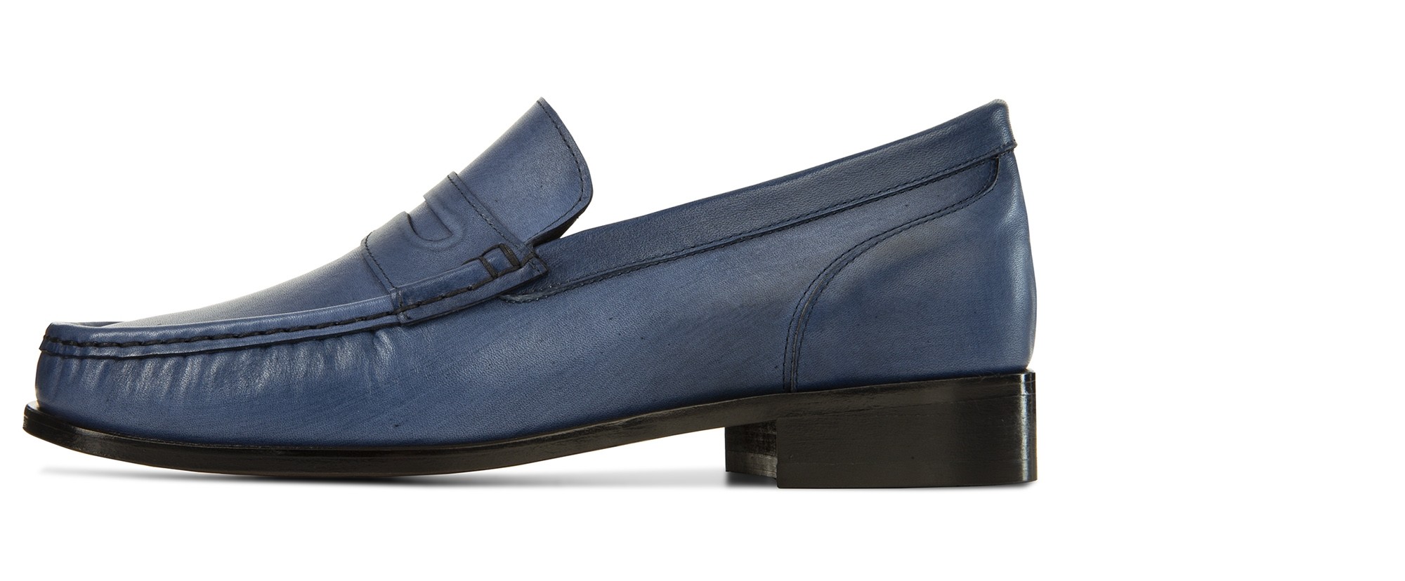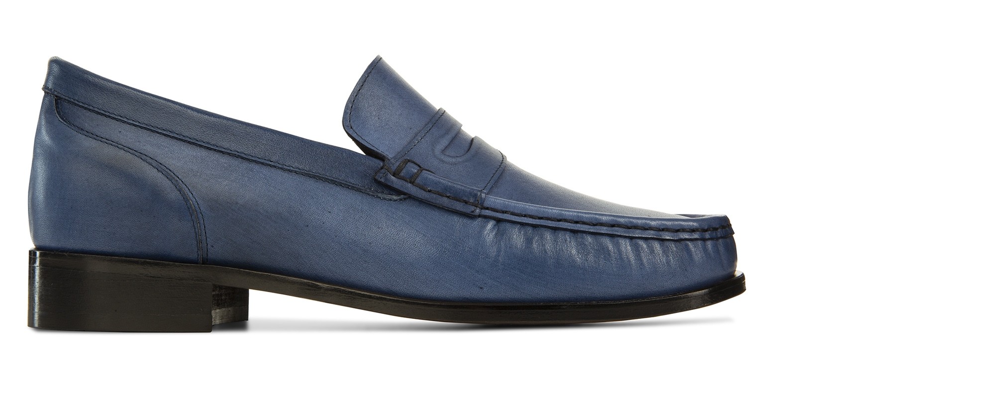 Upper in blue burnished full grain leather. Upper leather, outsole and midsole are sewn at sight. Insole and midsole in genuine leather. Leather heel with special anti-slip rubber. Handcrafted leather outsole with special anti-slip. Height increase: 2.6 in(6.5cm). Hand Made in Italy